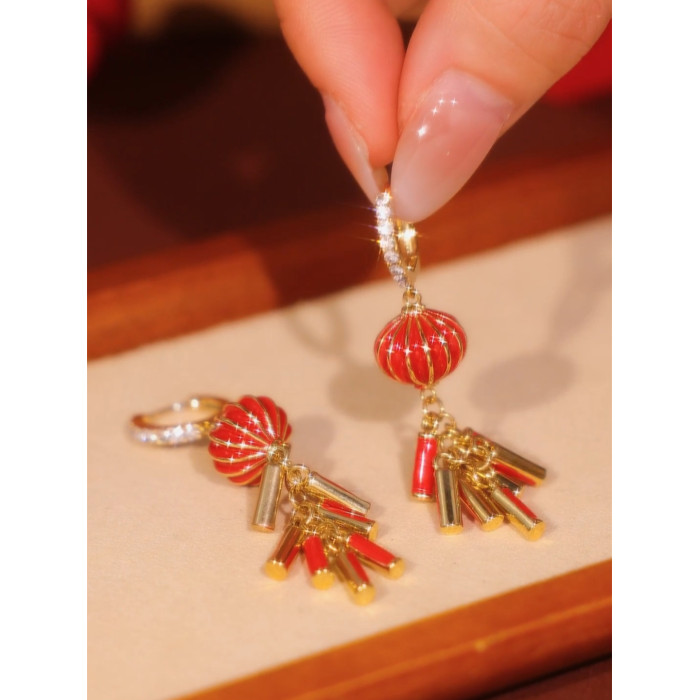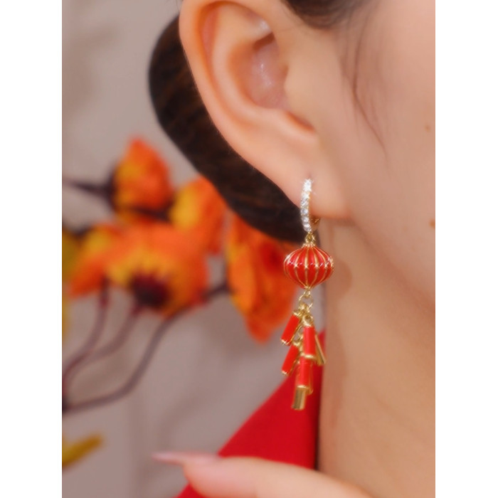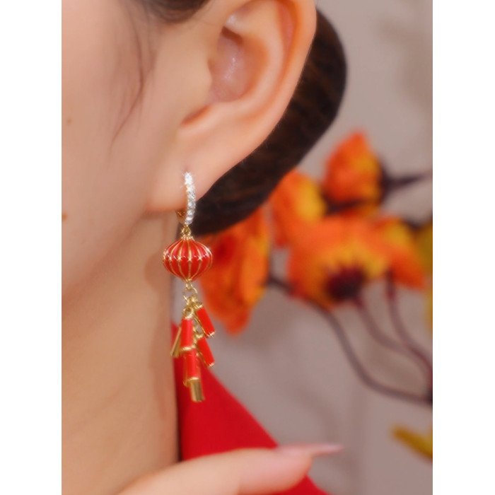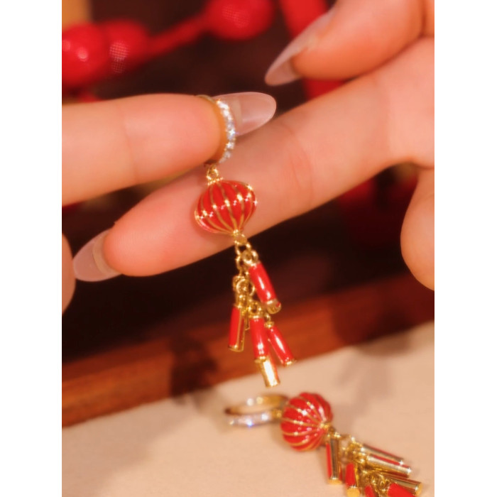 長款流蘇燈籠鞭砲耳釦耳環女設計感網紅百搭耳飾圓臉大臉新年耳墜