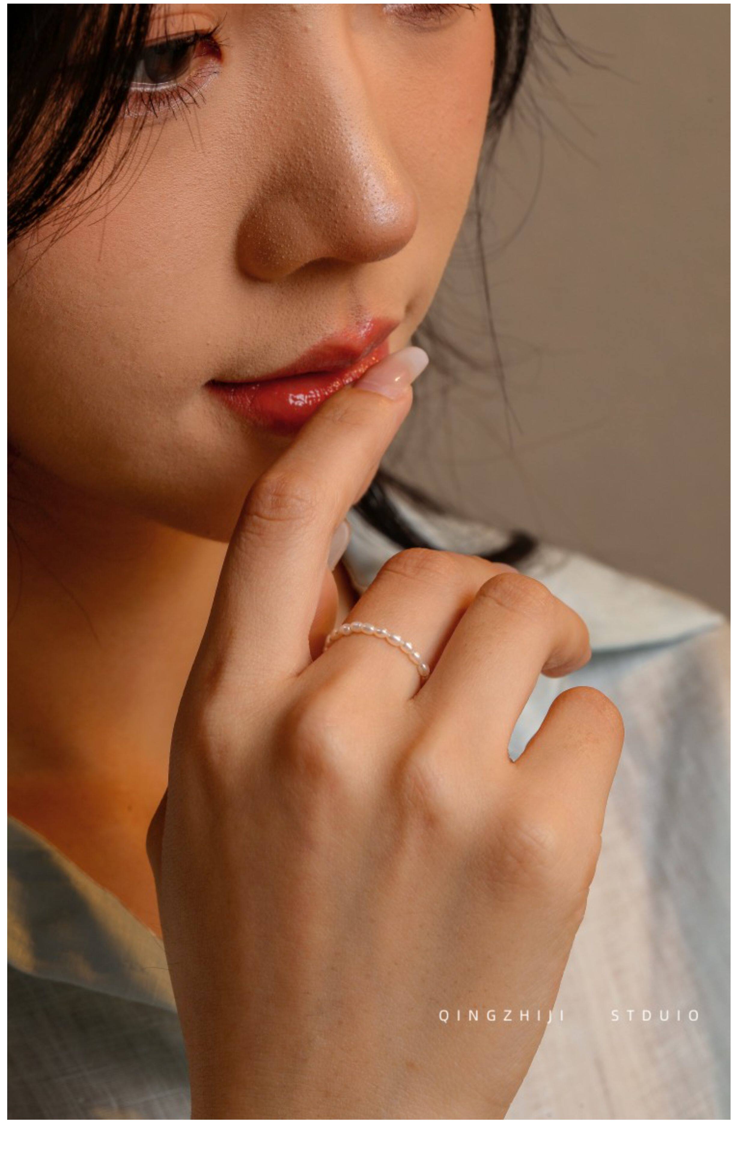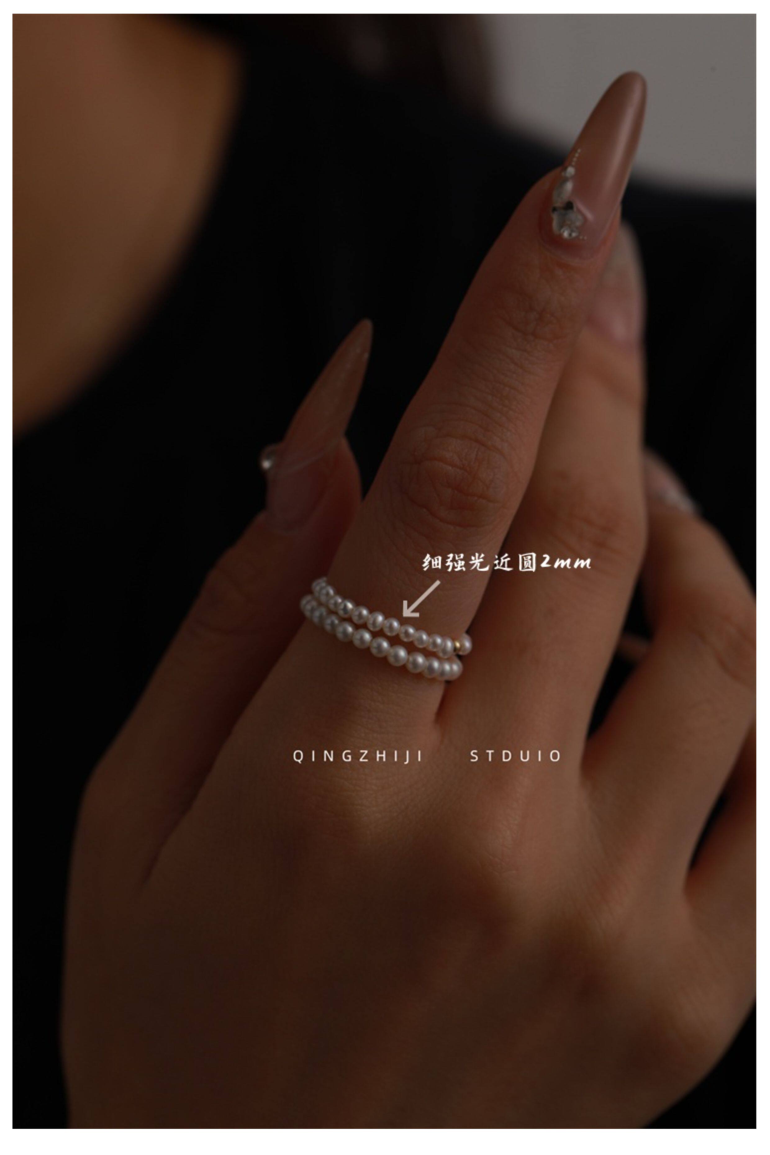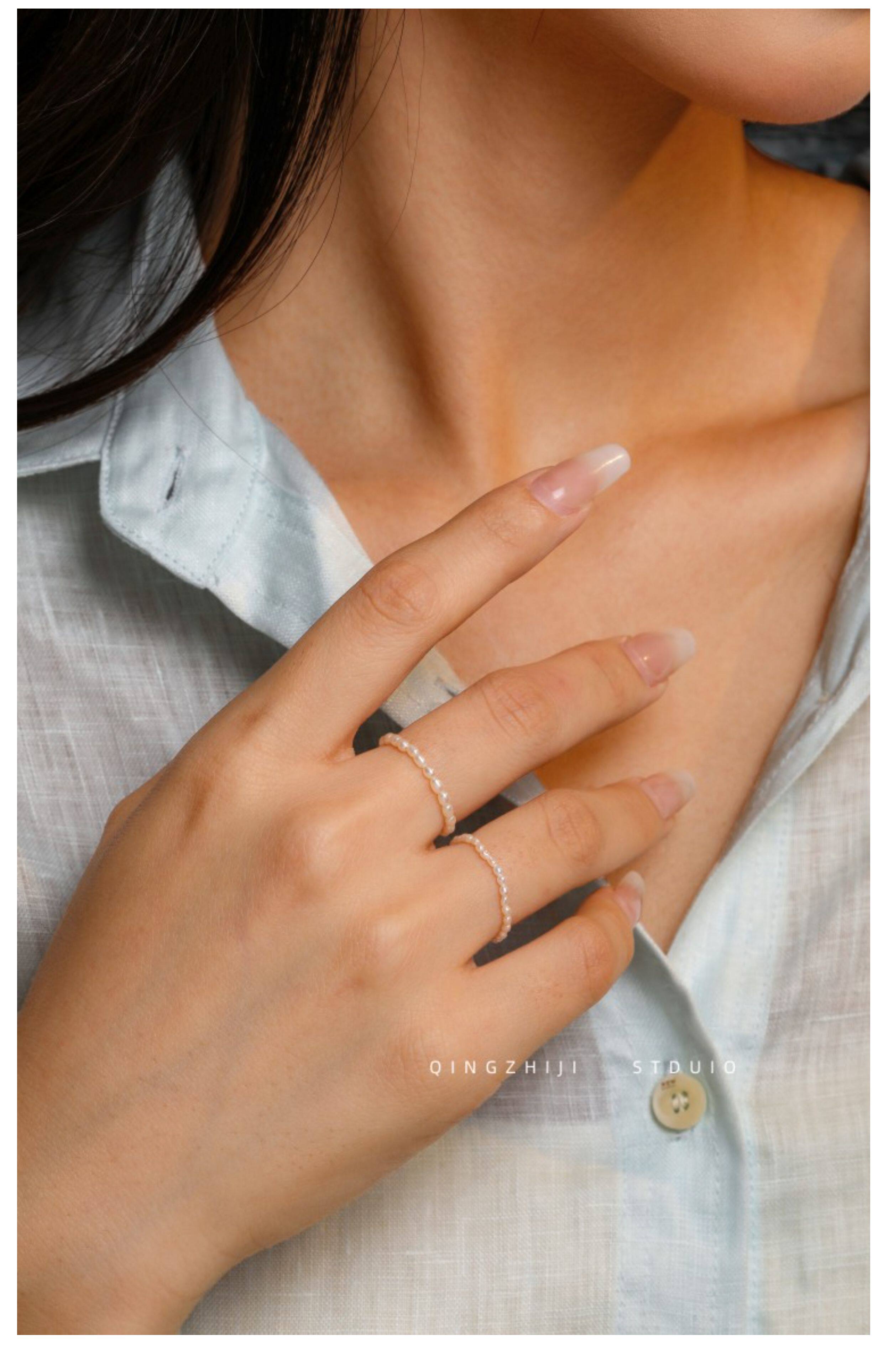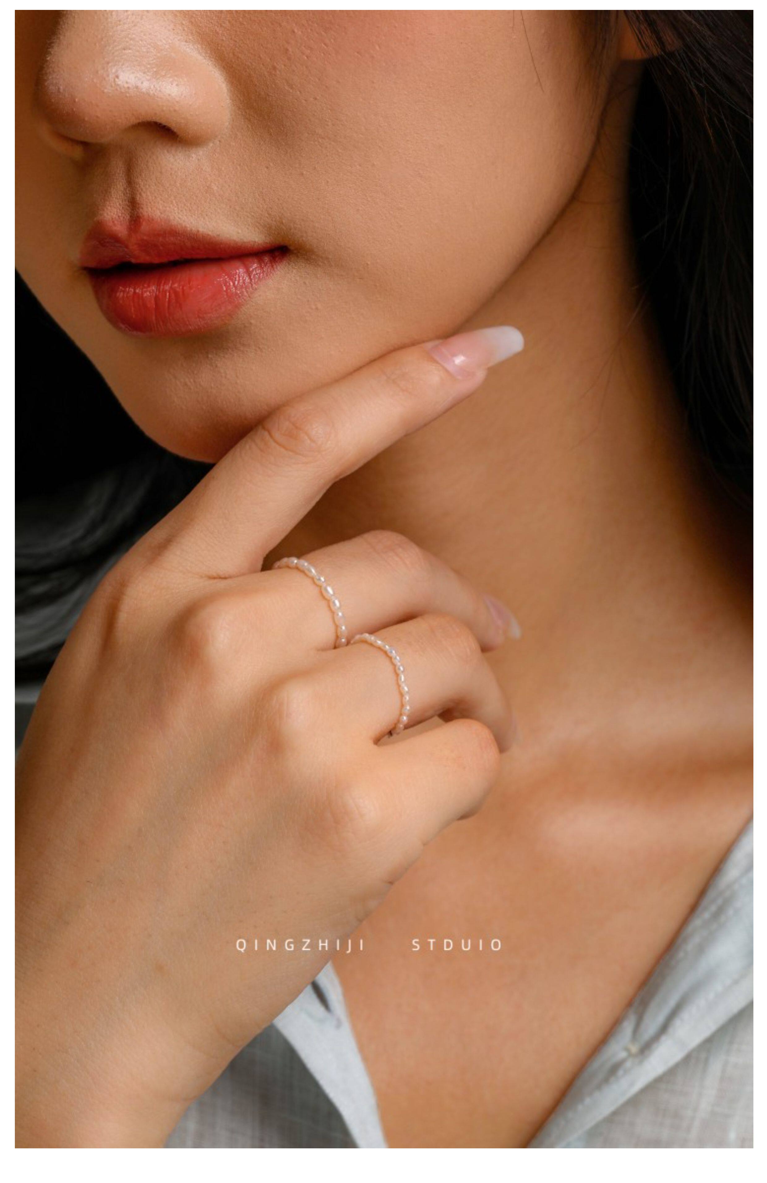 強光淡水養殖超小米粒珍珠戒指女全網zui細純手工製作彈力繩戒指