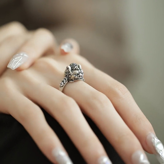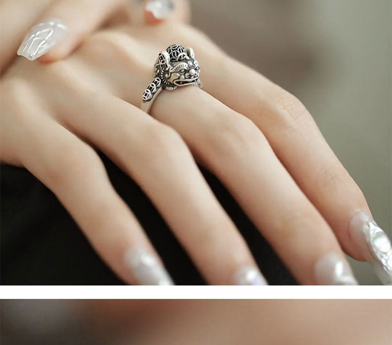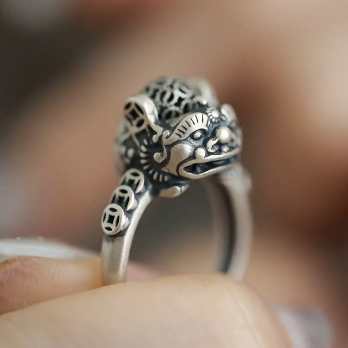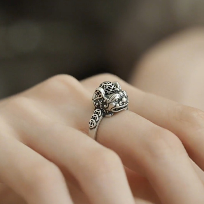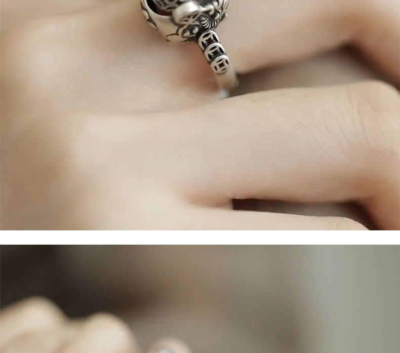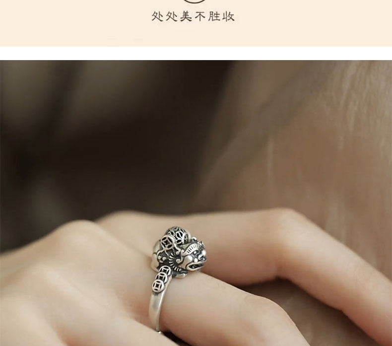 銅錢貔貅S925銀戒指女士設計感小衆復古做舊國風招財轉運活口指環