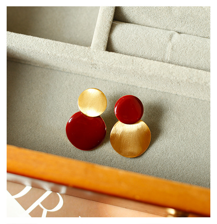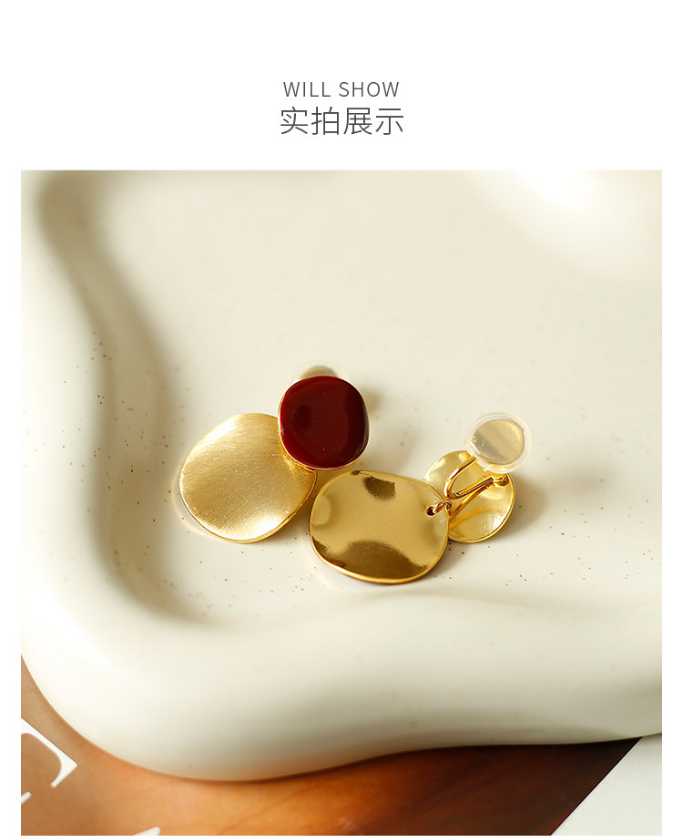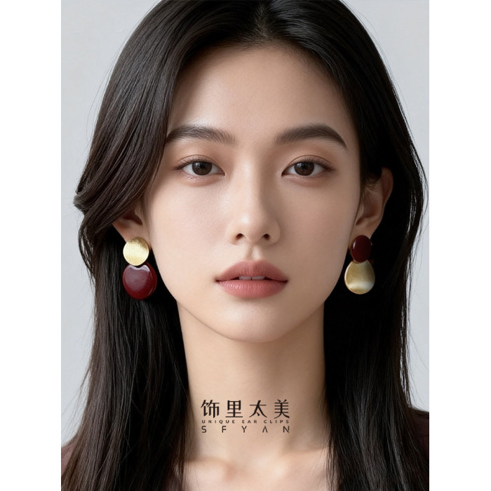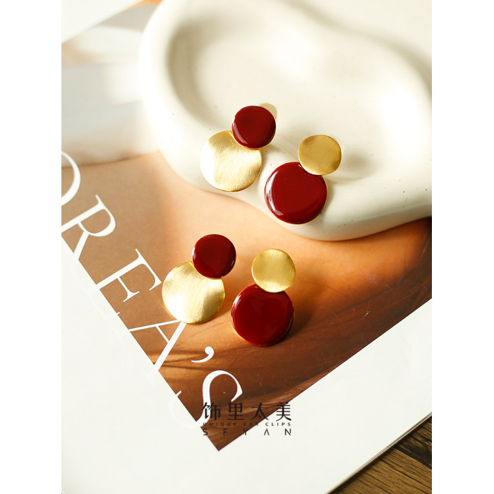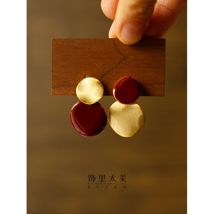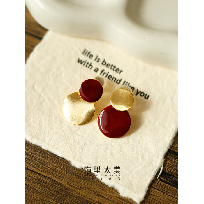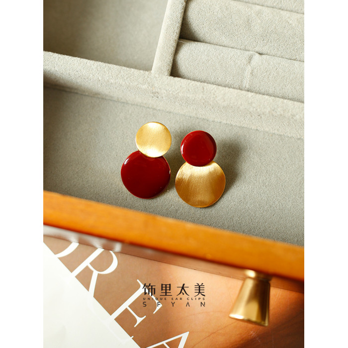秋冬氛圍感拉絲啞光紅色圓盤耳夾小衆設計感方圓臉氣質無耳洞耳飾