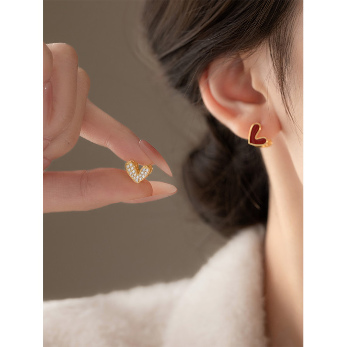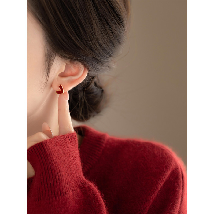 安可拉紅色滴釉愛心微鑲鋯石雙面耳釘女氣質高級感耳環時尚耳飾品