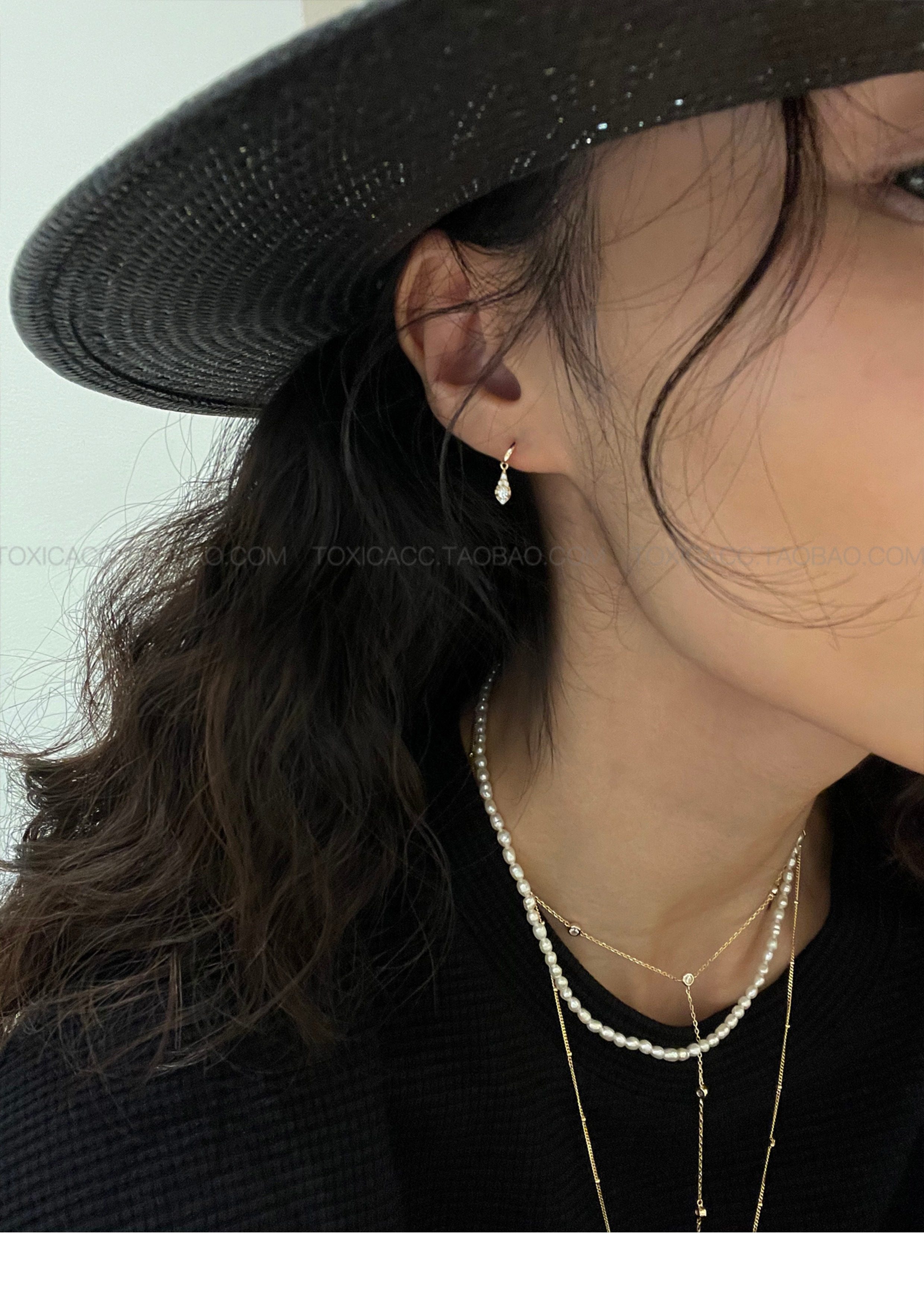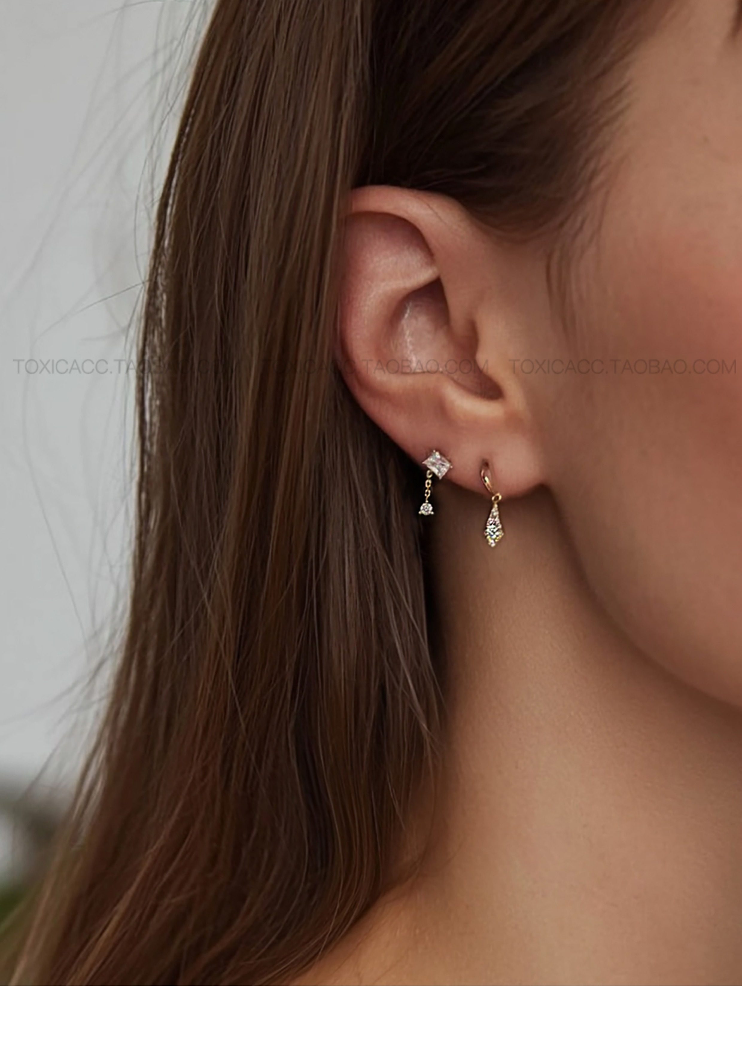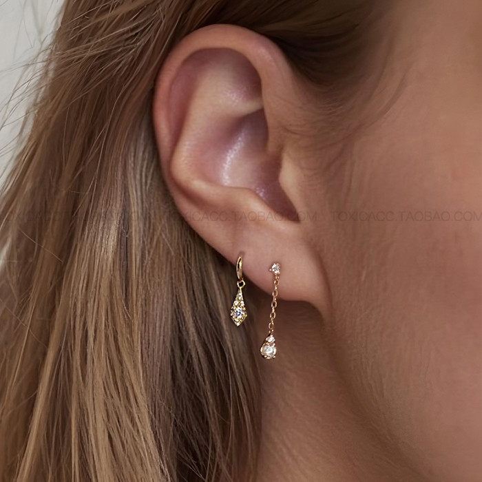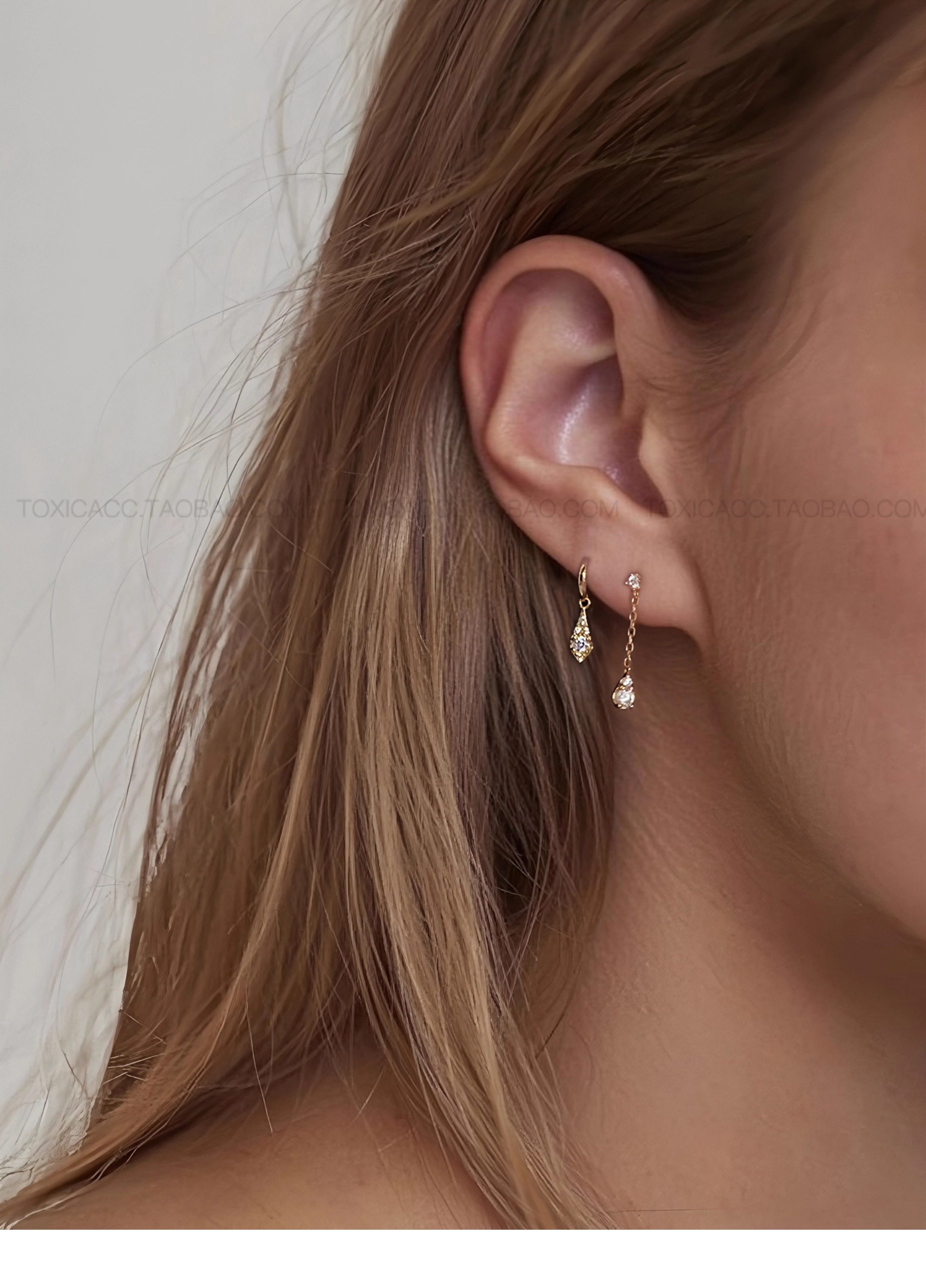 「朝露」TOXIC設計師款金色鑲鑽水滴925銀迷你精緻鏈條吊墜耳釘
