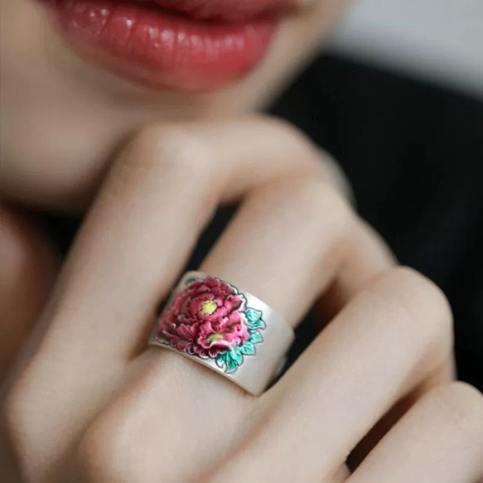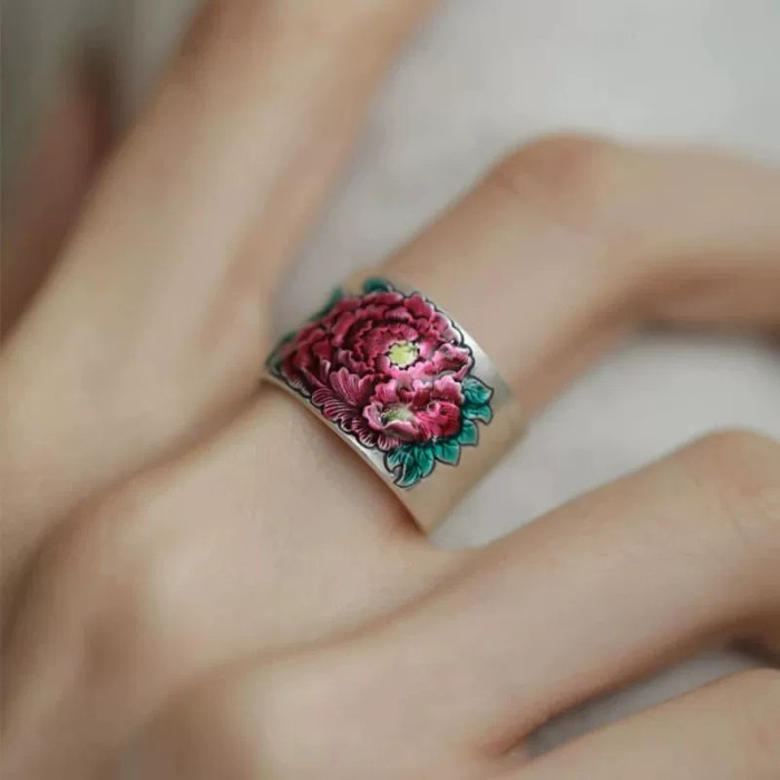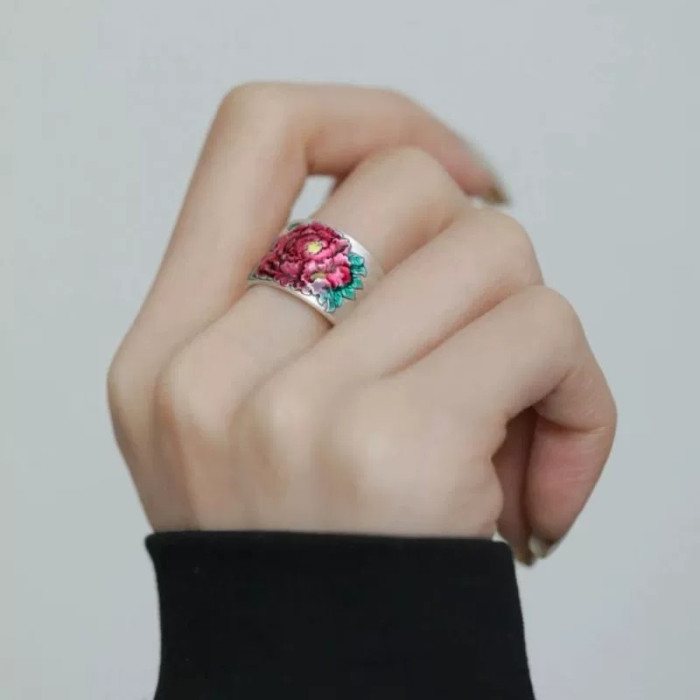 925銀復古新中式琺瑯滴釉牡丹花戒指環開口調節女民族風小衆設計