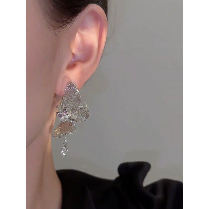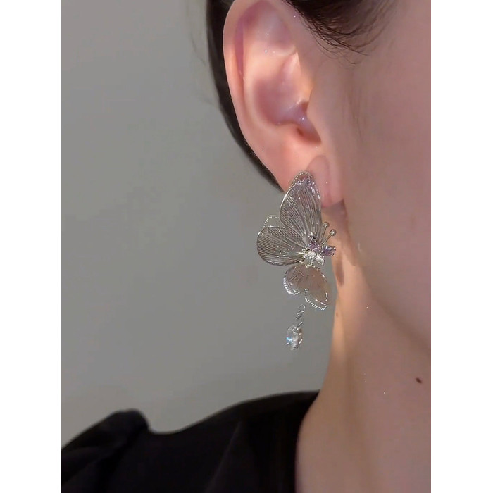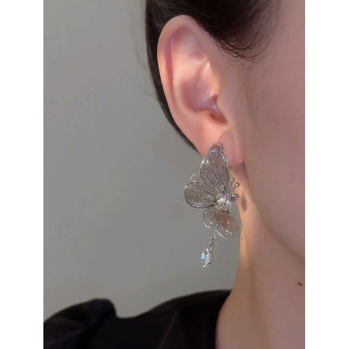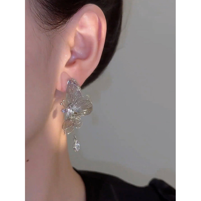 鏤空立體銀色蝴蝶吊墜耳環氣質個性設計感長款流蘇耳飾銀針耳釘女