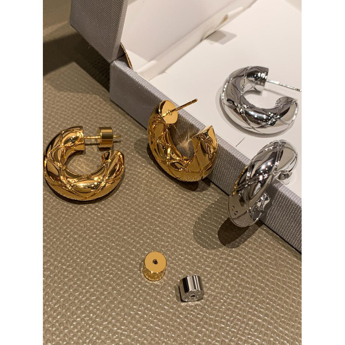 S925銀針金屬菱格紋圓圈耳環女輕奢高級感小衆獨特耳圈秋冬耳飾品