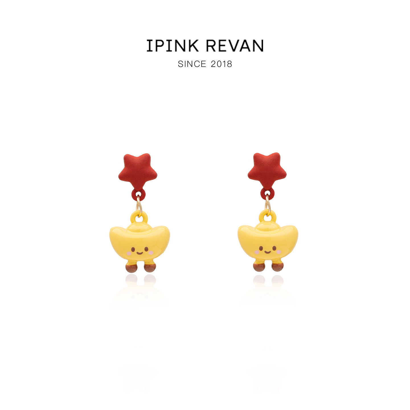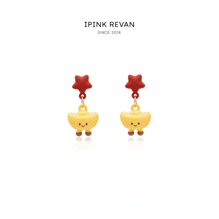 IPINK新年可愛星星金元寶耳環萌趣卡通個性耳飾喜慶紅色耳釘耳夾