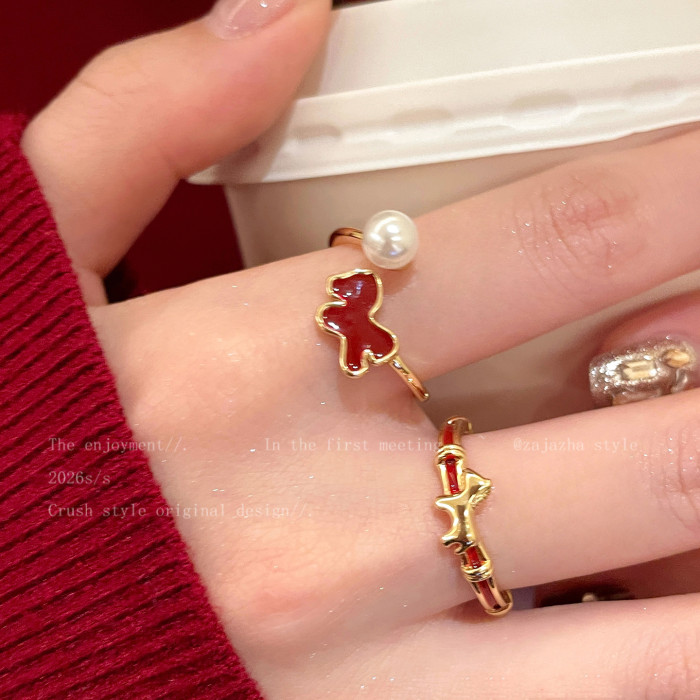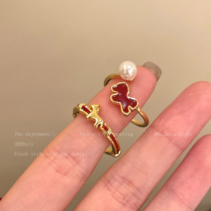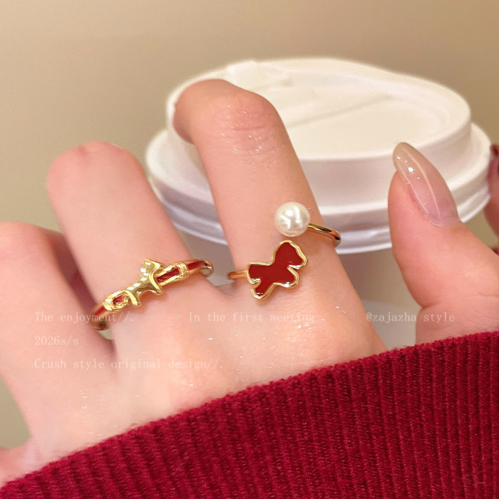 紅色小馬珍珠開口戒指女輕奢高級感曡戴食指戒馬年小衆設計感指環