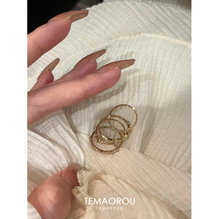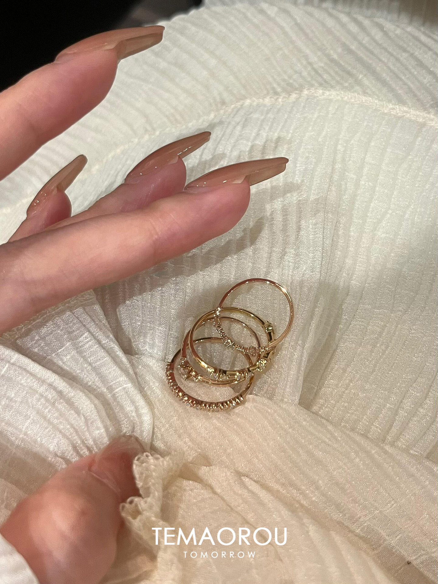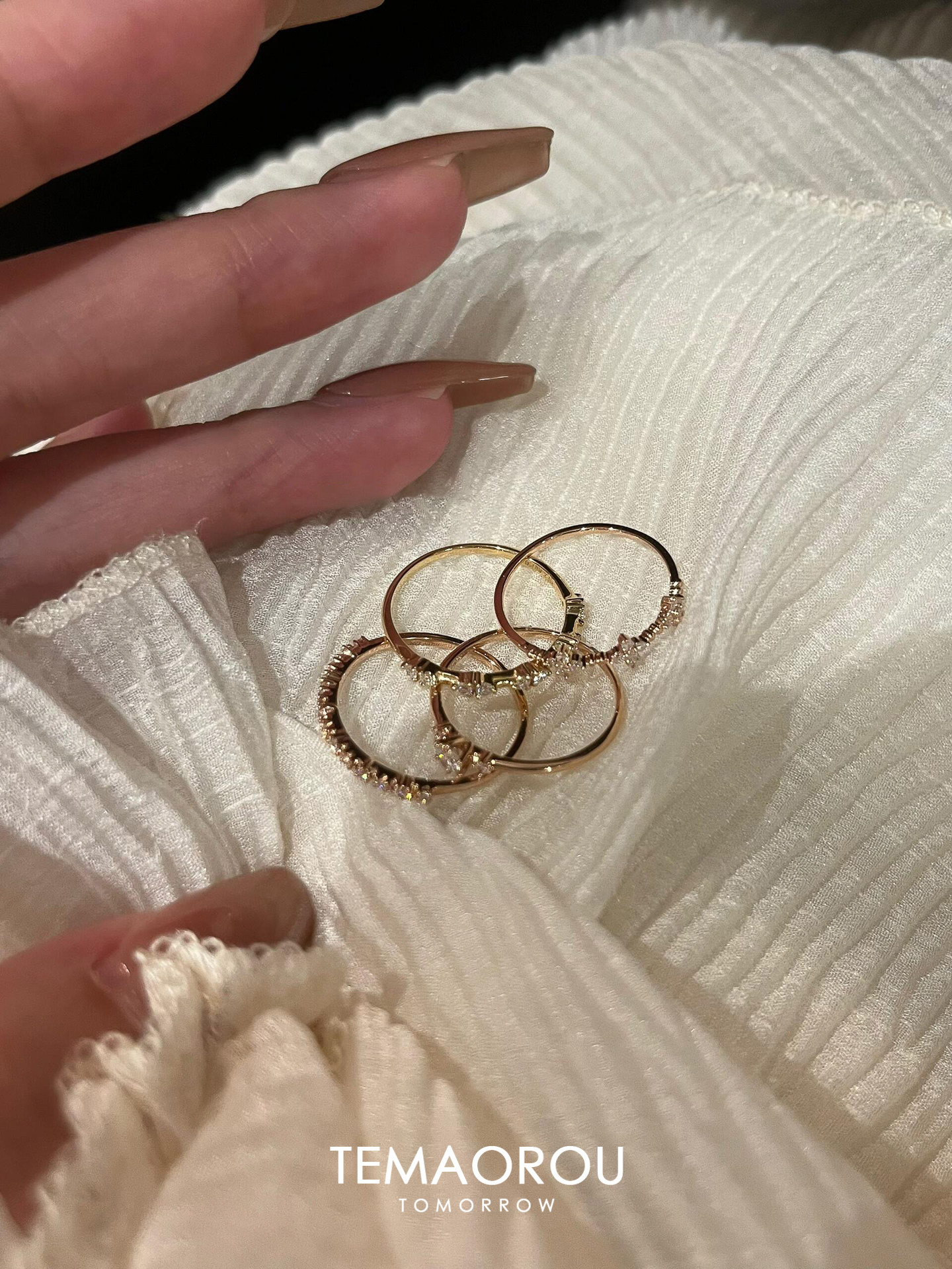 4隻曡戴組合!極細款k金排戒滿鑽素圈戒指女高級感百搭食指戒可調