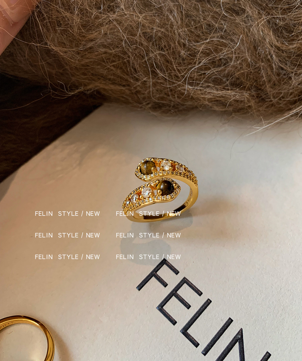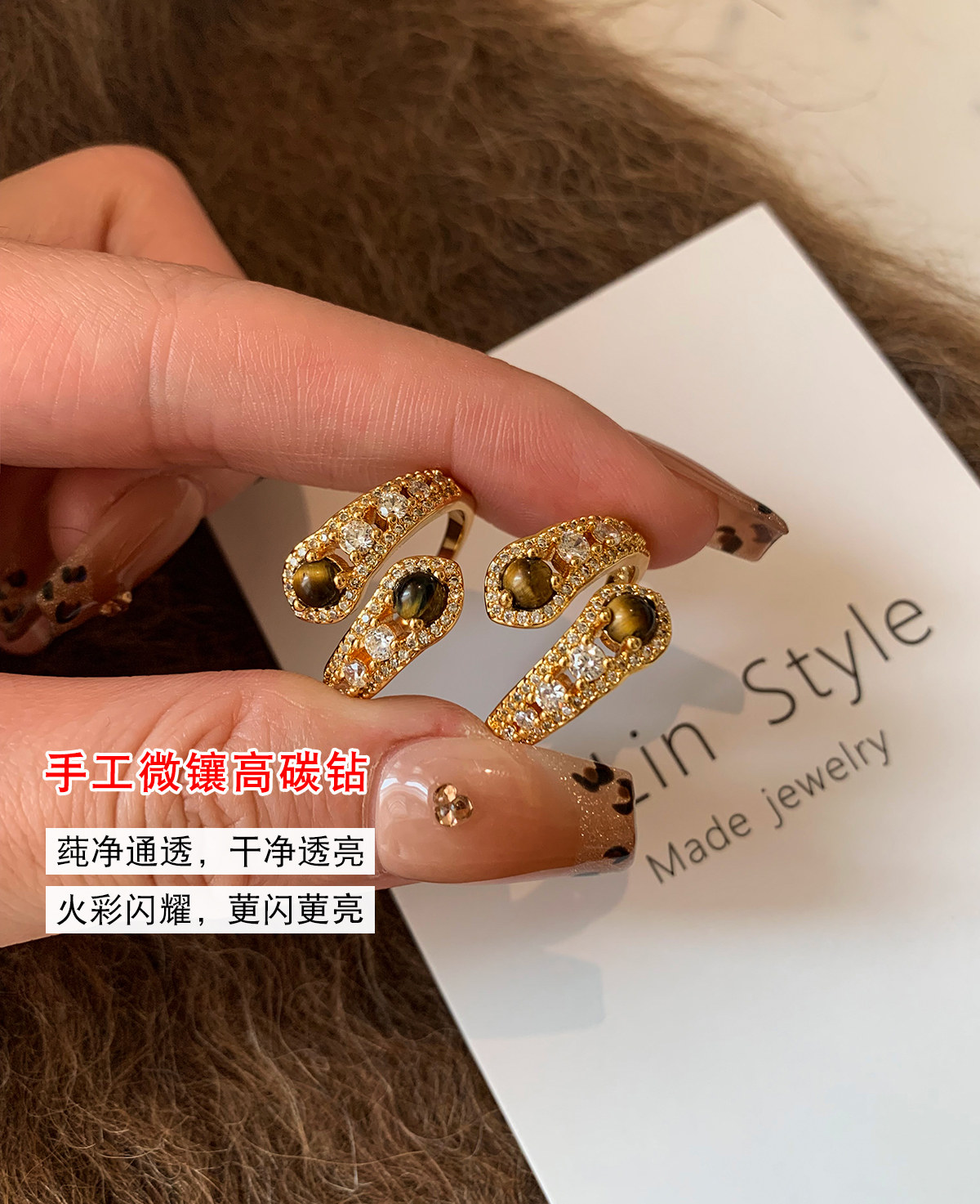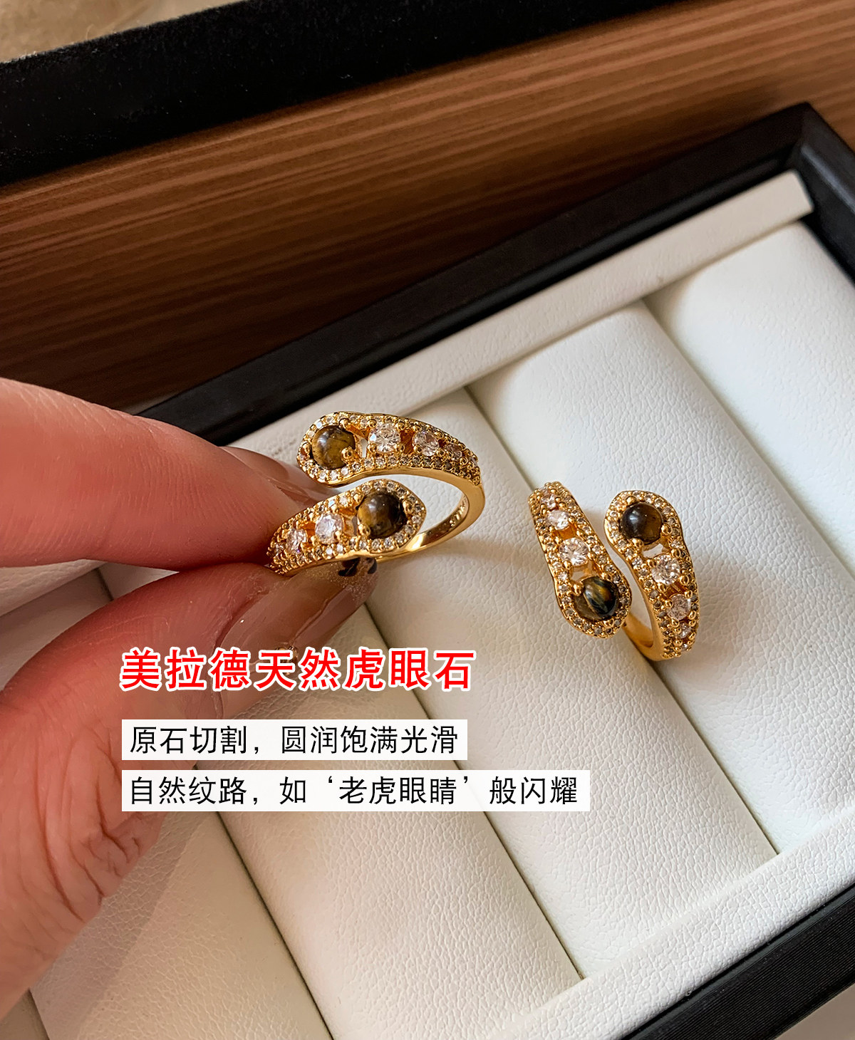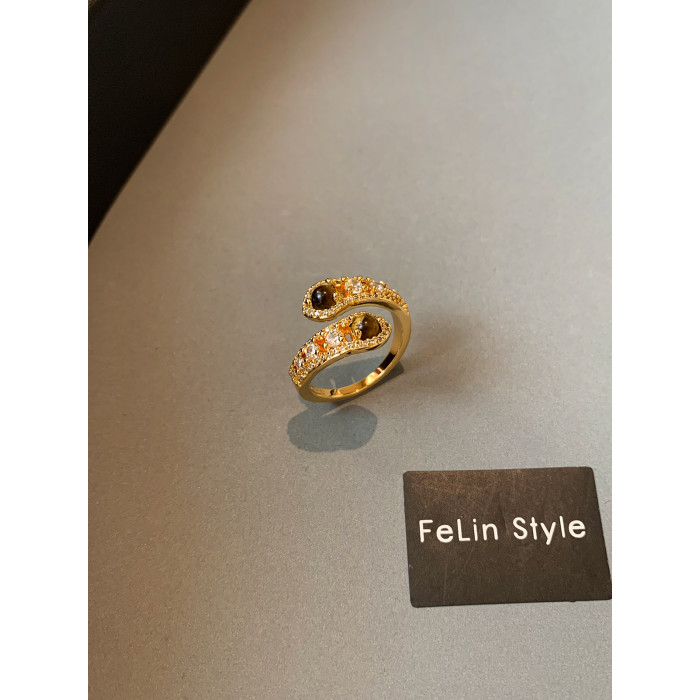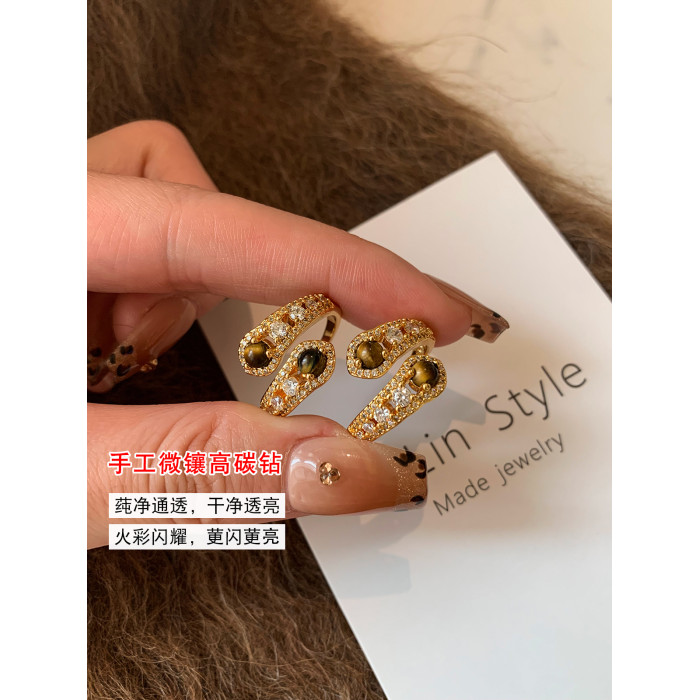 金色鑲鑽虎眼石開口食指中指戒指女小衆設計輕奢高級感指環美拉德