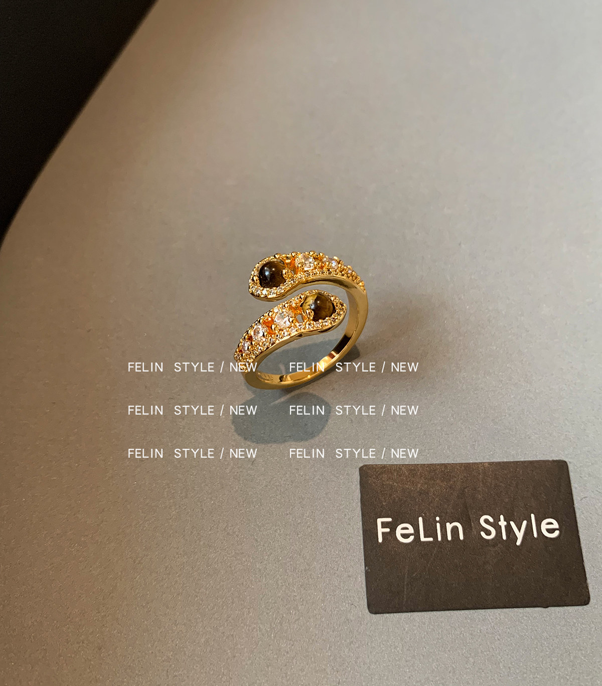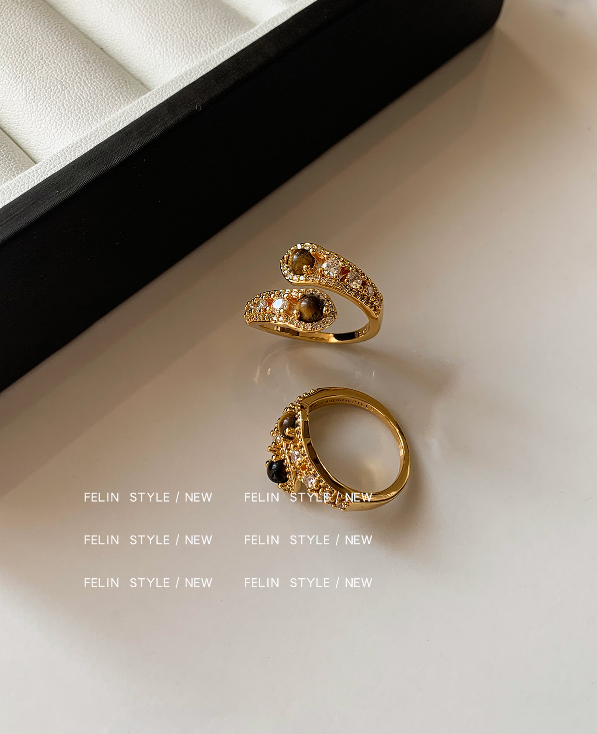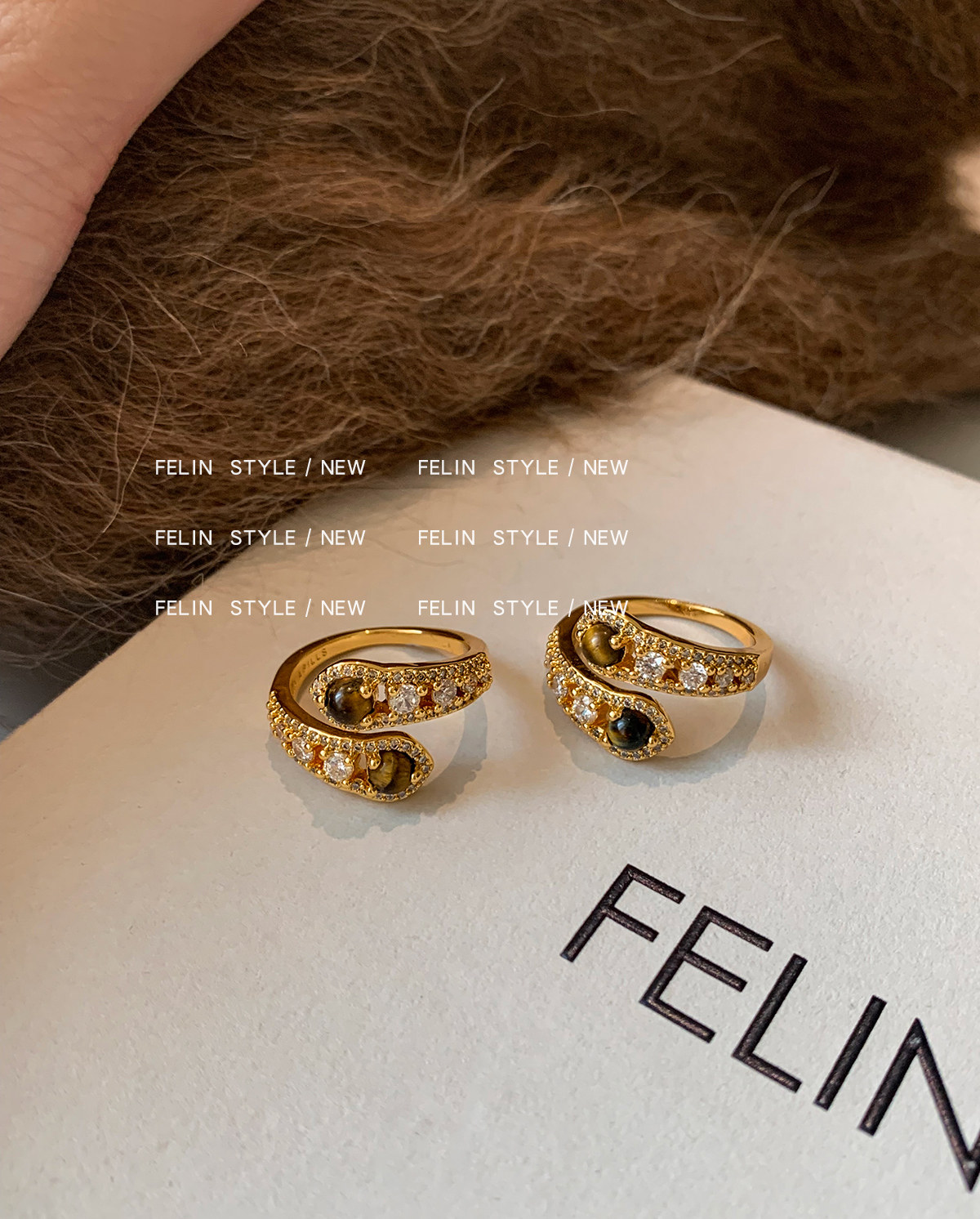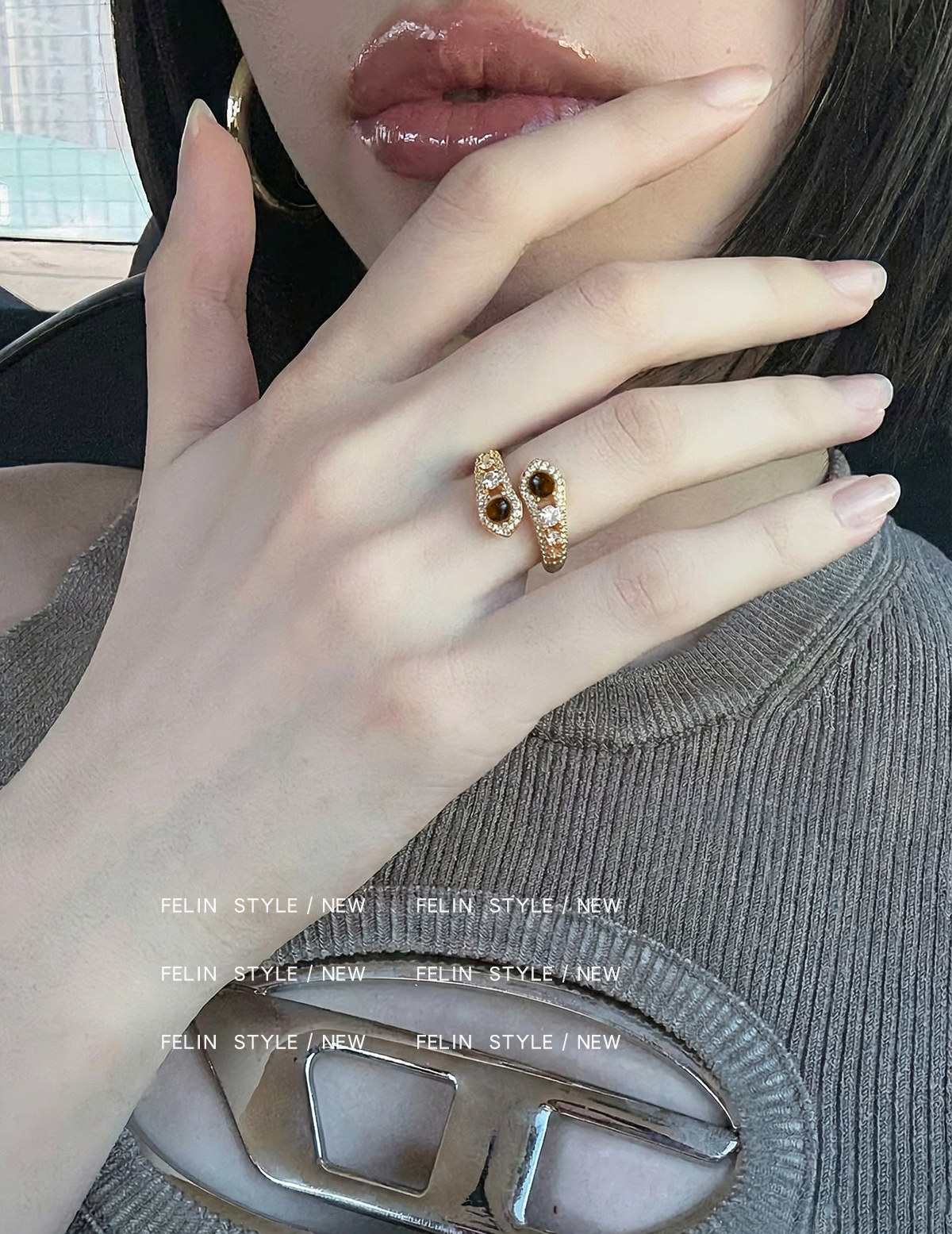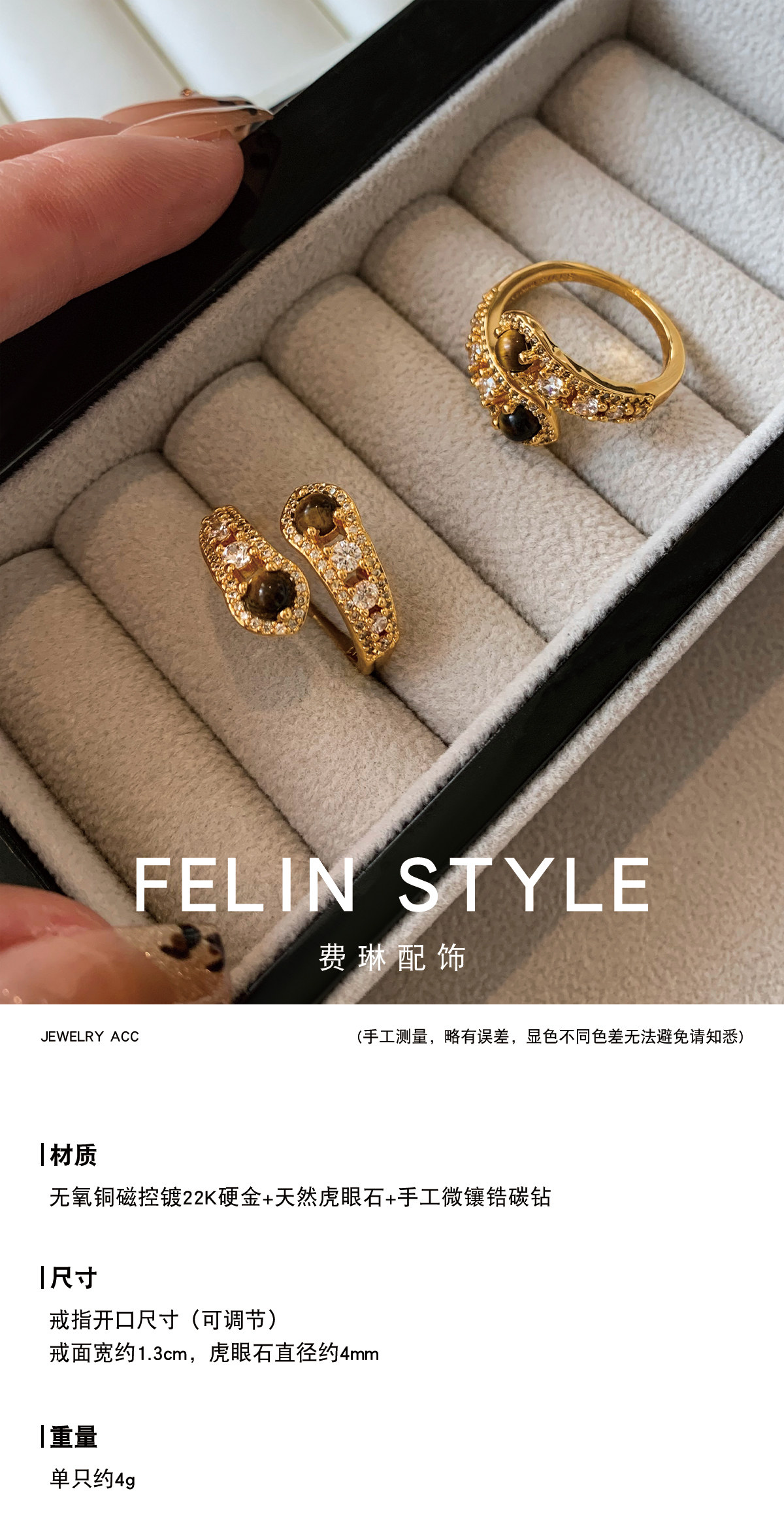 金色鑲鑽虎眼石開口食指中指戒指女小衆設計輕奢高級感指環美拉德