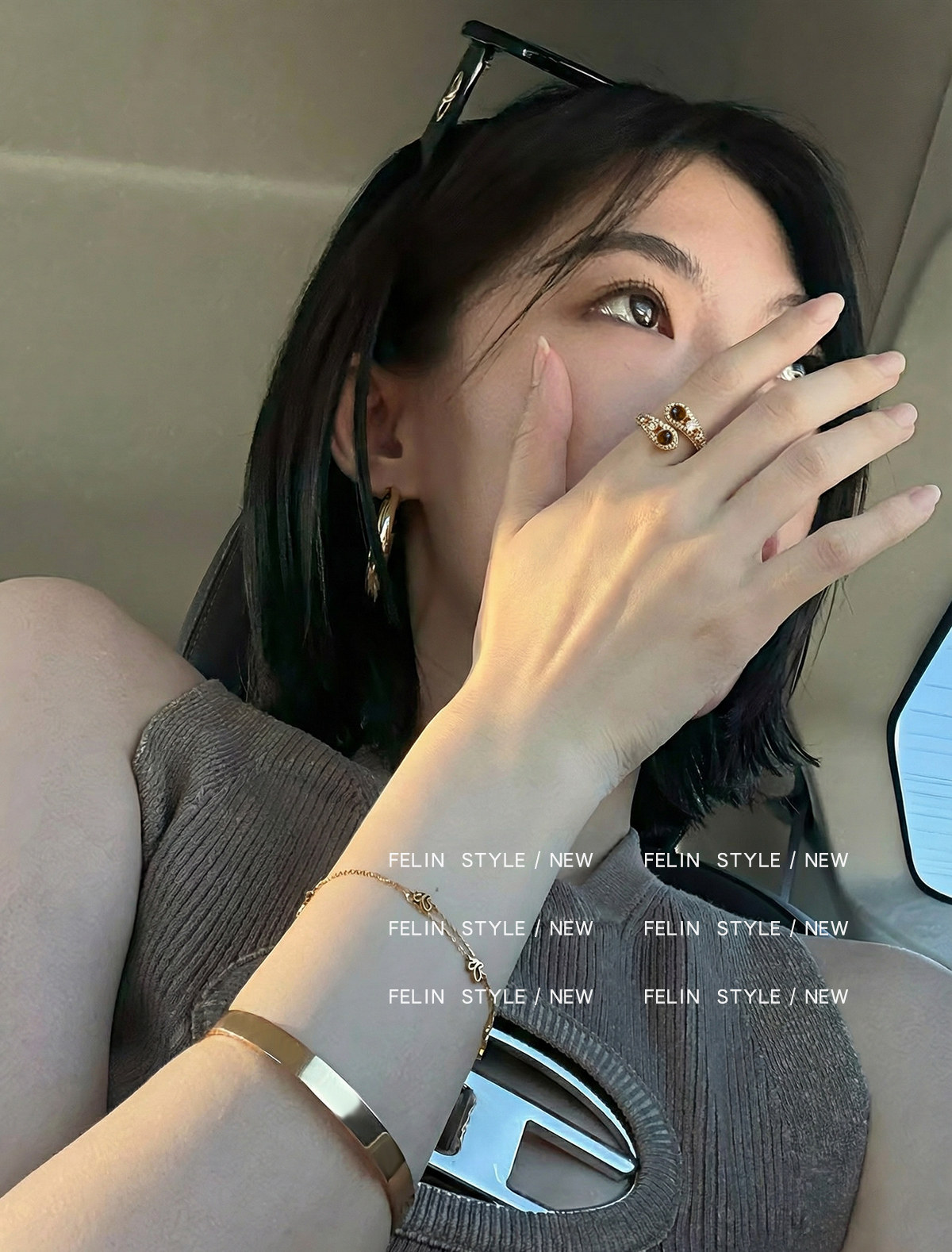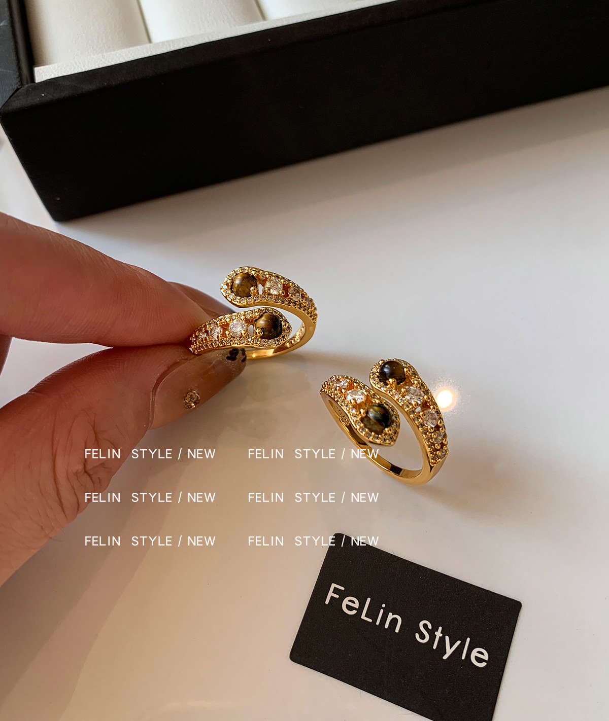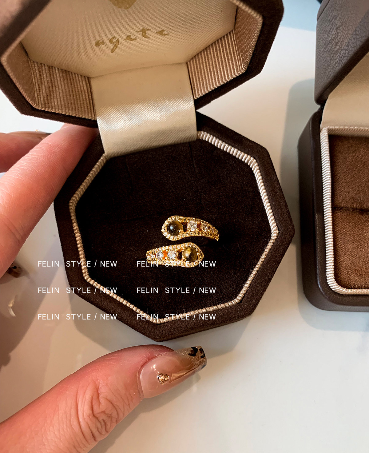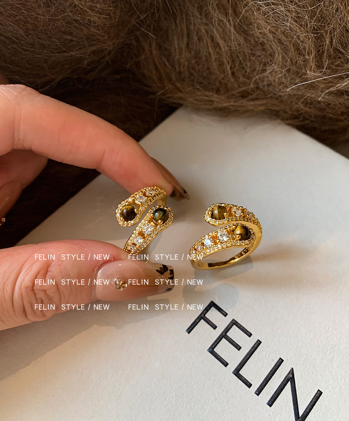 金色鑲鑽虎眼石開口食指中指戒指女小衆設計輕奢高級感指環美拉德