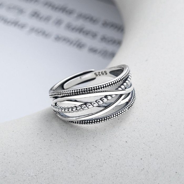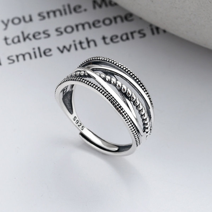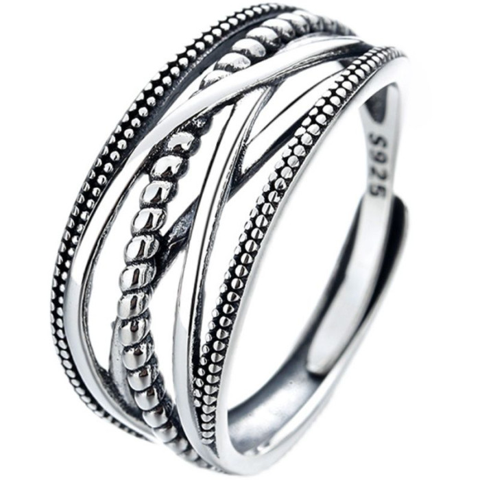 幾何交叉線條925銀戒指女復古做舊小衆高級不掉色開口指環
