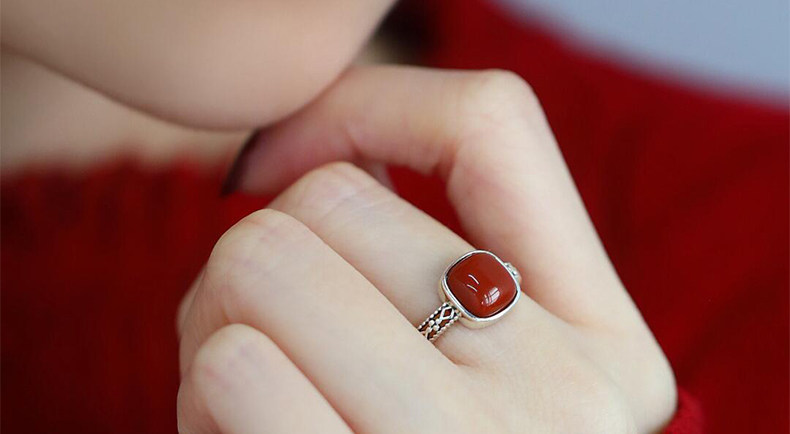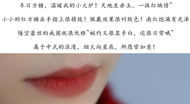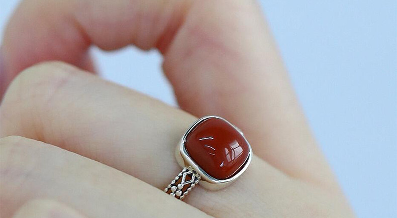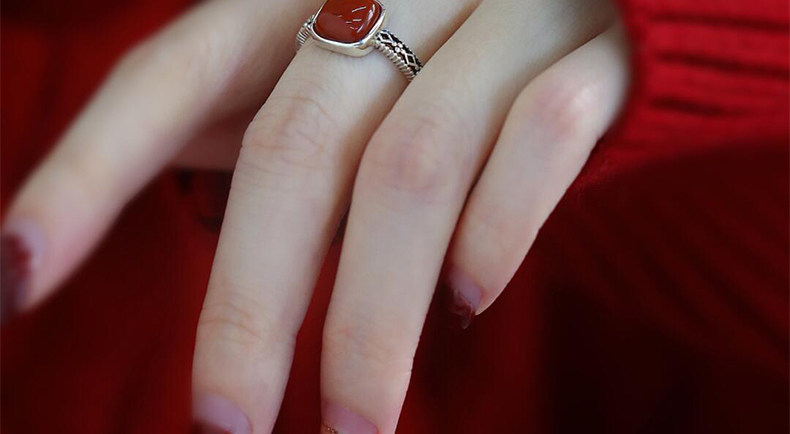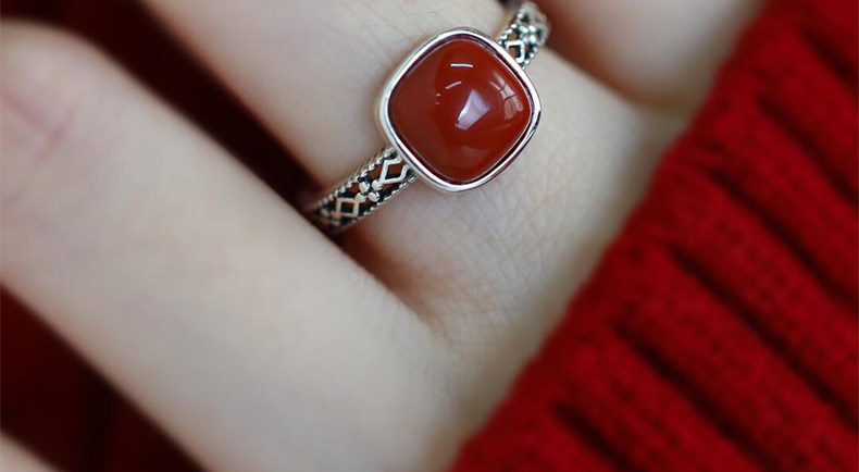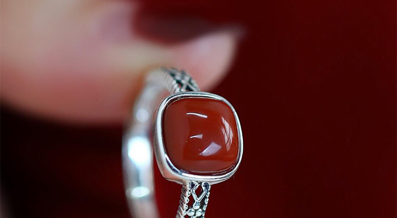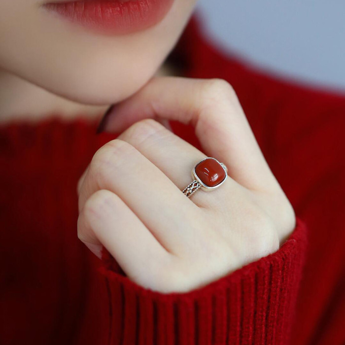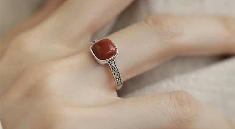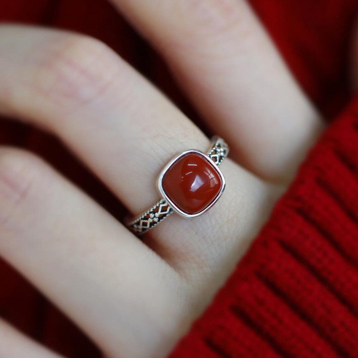 925銀復古新中式南紅方糖鏤空方形戒指環蕾絲開口調節簡約高級感