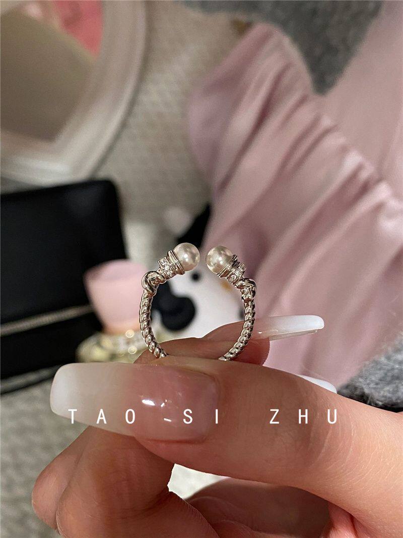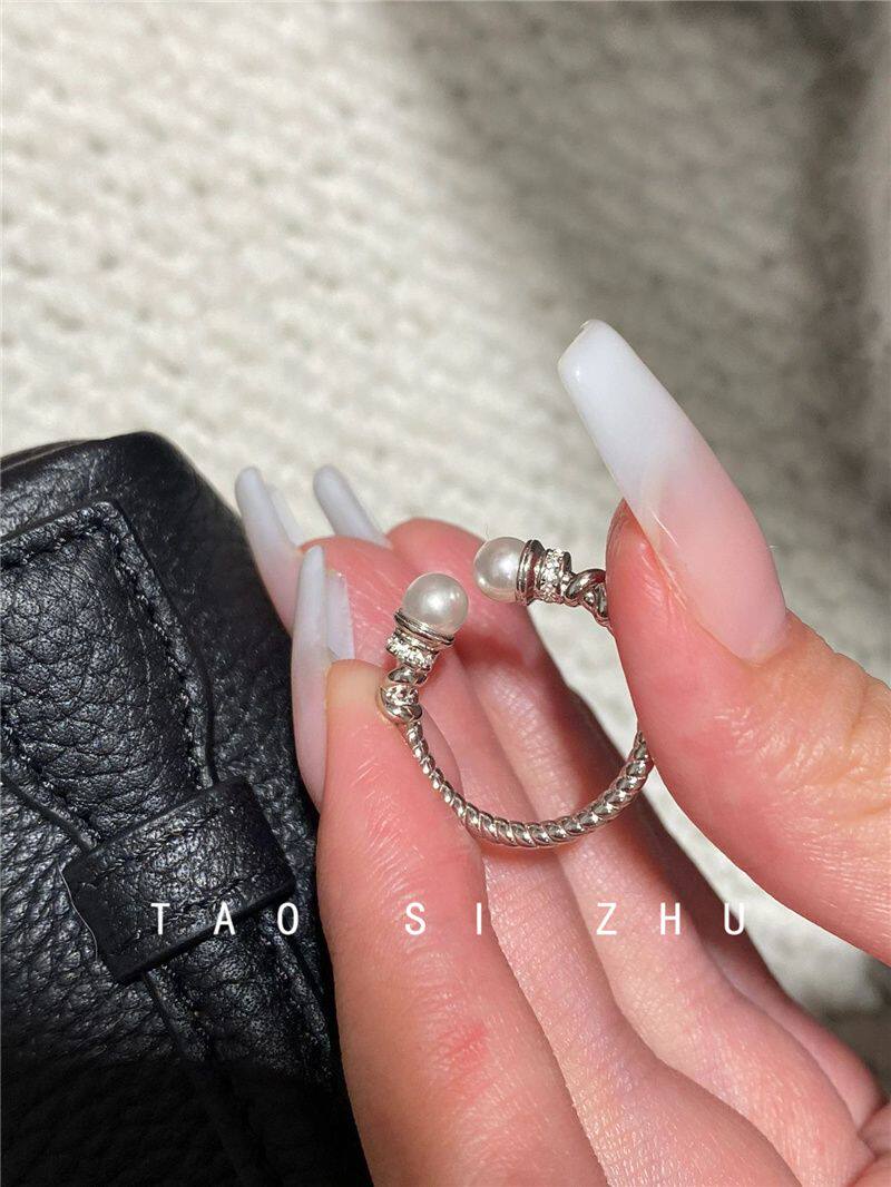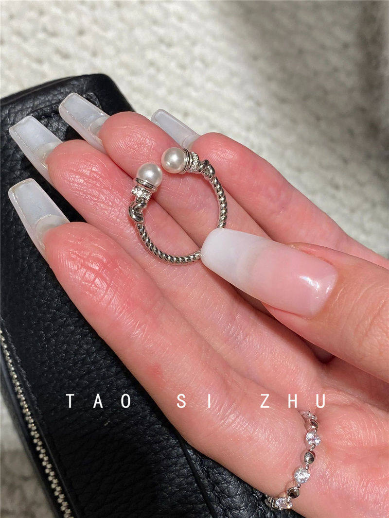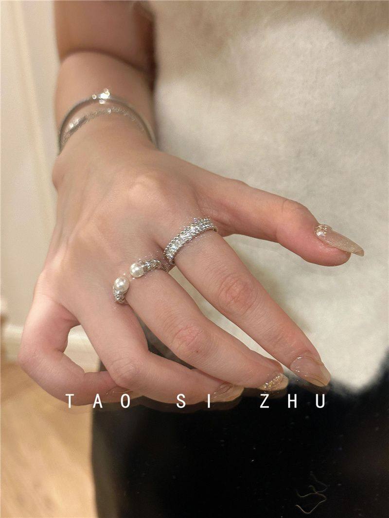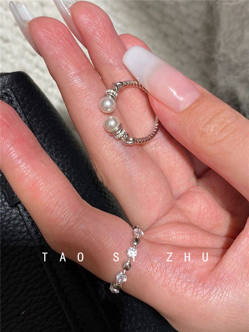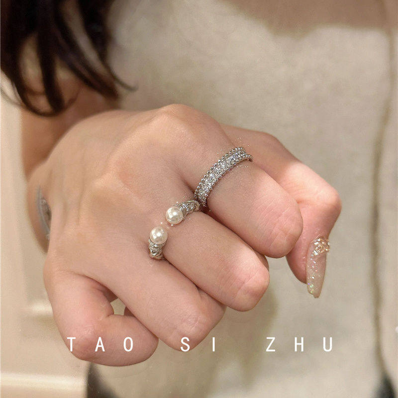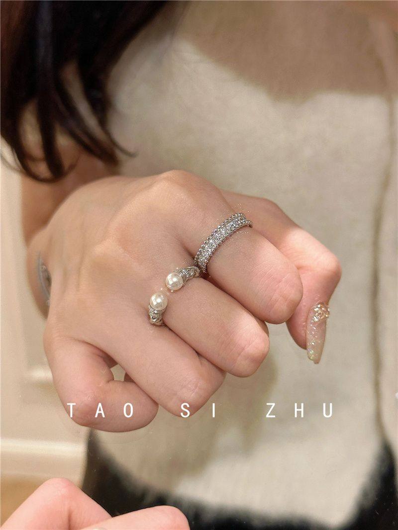 高級感氣質麻花珍珠開口戒指秋冬輕奢時尚全鑽寬款指環