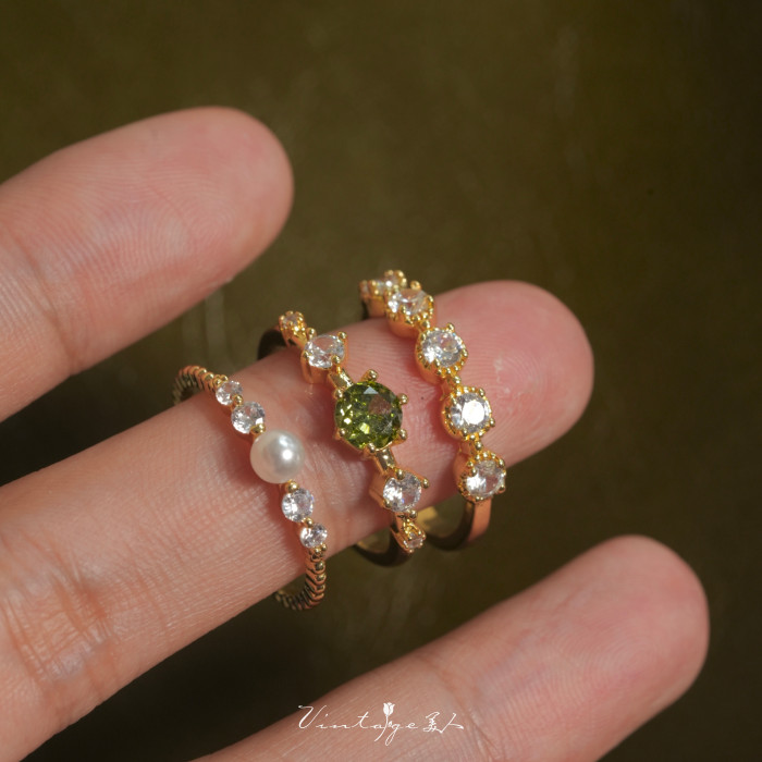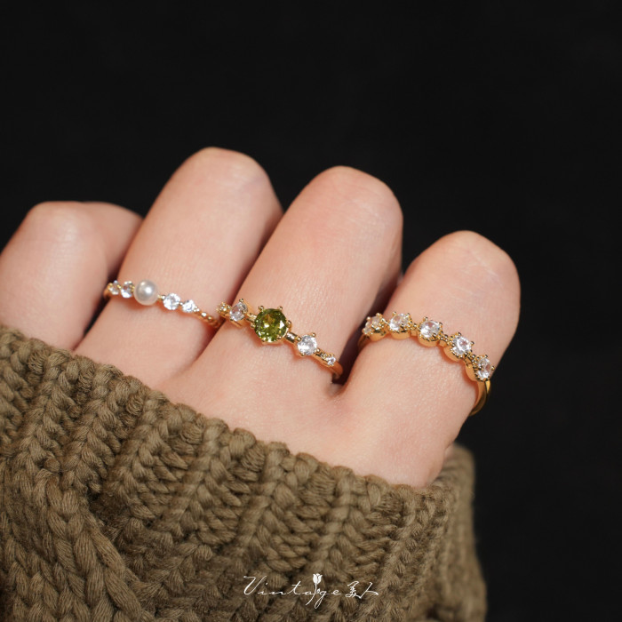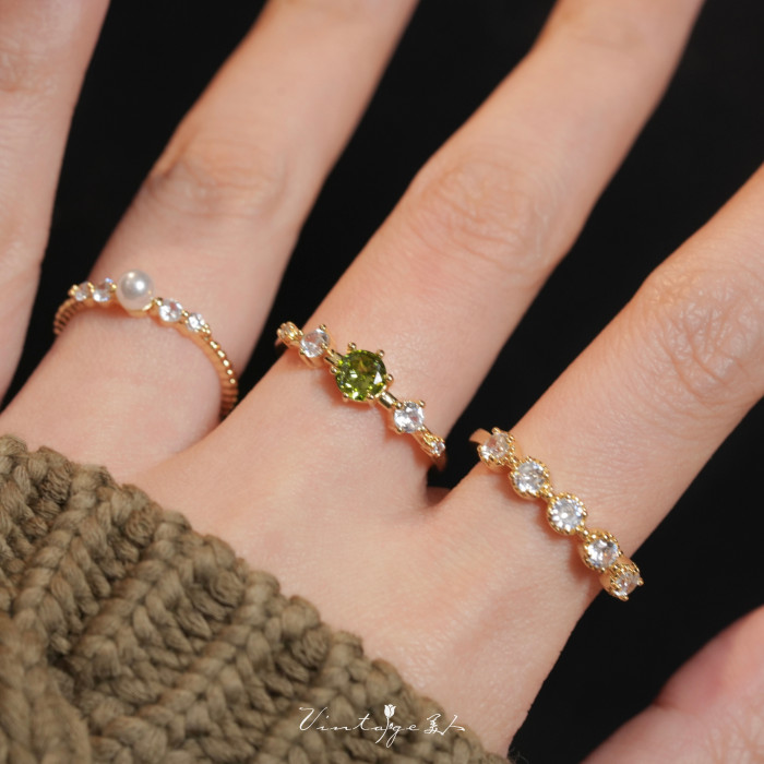 「萊茵月光」法式簡約高級感設計百搭包金小巧橄欖綠珍珠開口戒指