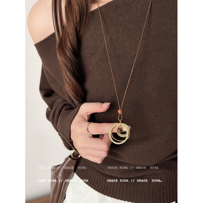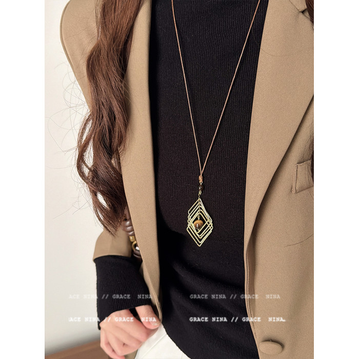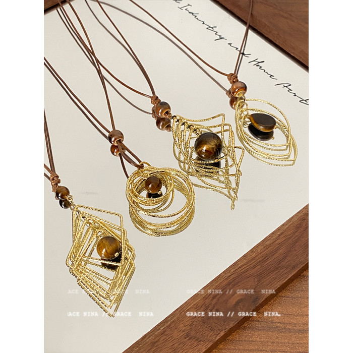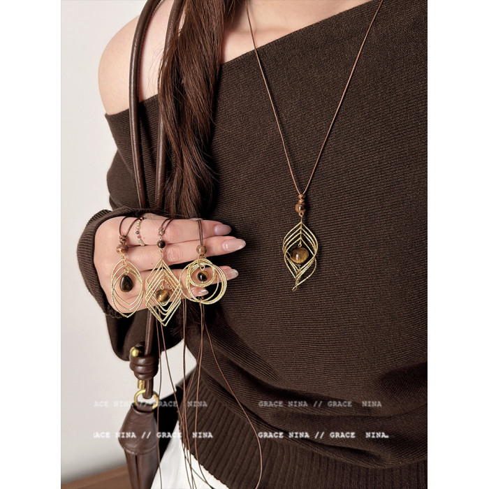 復古輕奢美拉德金屬線纏繞虎眼石吊墜項鍊女長款毛衣鏈配飾高級感