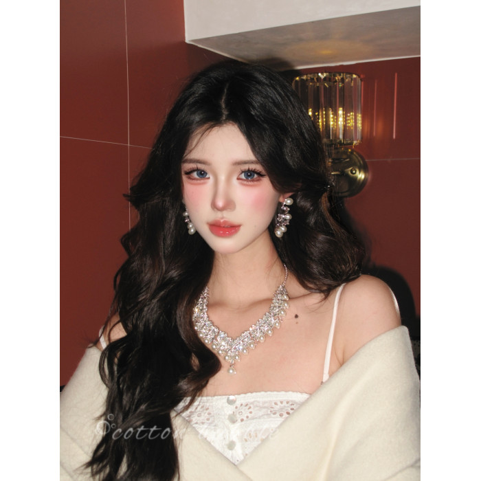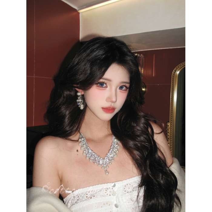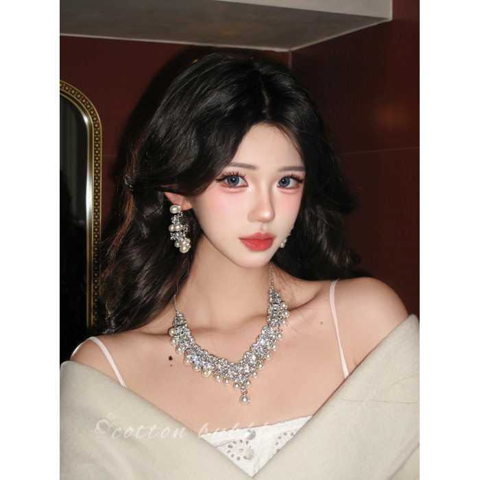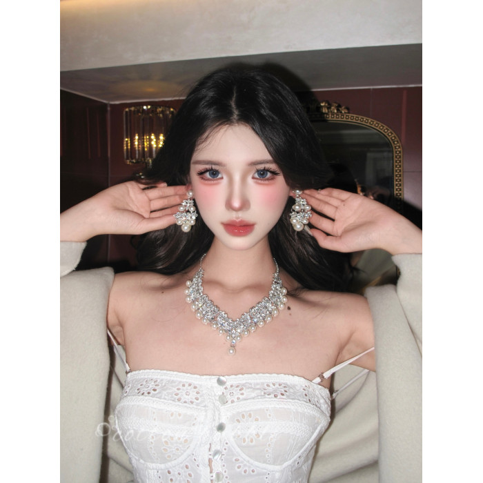 法式鑲鑽珍珠項鍊晚禮服誇張配飾耳環套裝女高級感生日新娘鎖骨鍊