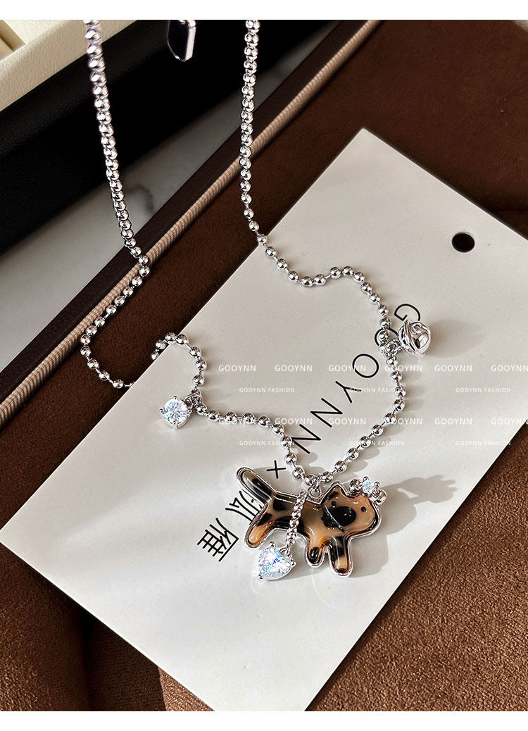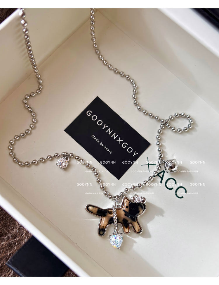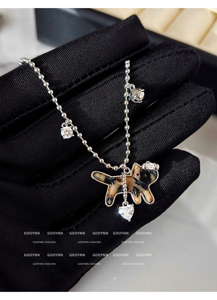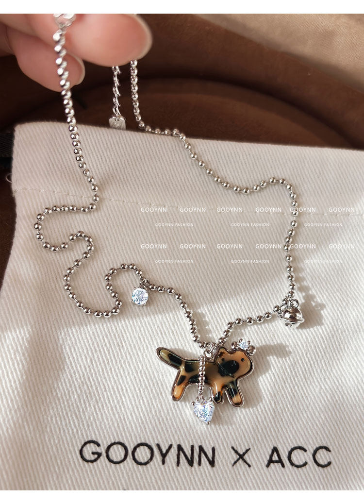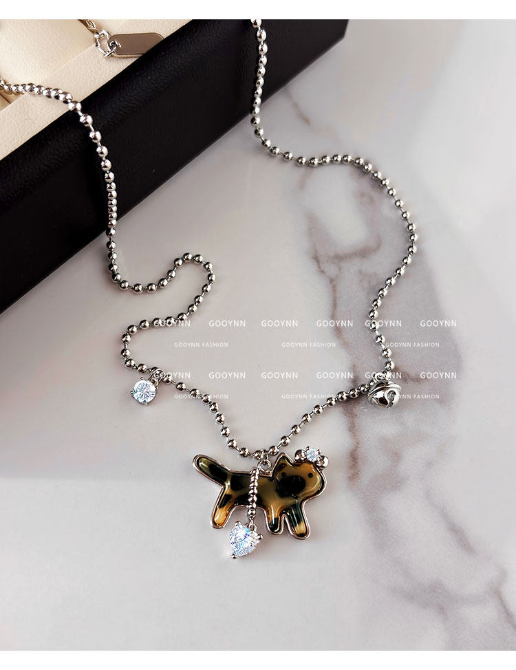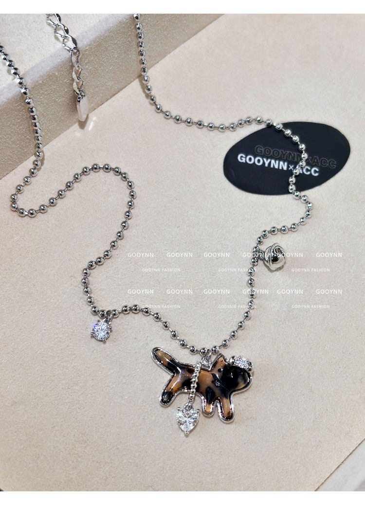 復古豹紋小貓項鍊女款鑽石愛心吊墜配飾高級感輕奢小衆鎖骨毛衣鏈