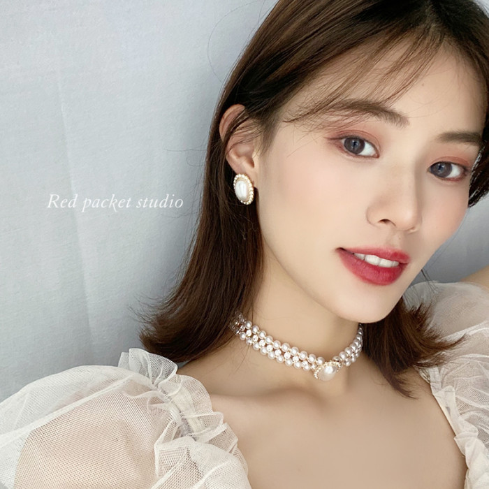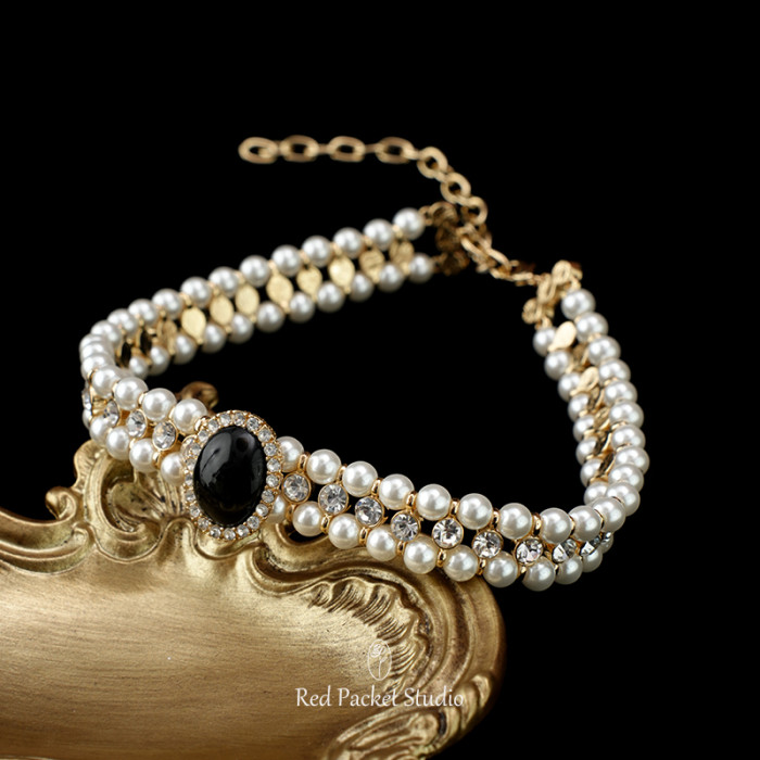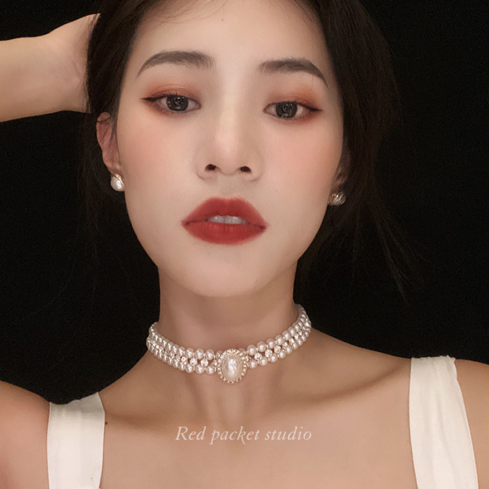 紅口袋法式復古珍珠項鍊頸鏈新娘配飾婚紗飾品小衆輕奢禮服choker