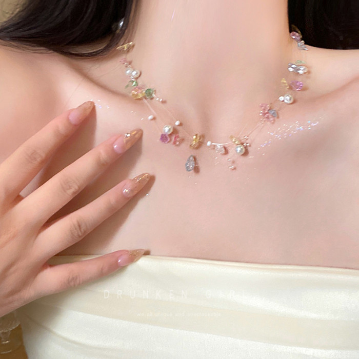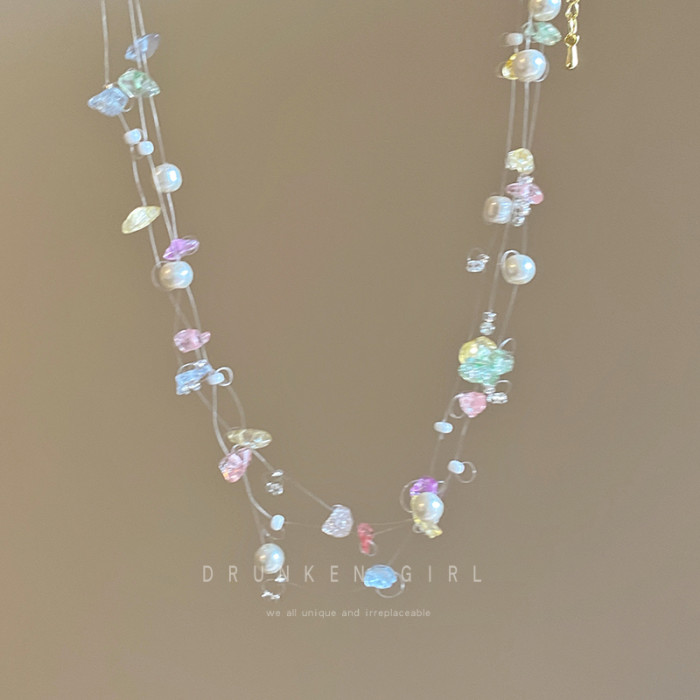 彩色串珠珍珠項鍊女天然石雙層曡戴頸鏈配飾小衆設計高級感鎖骨鍊