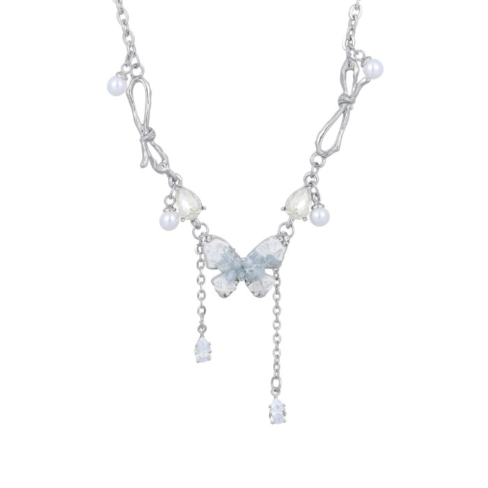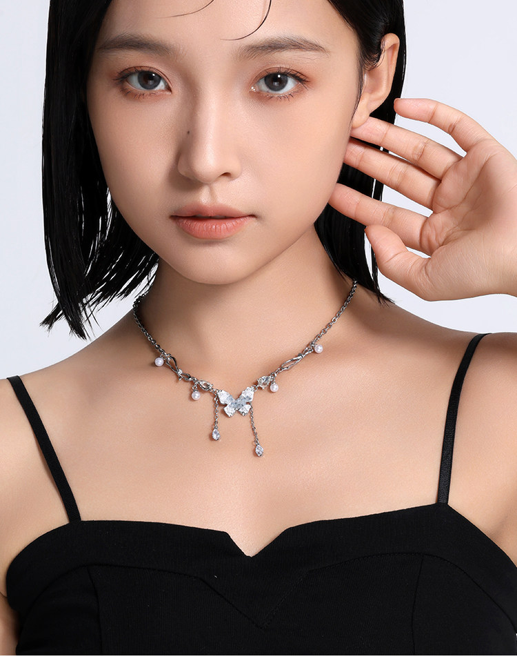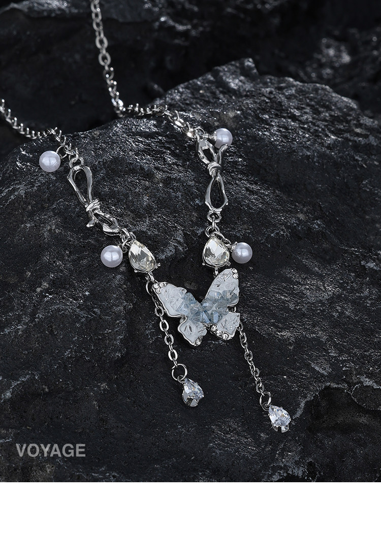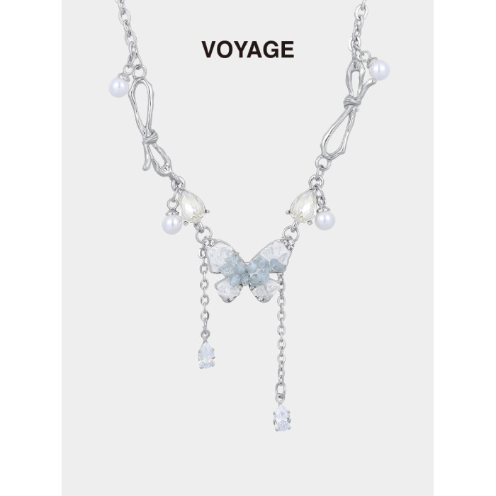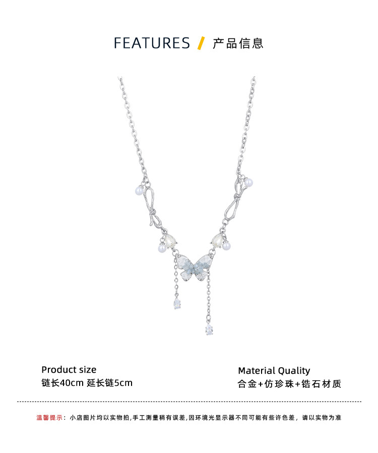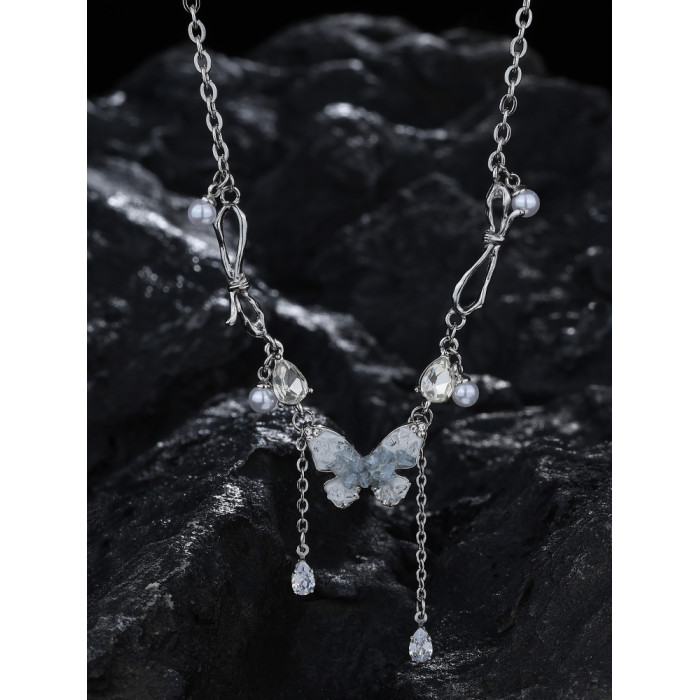 碎冰藍鋯石蝴蝶流蘇吊墜項鍊配飾女輕奢小衆夏天高級感甜酷鎖骨鍊