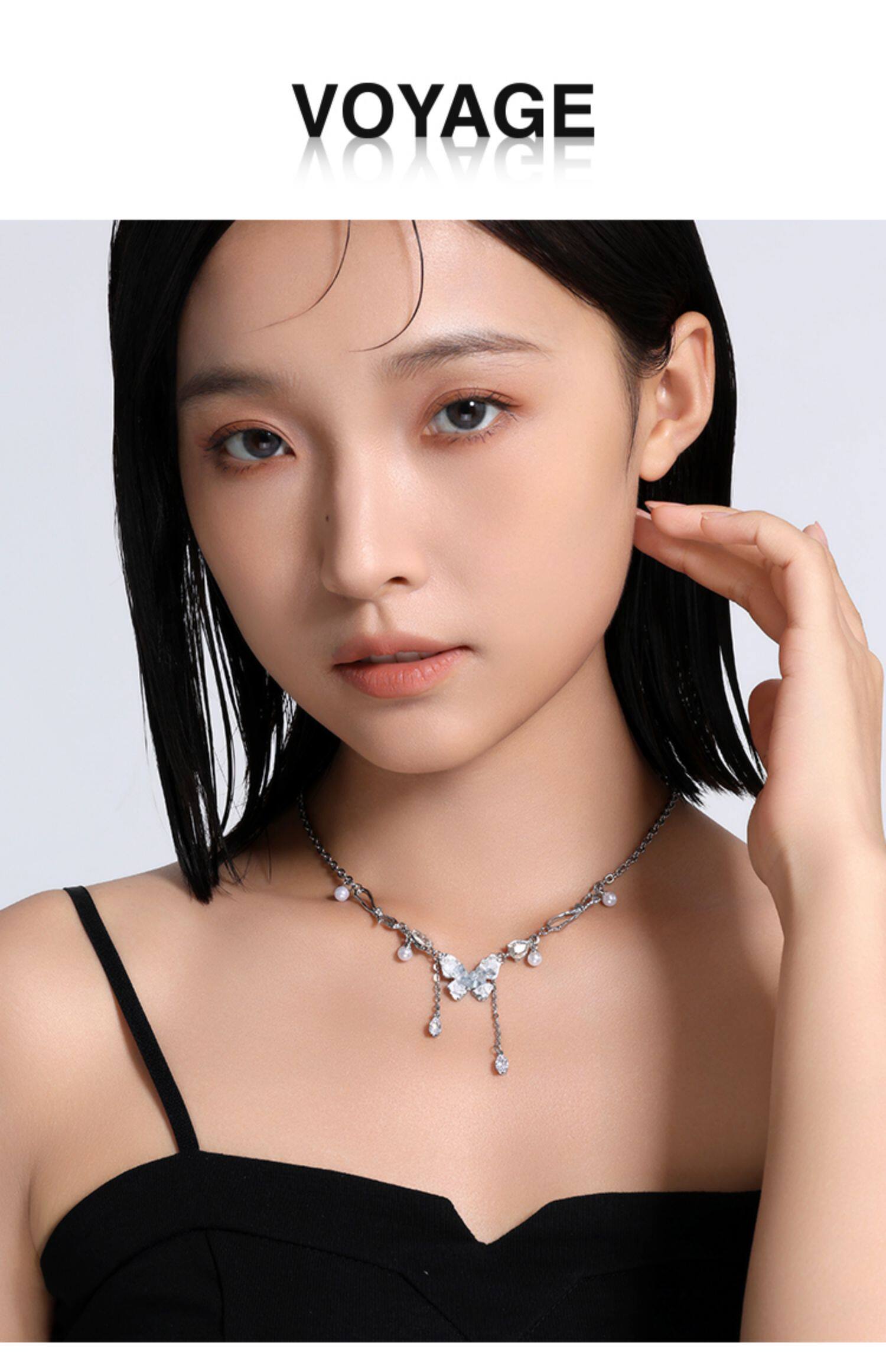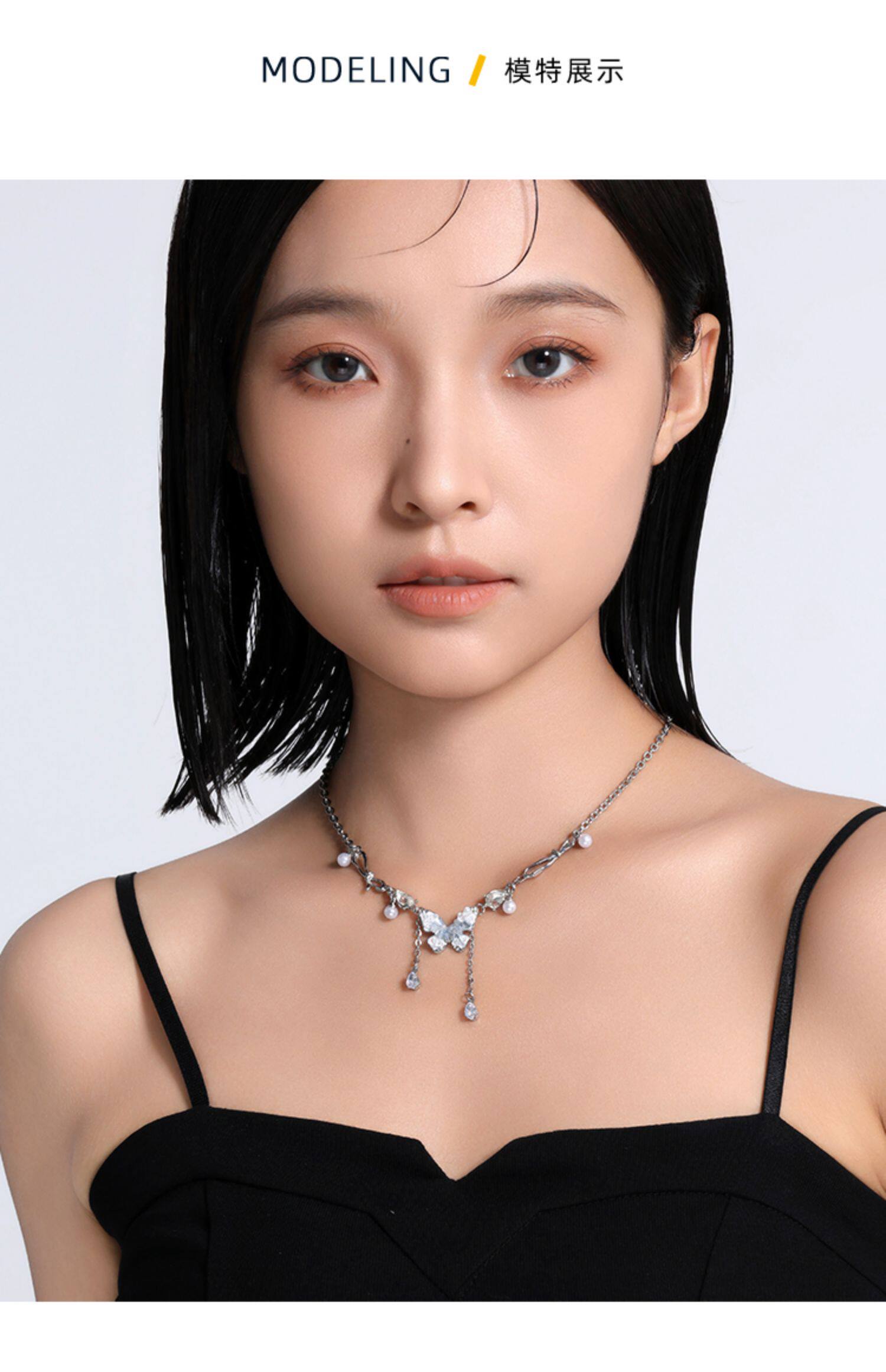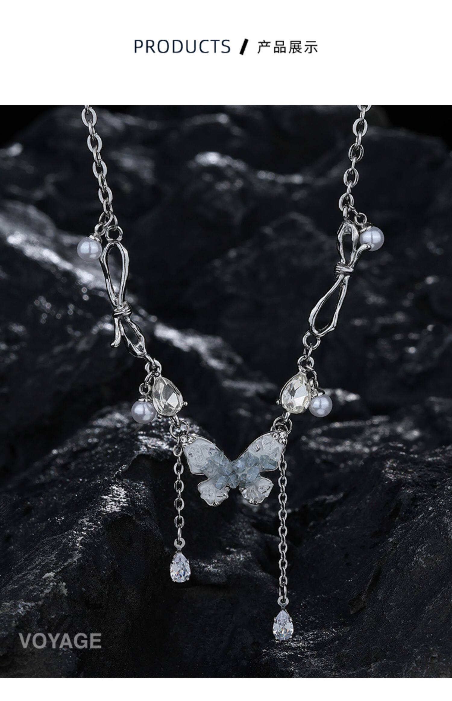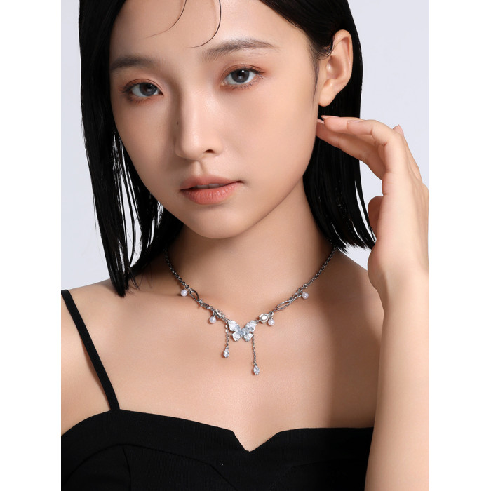 碎冰藍鋯石蝴蝶流蘇吊墜項鍊配飾女輕奢小衆夏天高級感甜酷鎖骨鍊