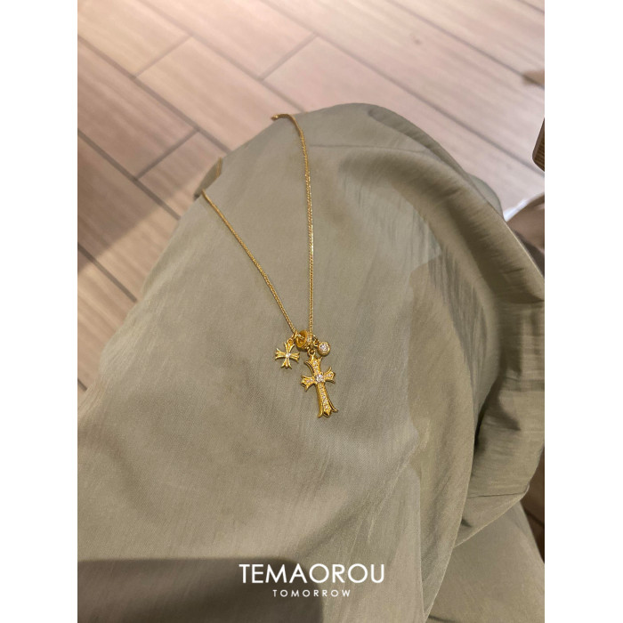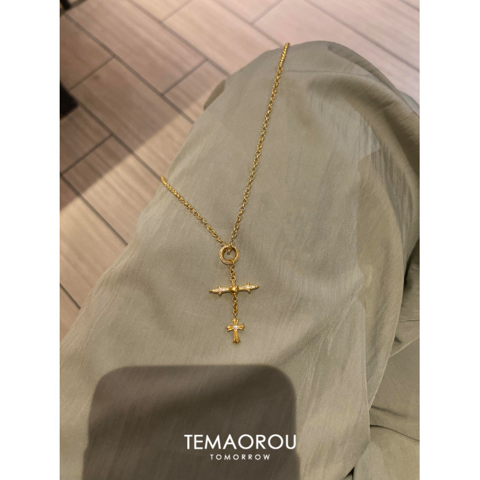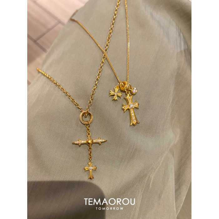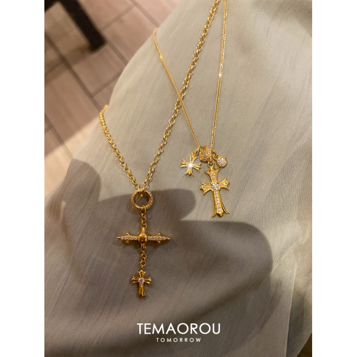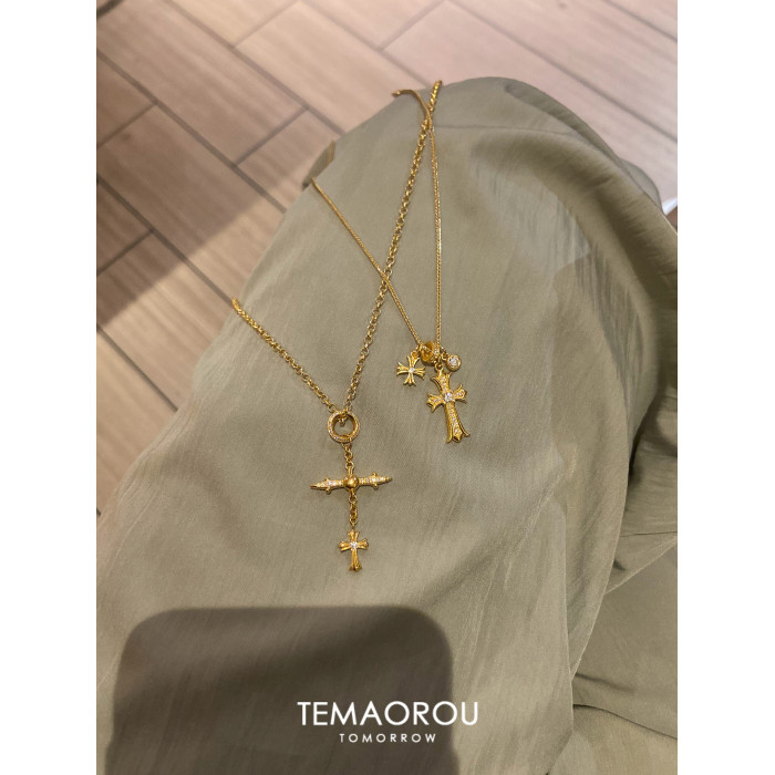 V金不掉色/十字架吊墜細閃復古項鍊小衆獨特設計鎖骨鍊配飾毛衣鏈