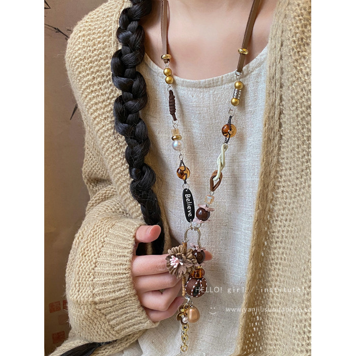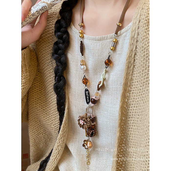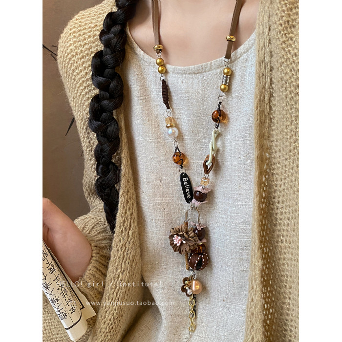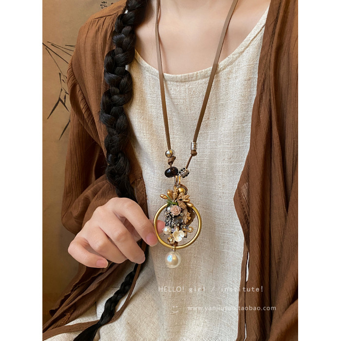 [花漾]新中式花朵吊墜項鍊配飾女民族風復古長款森系復古毛衣鏈
