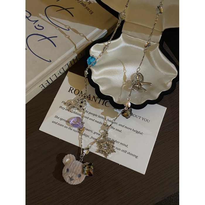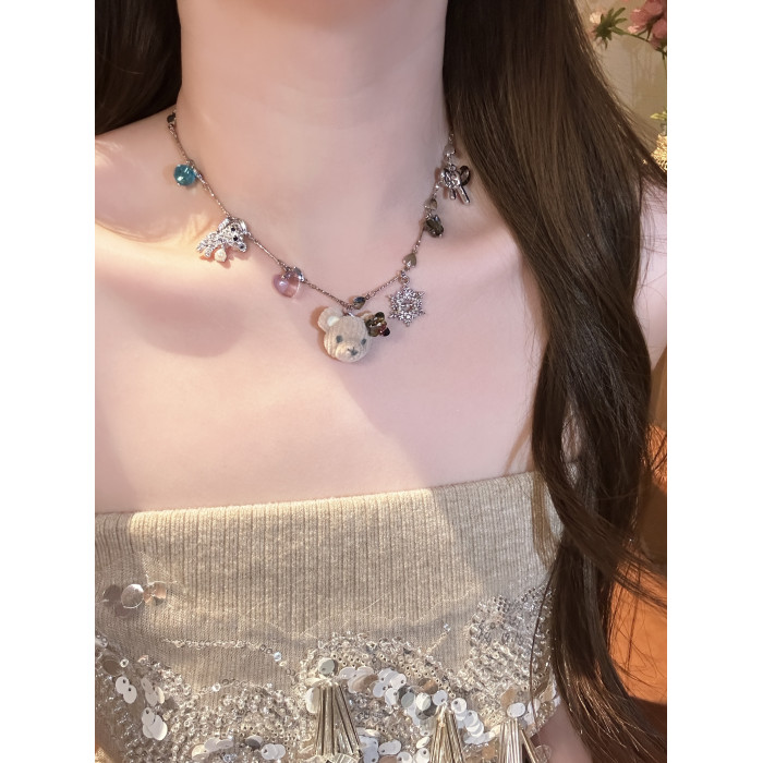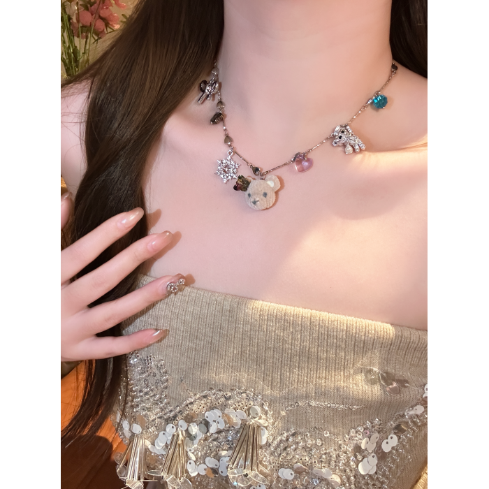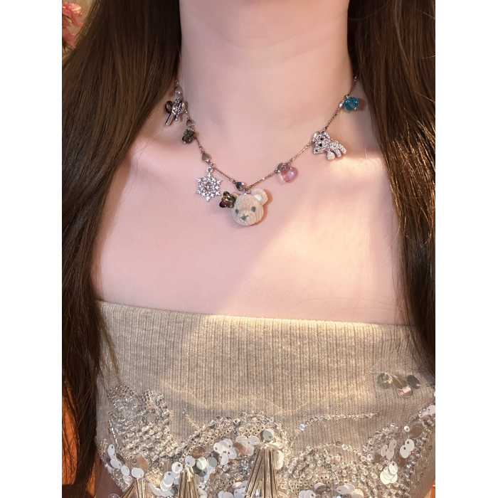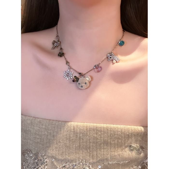 小衆設計感植絨小熊雪花吊墜項鍊女款可愛甜美氣質鎖骨鍊秋冬頸鏈