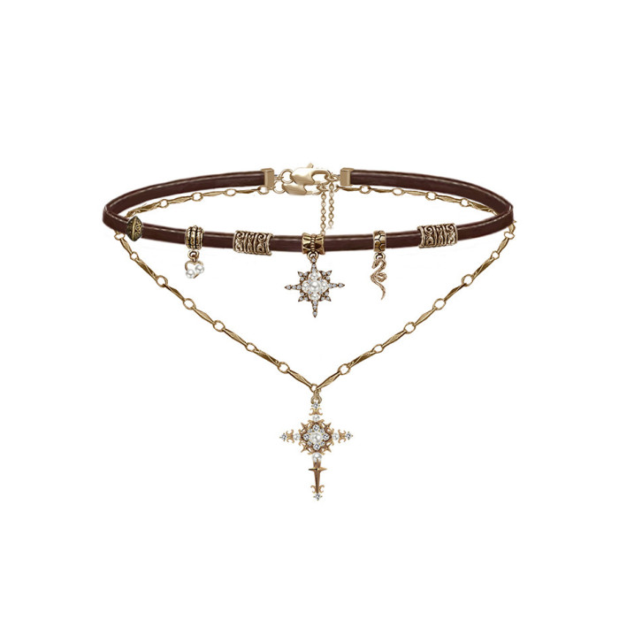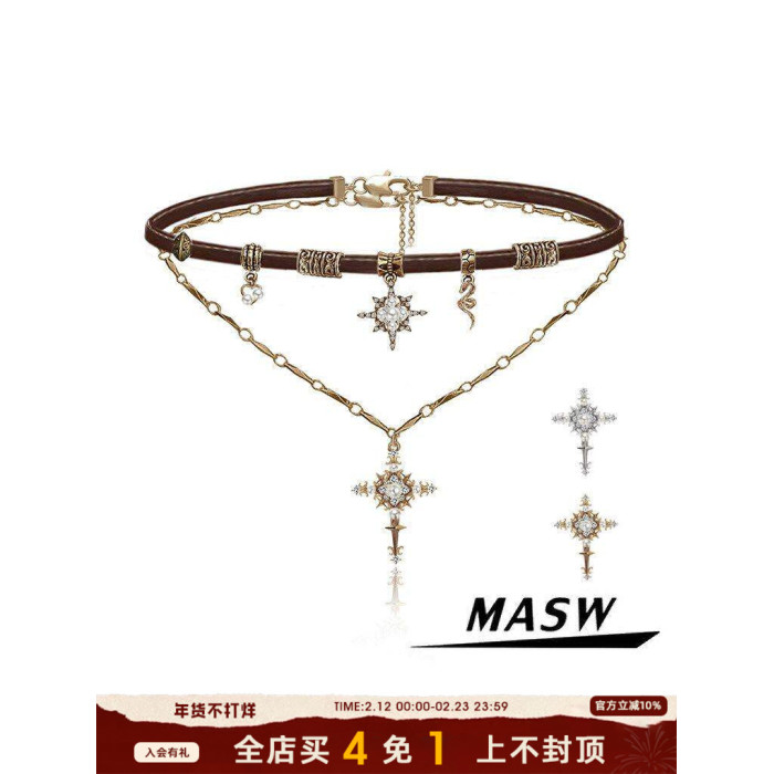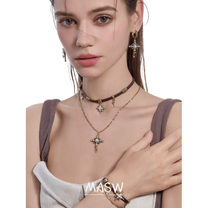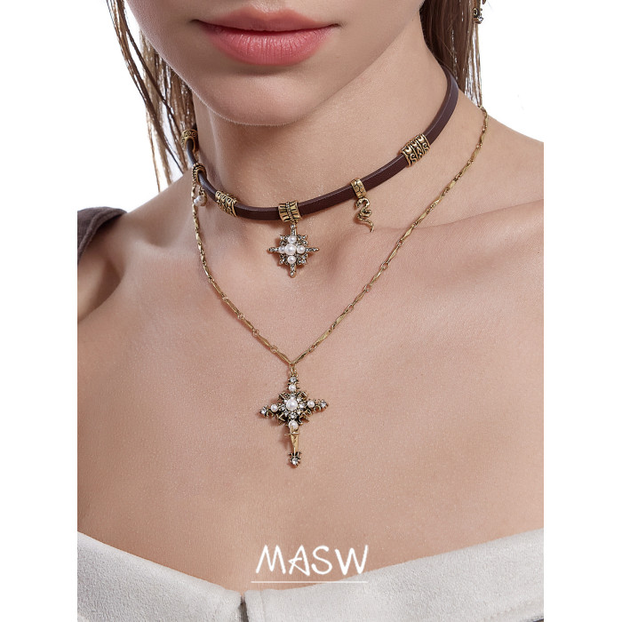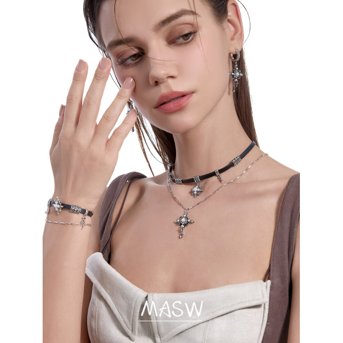 MASW麻秀原創設計懷舊系列甜酷星芒十字項鍊美拉德皮質頸鏈毛衣鏈