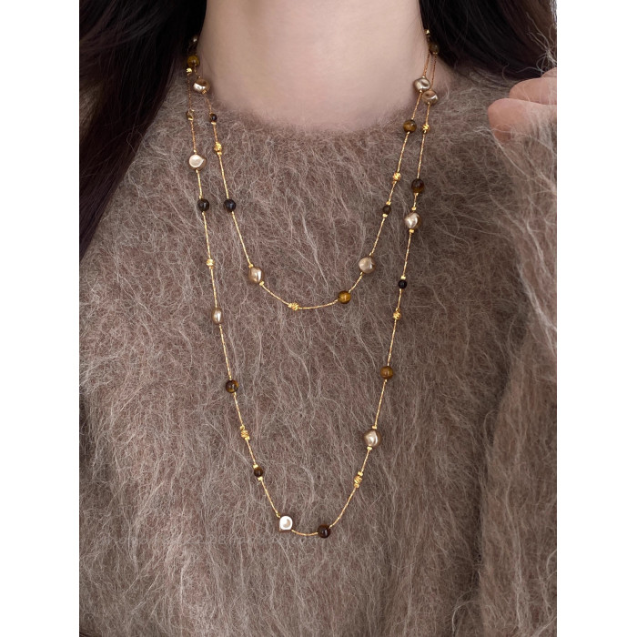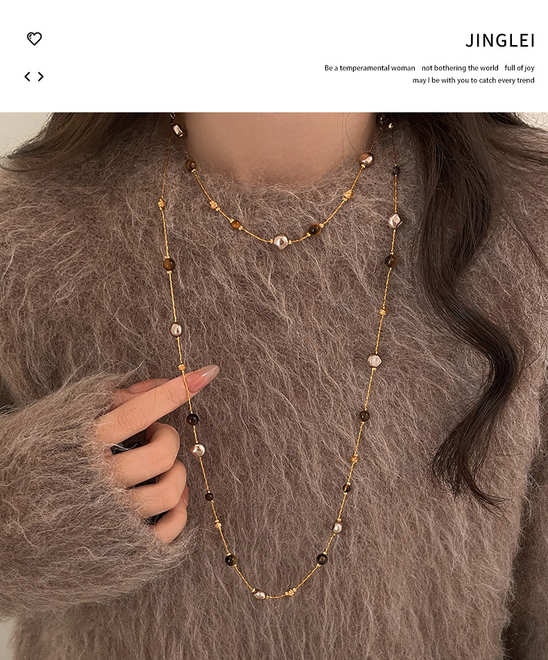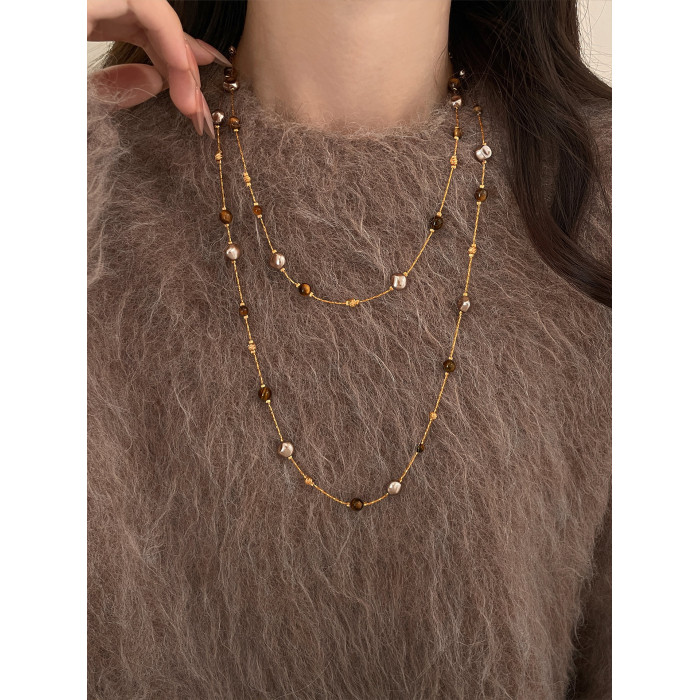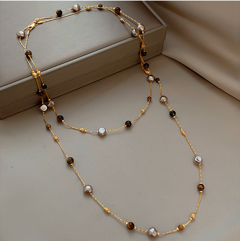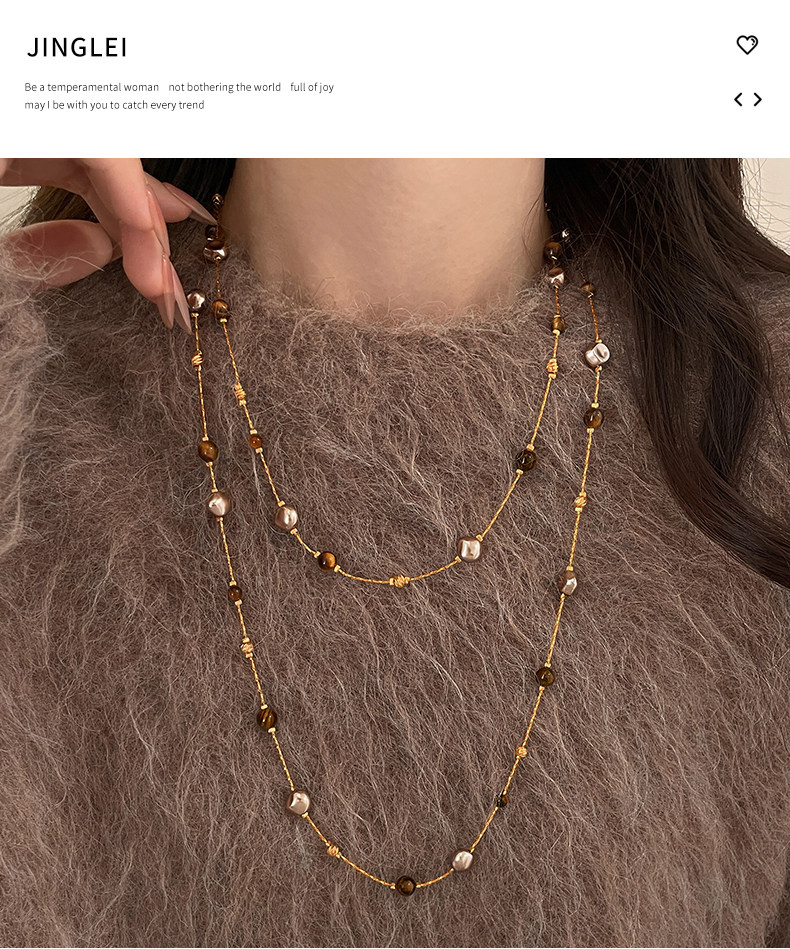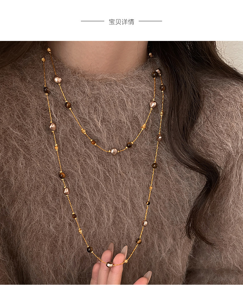 美拉德串珠虎眼石曡戴項鍊女秋冬爆款高級感多層長款毛衣鏈鎖骨鍊