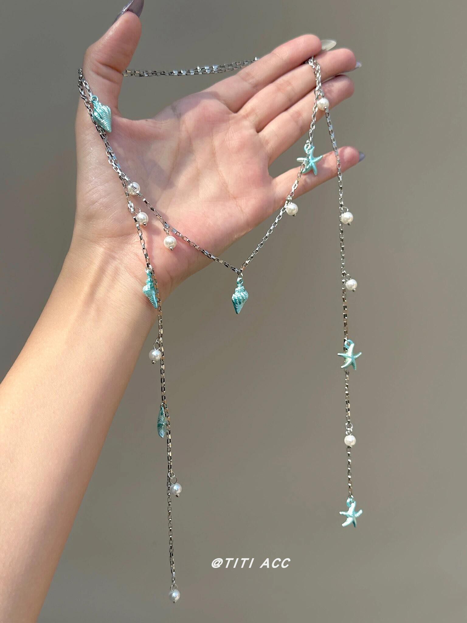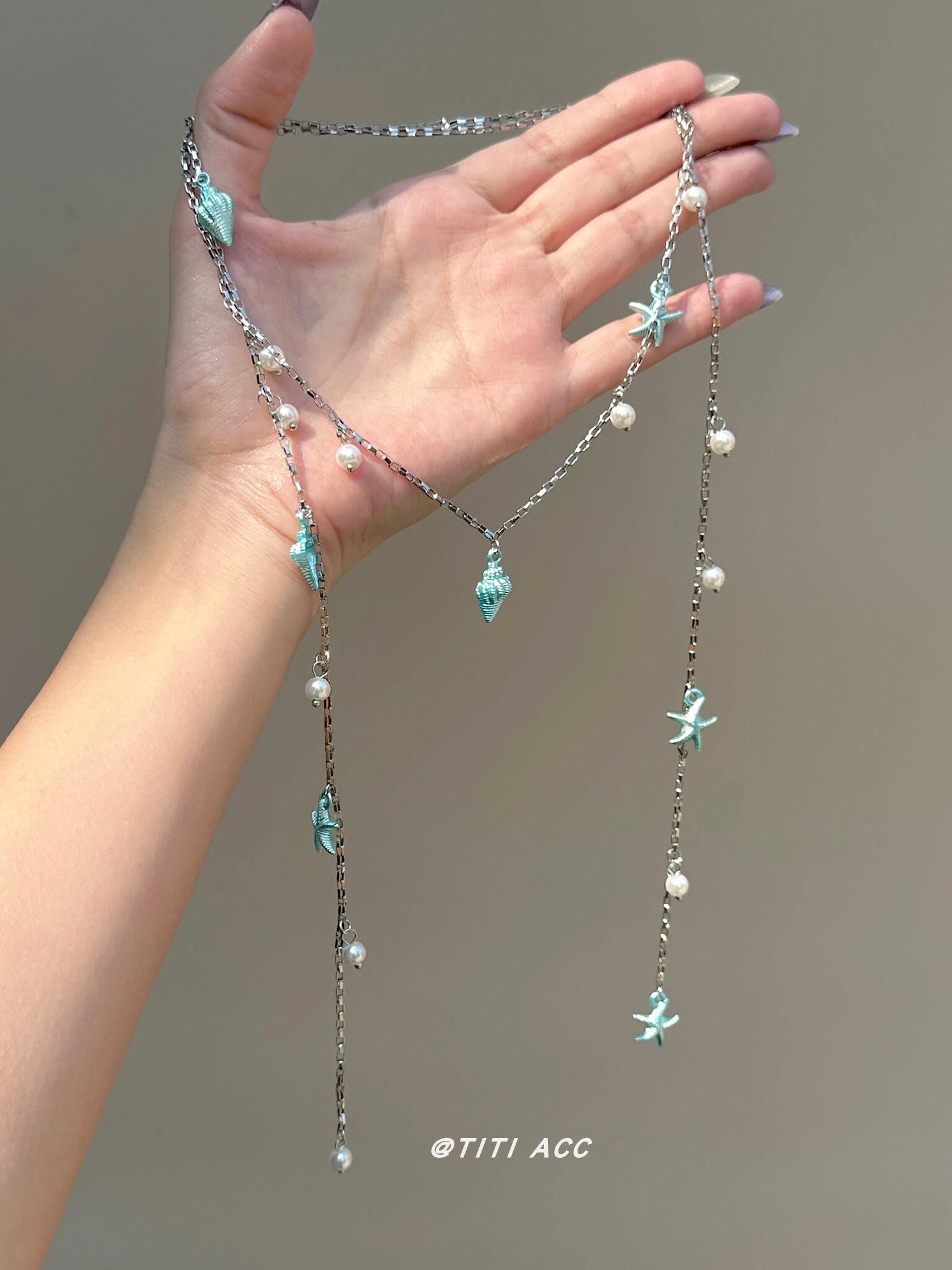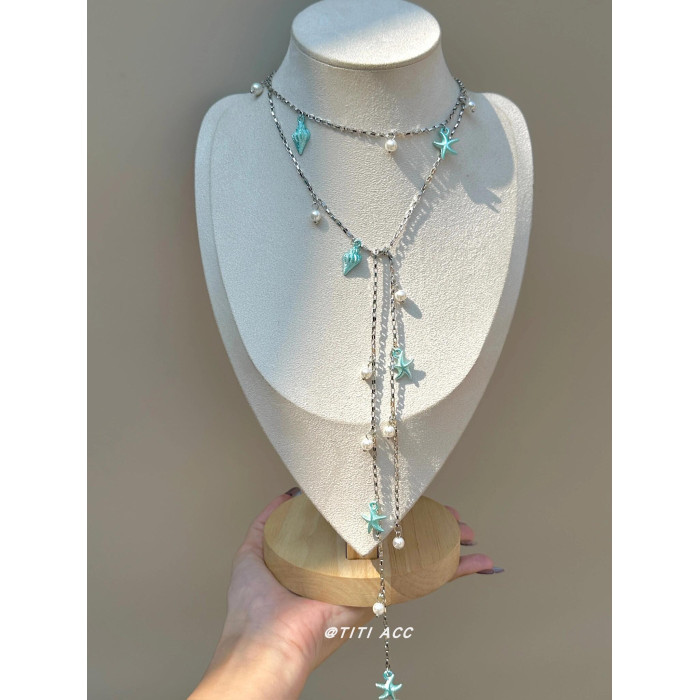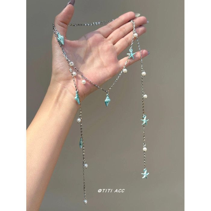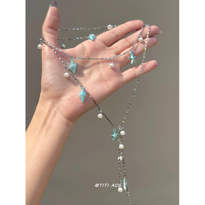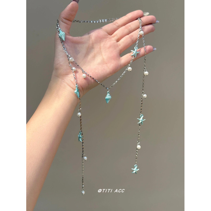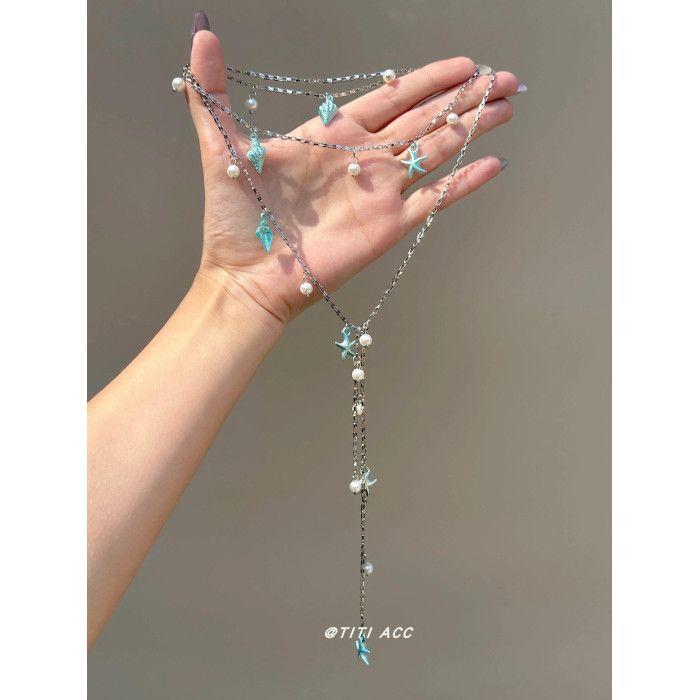 藍色海星海螺珍珠流蘇項鍊長款夏天搭配裙子鎖骨鍊女海邊度假配飾