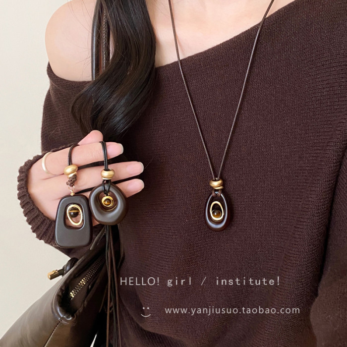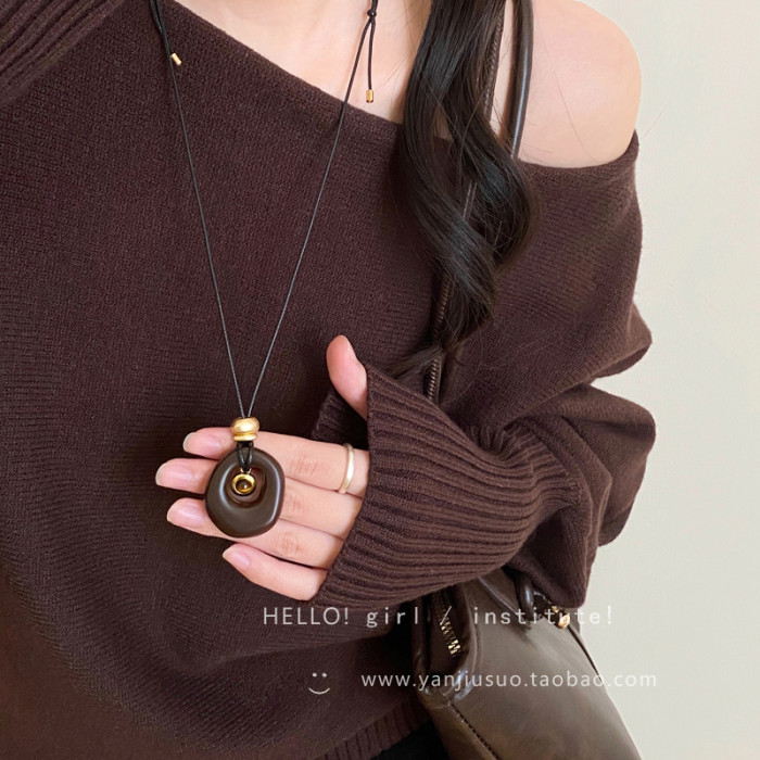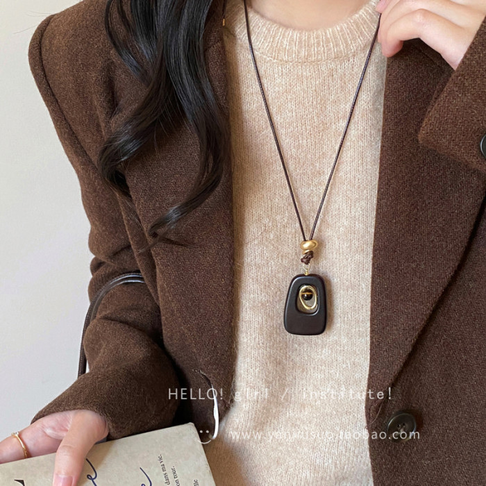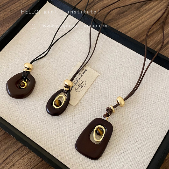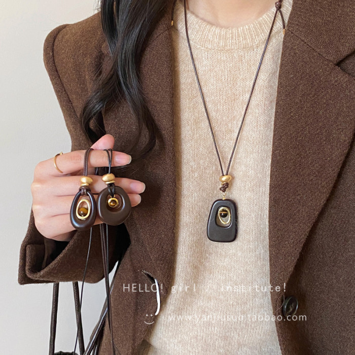 復古咖色虎眼石鏤空吊墜項鍊女秋冬獨特設計感長款掛脖毛衣鏈配飾