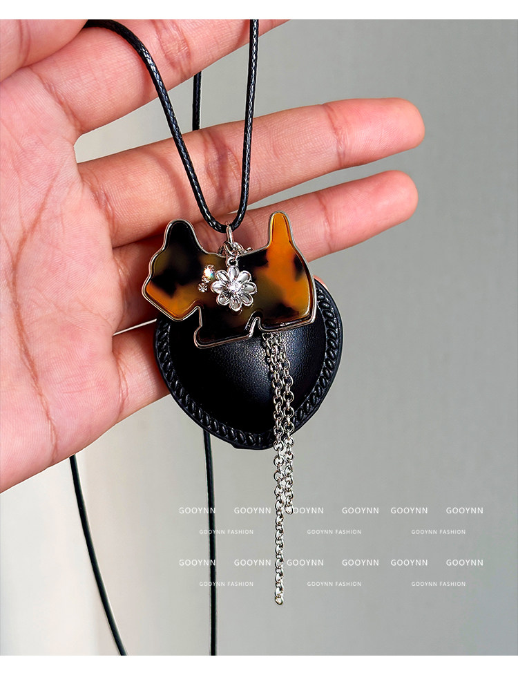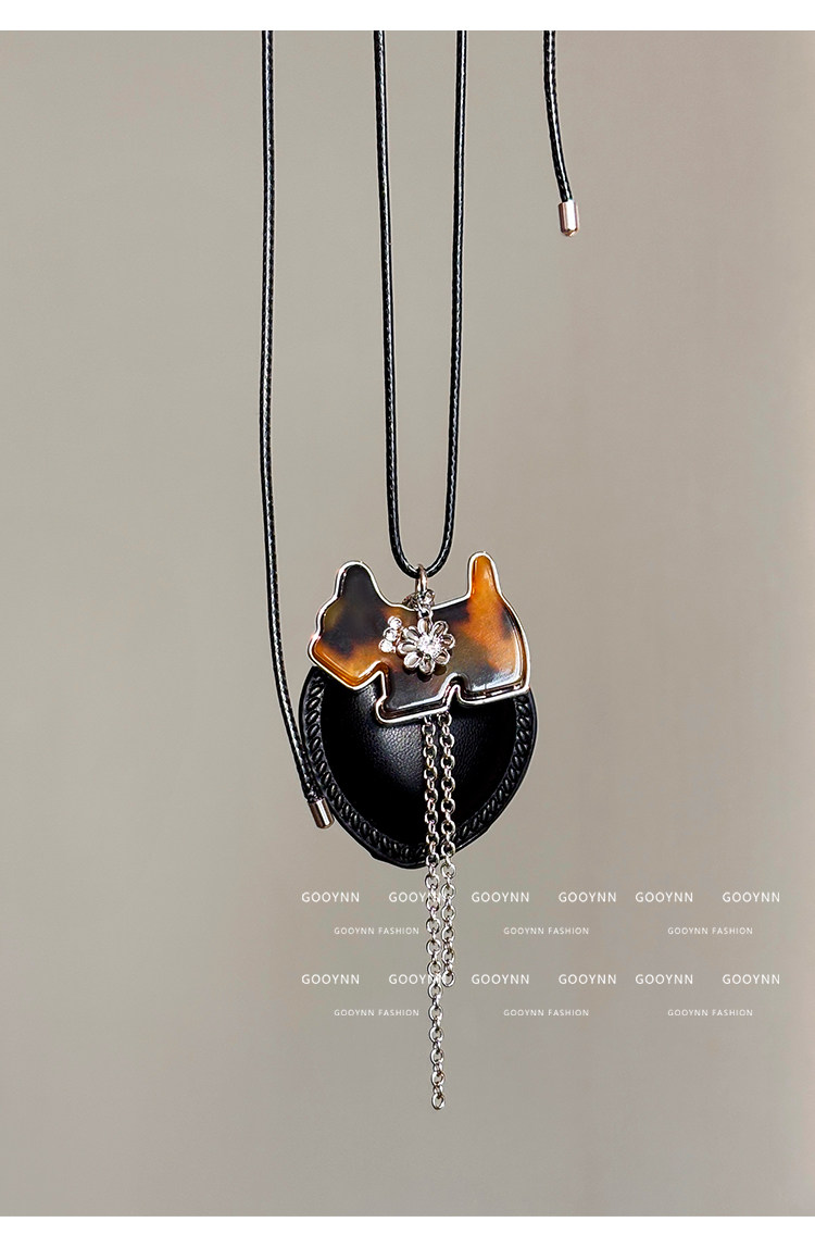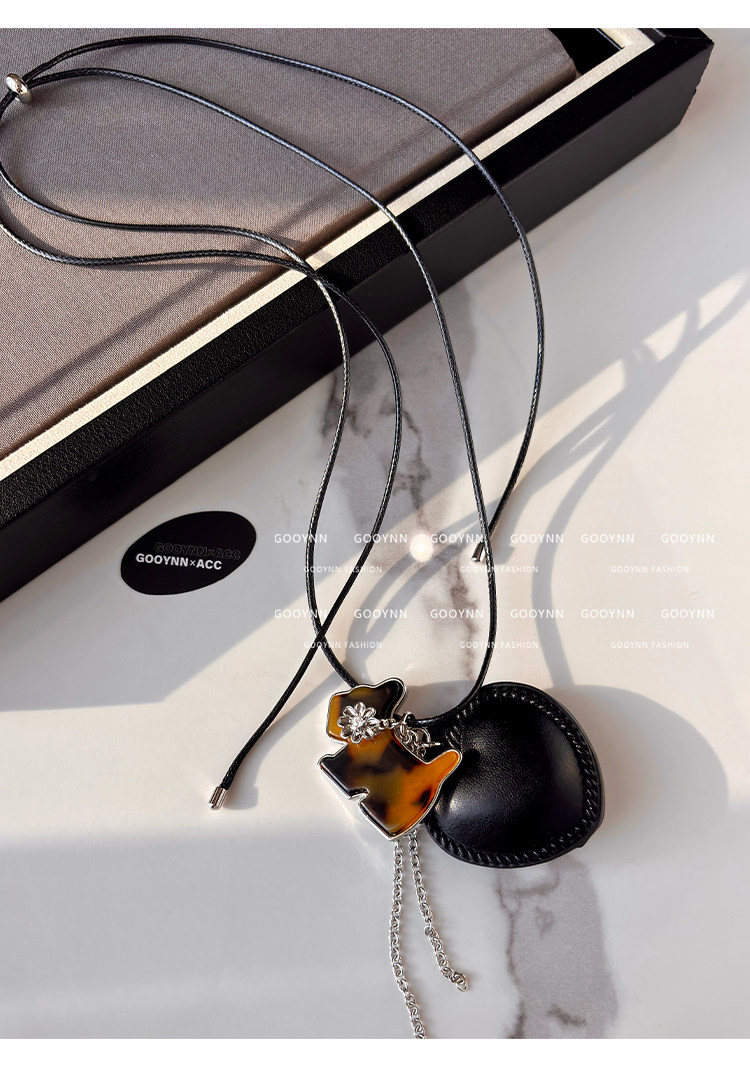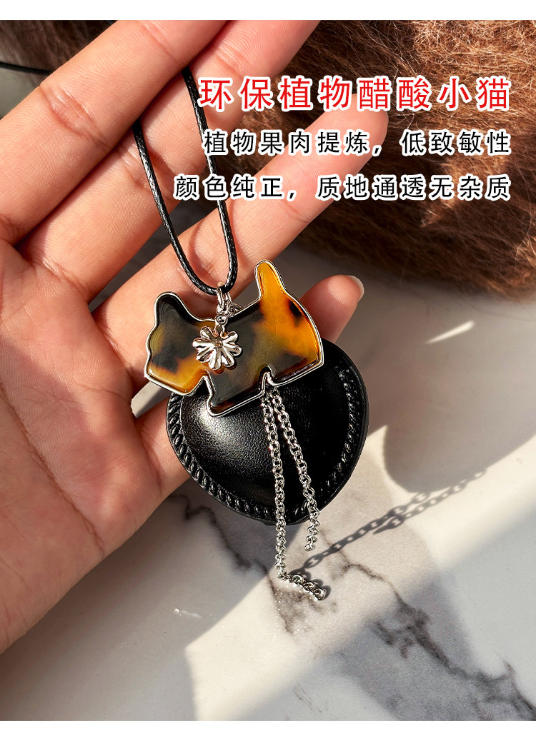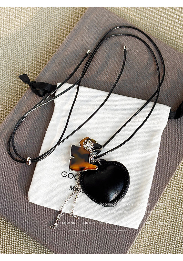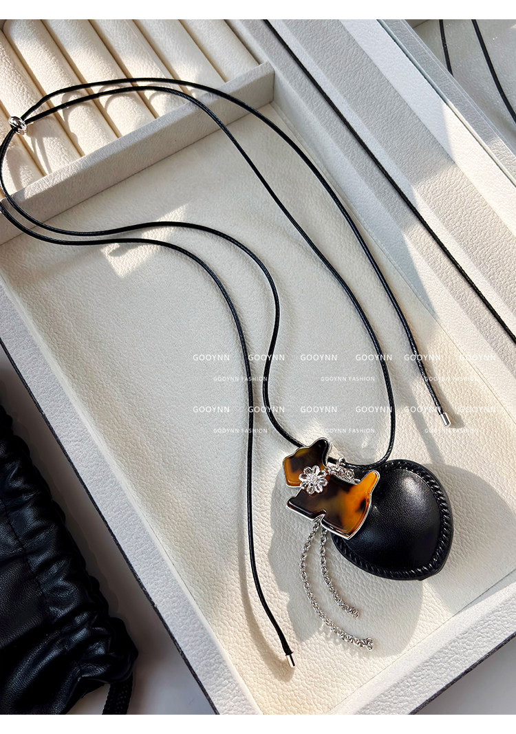 韓系ins黑色皮繩愛心項鍊女設計感小衆長款小貓吊墜毛衣鏈配飾品