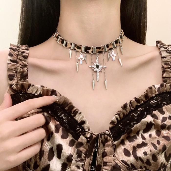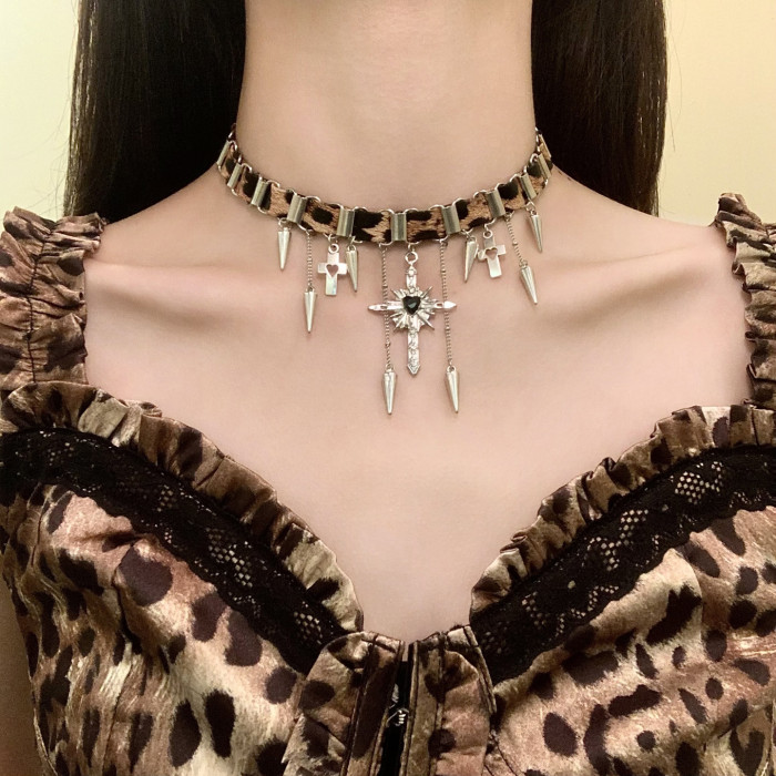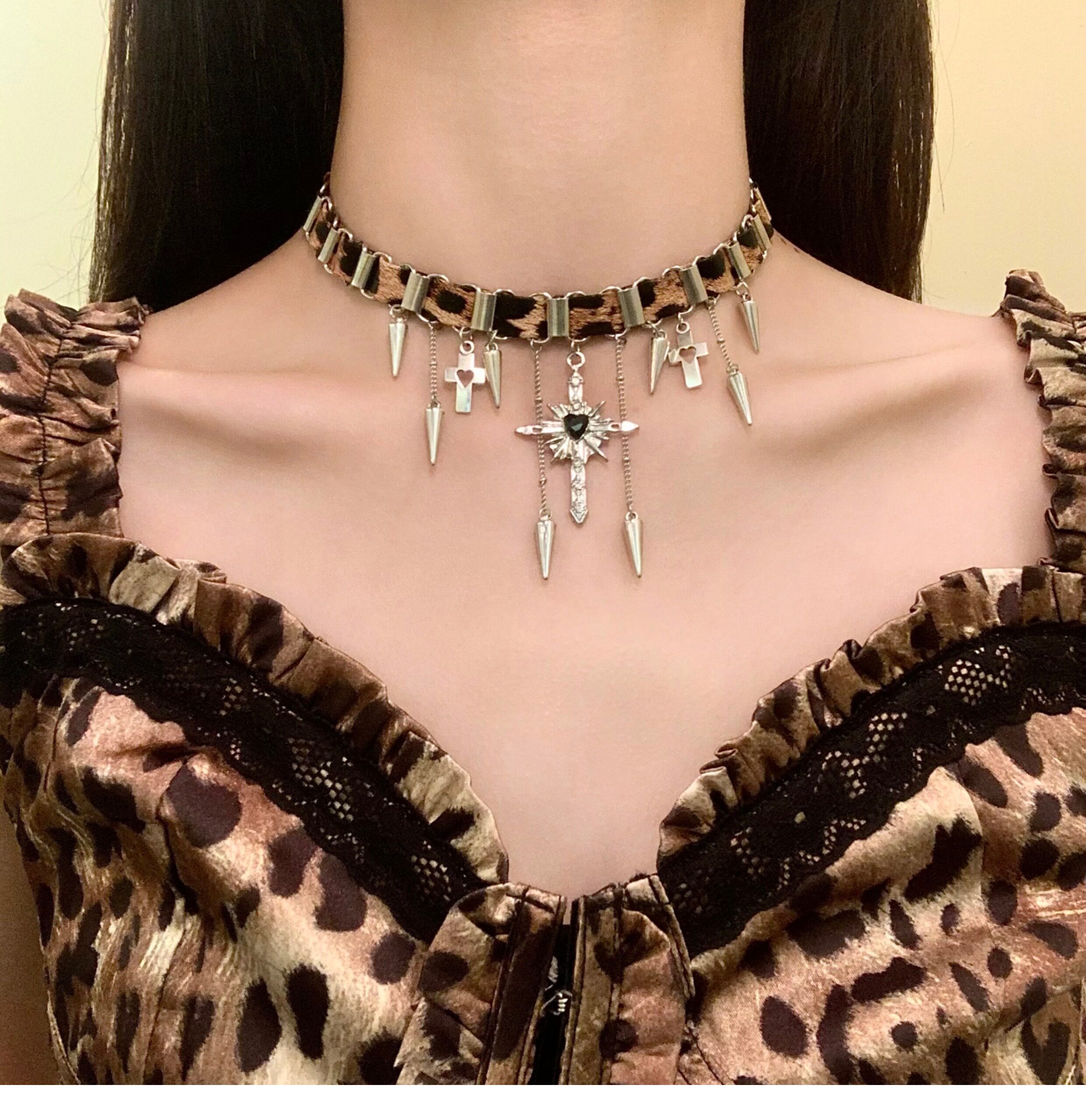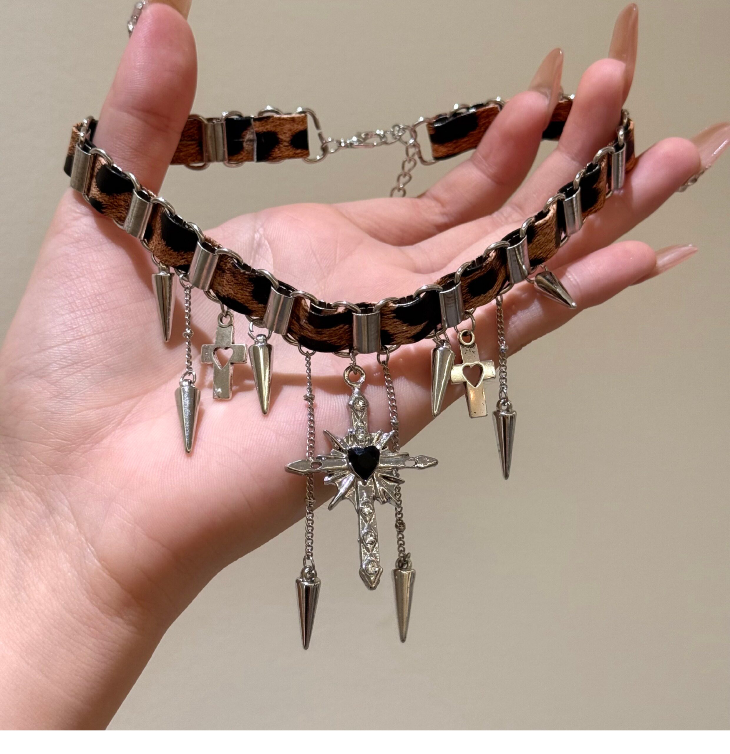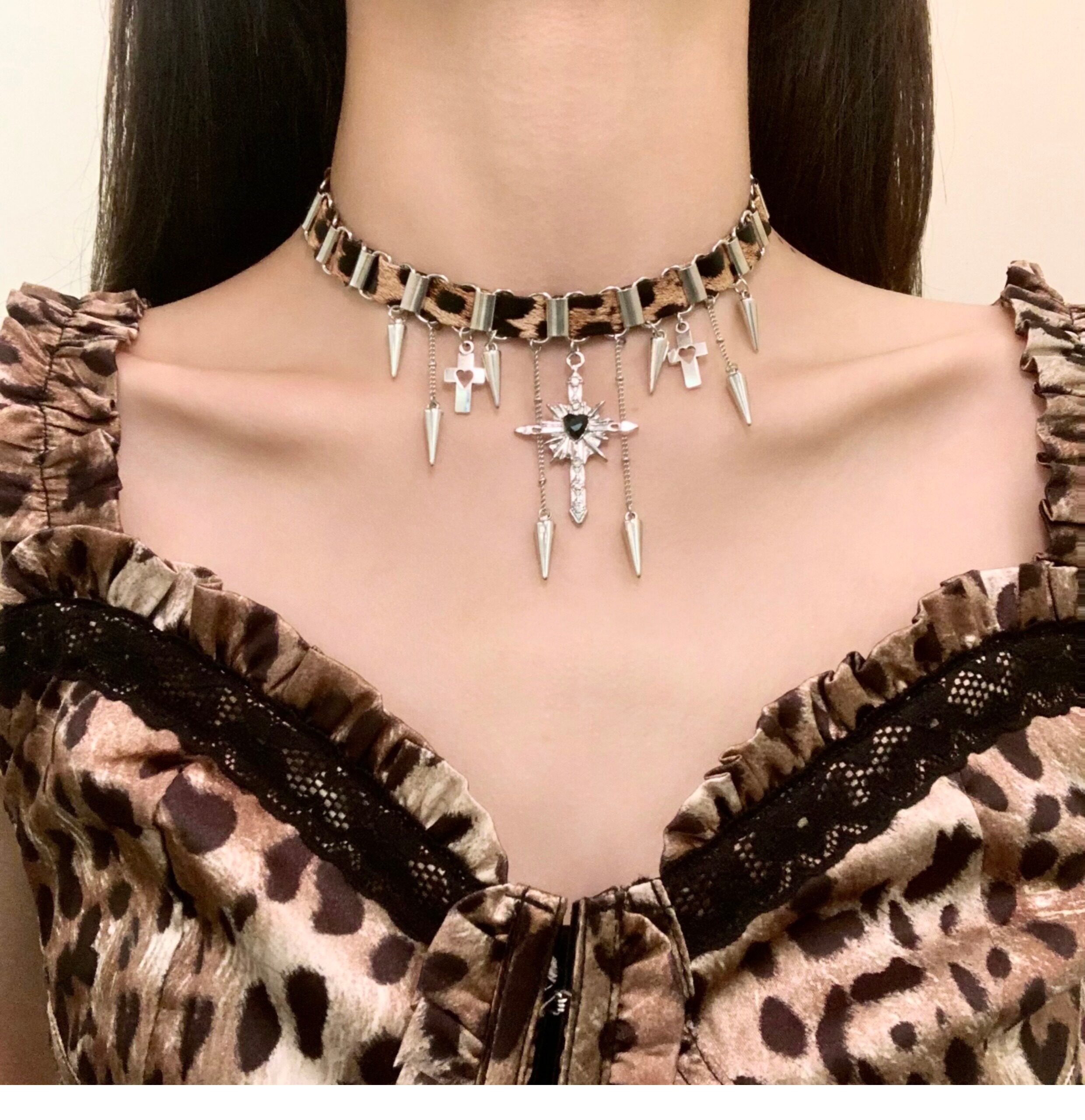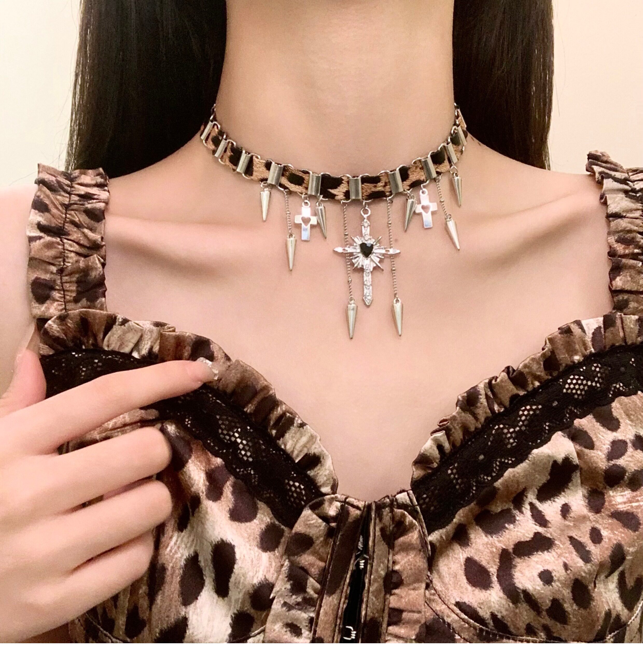 HEY TAO千禧辣妹風豹紋鉚釘十字架choker項鍊女小衆頸鏈項圈配飾