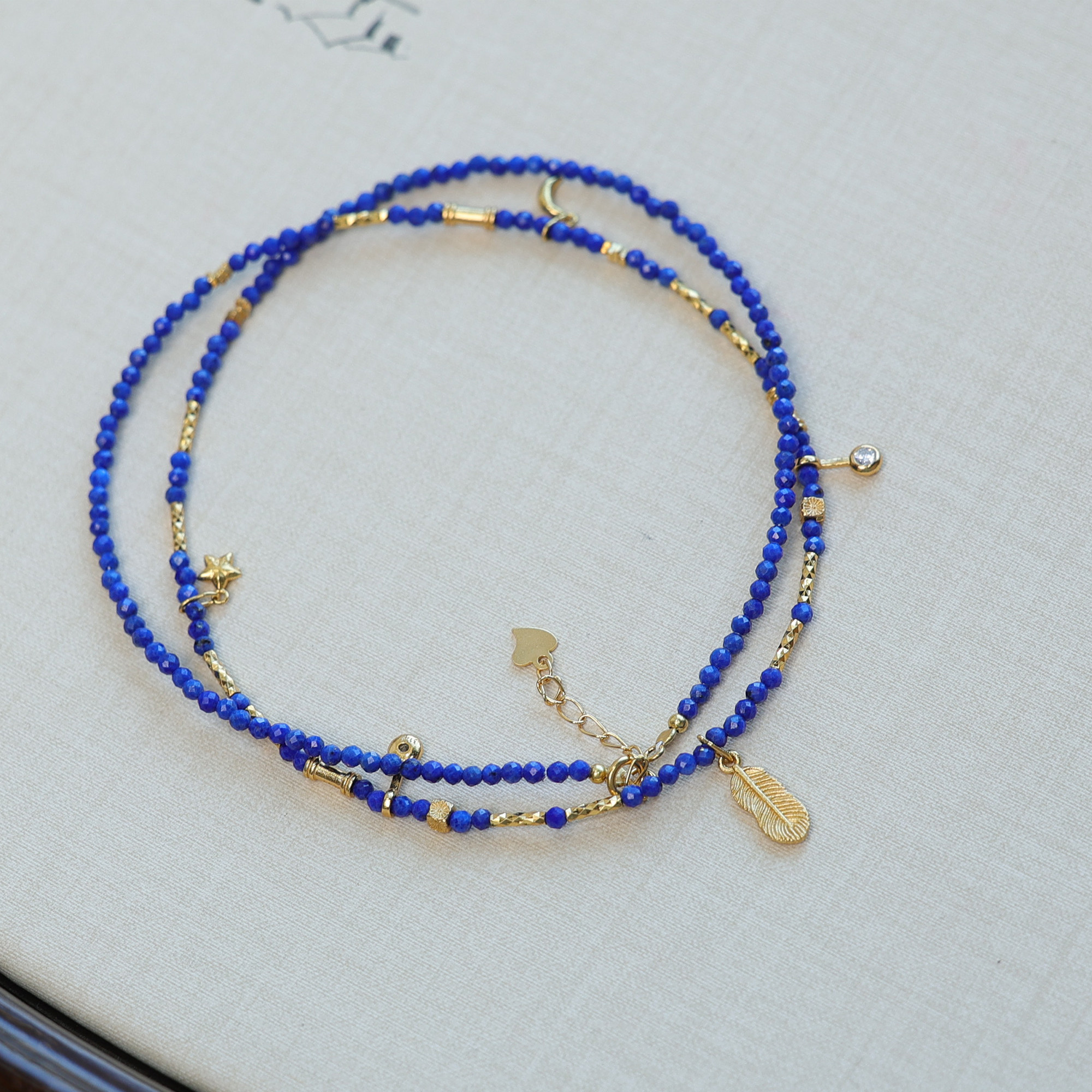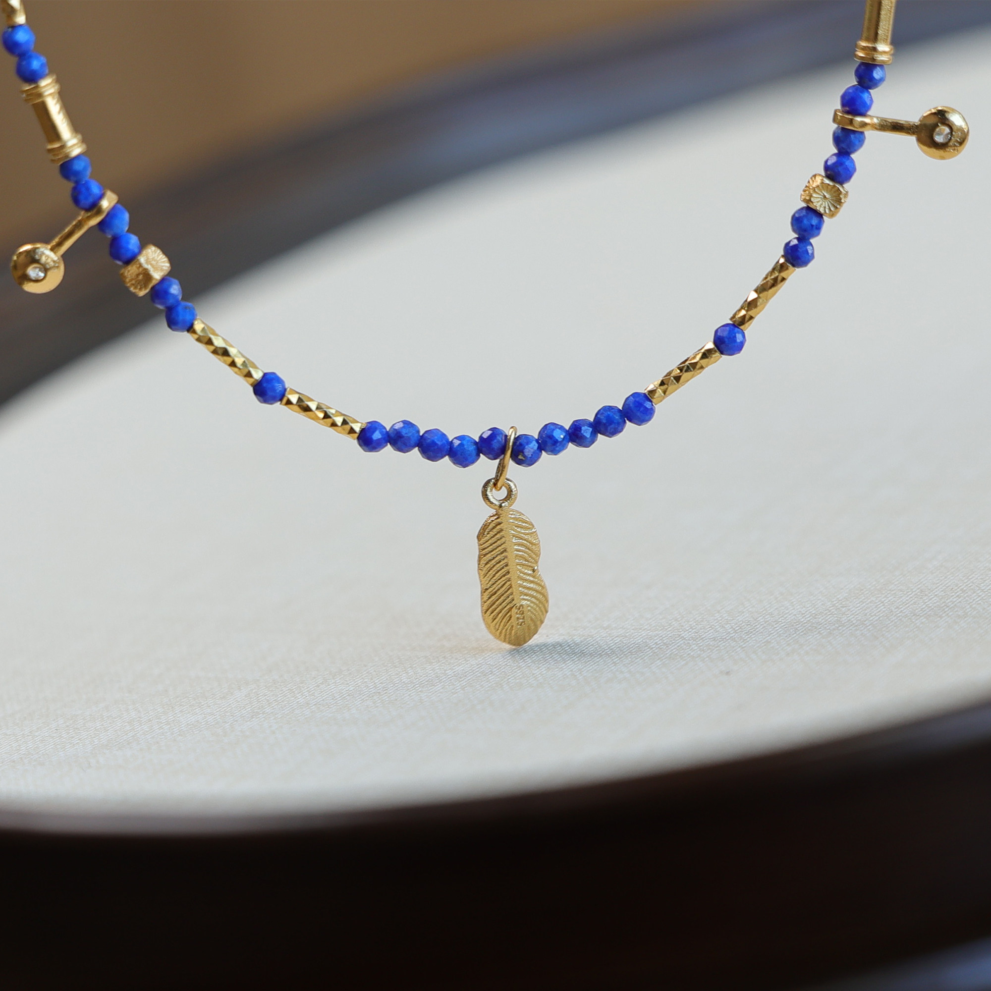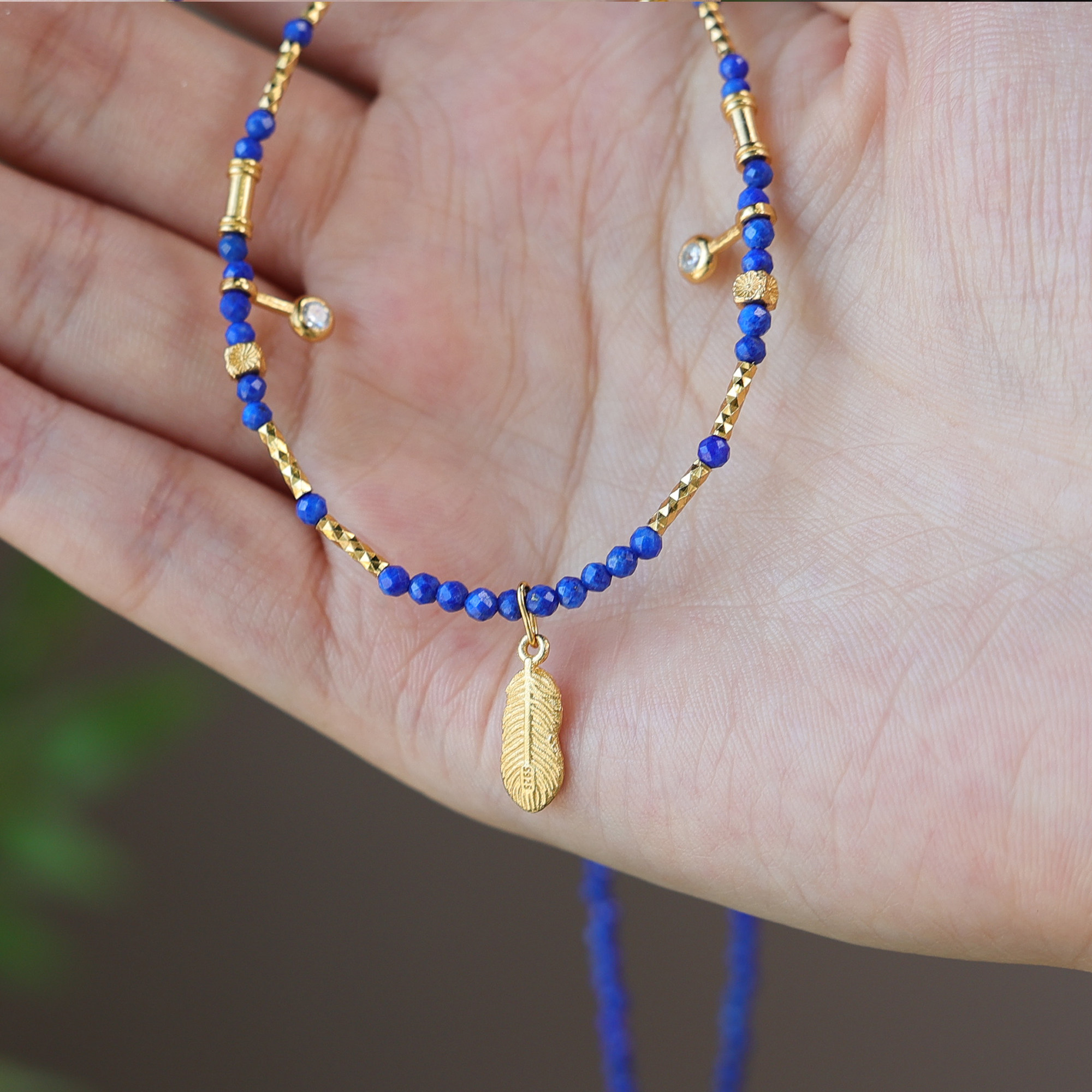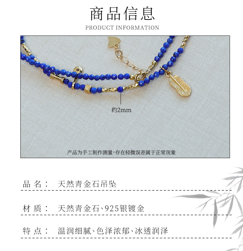 天然青金石鎖骨鍊羽毛鑲鑽2mm小米珠項鍊顯白氣質新中式小衆國風