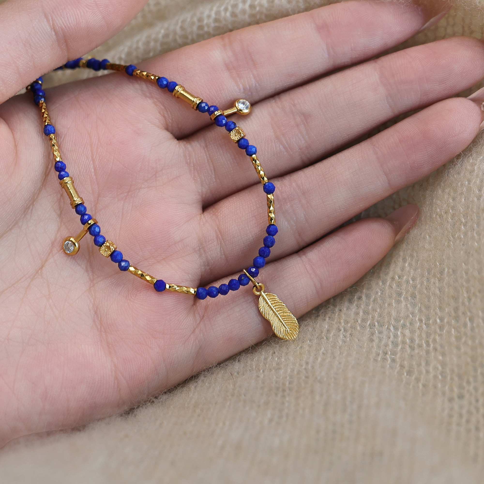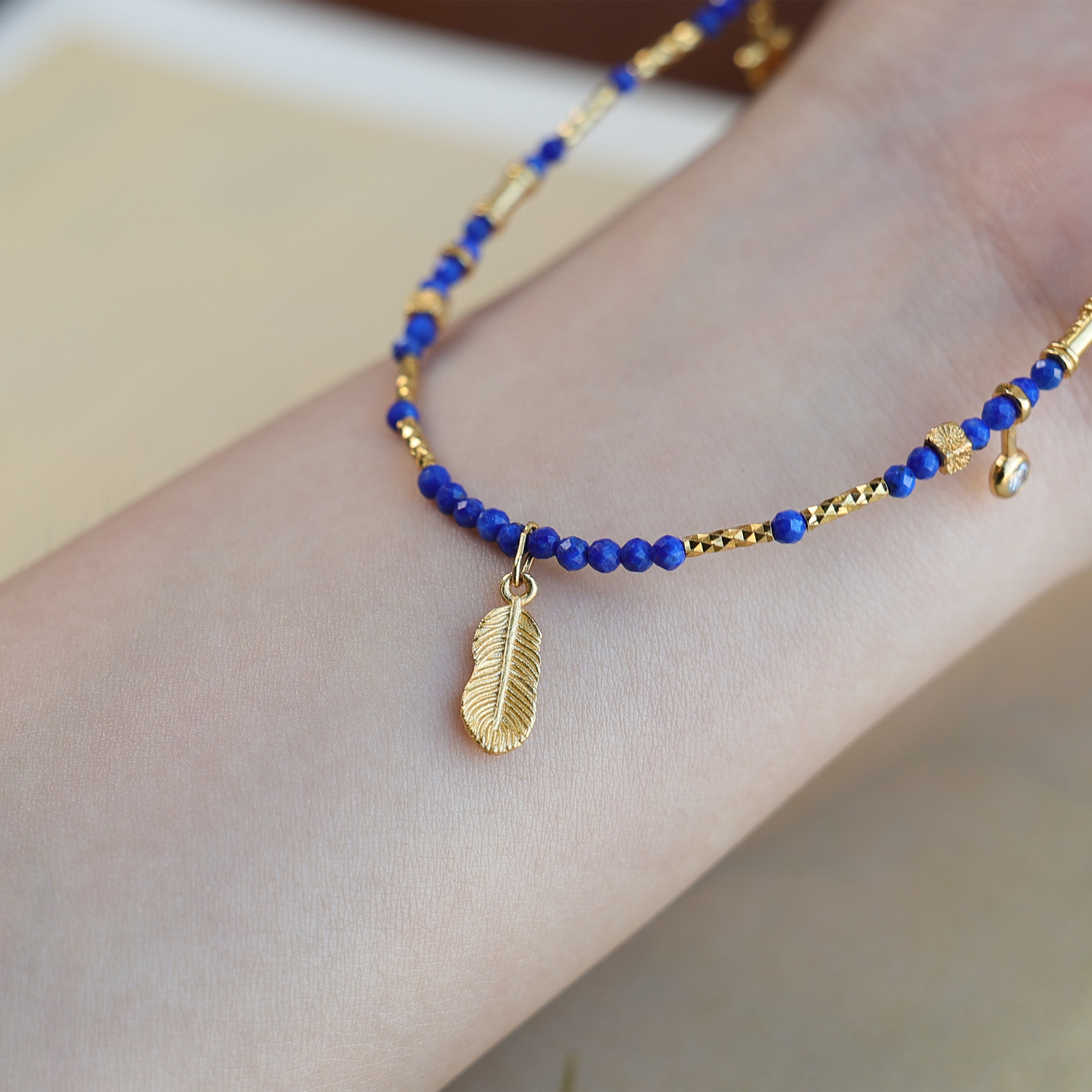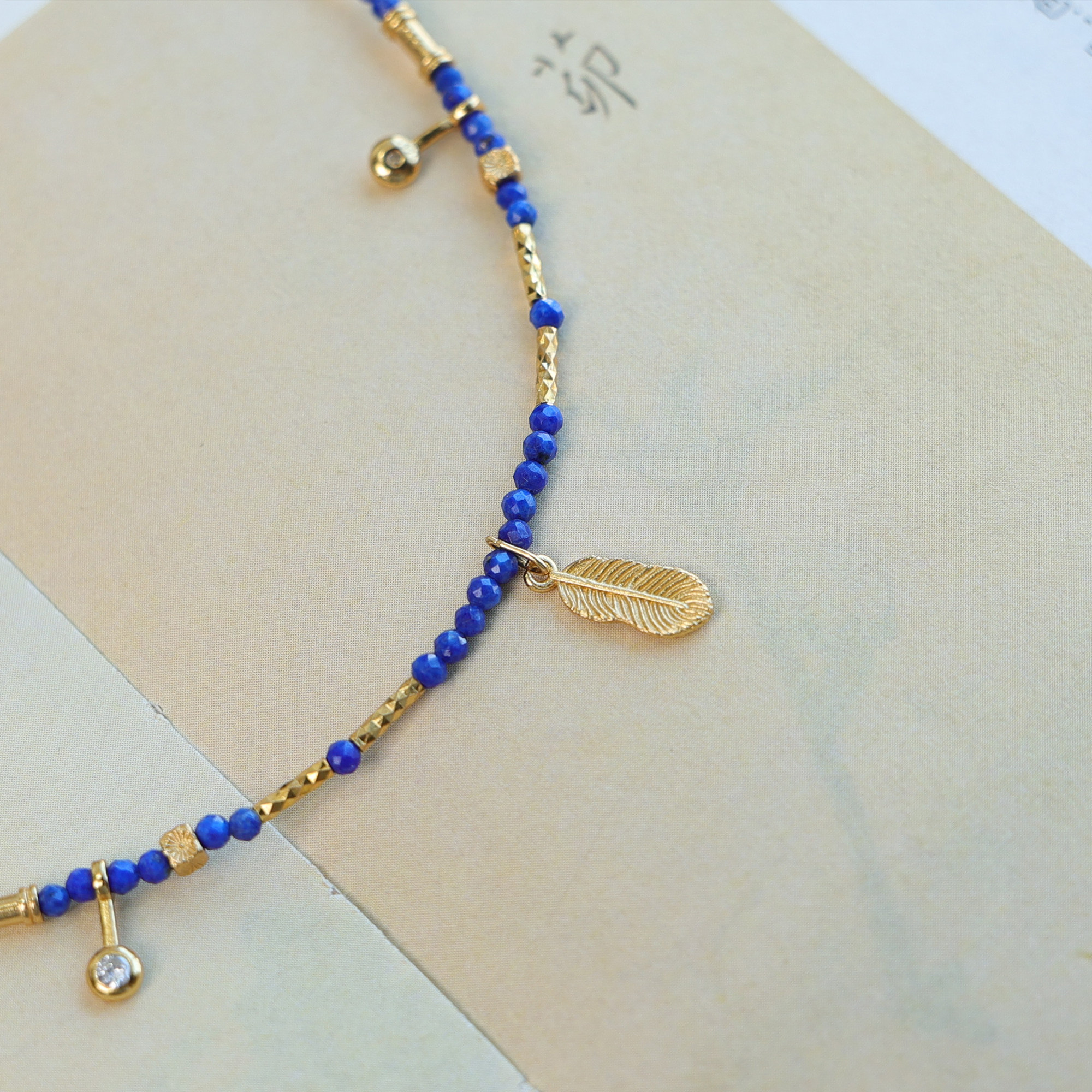 天然青金石鎖骨鍊羽毛鑲鑽2mm小米珠項鍊顯白氣質新中式小衆國風