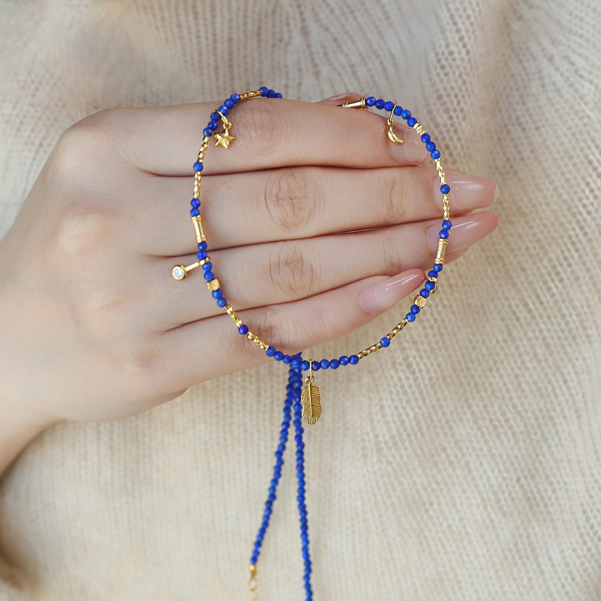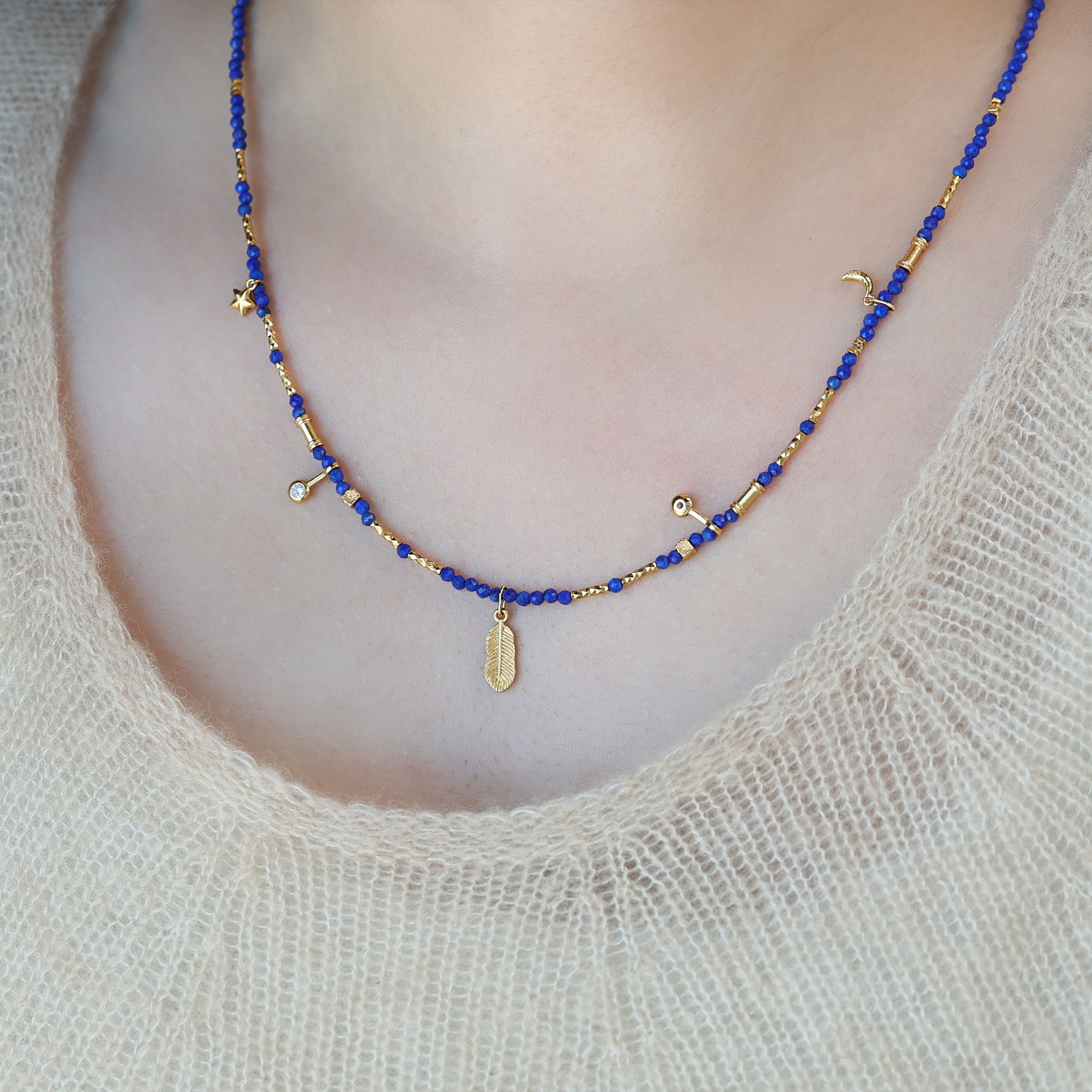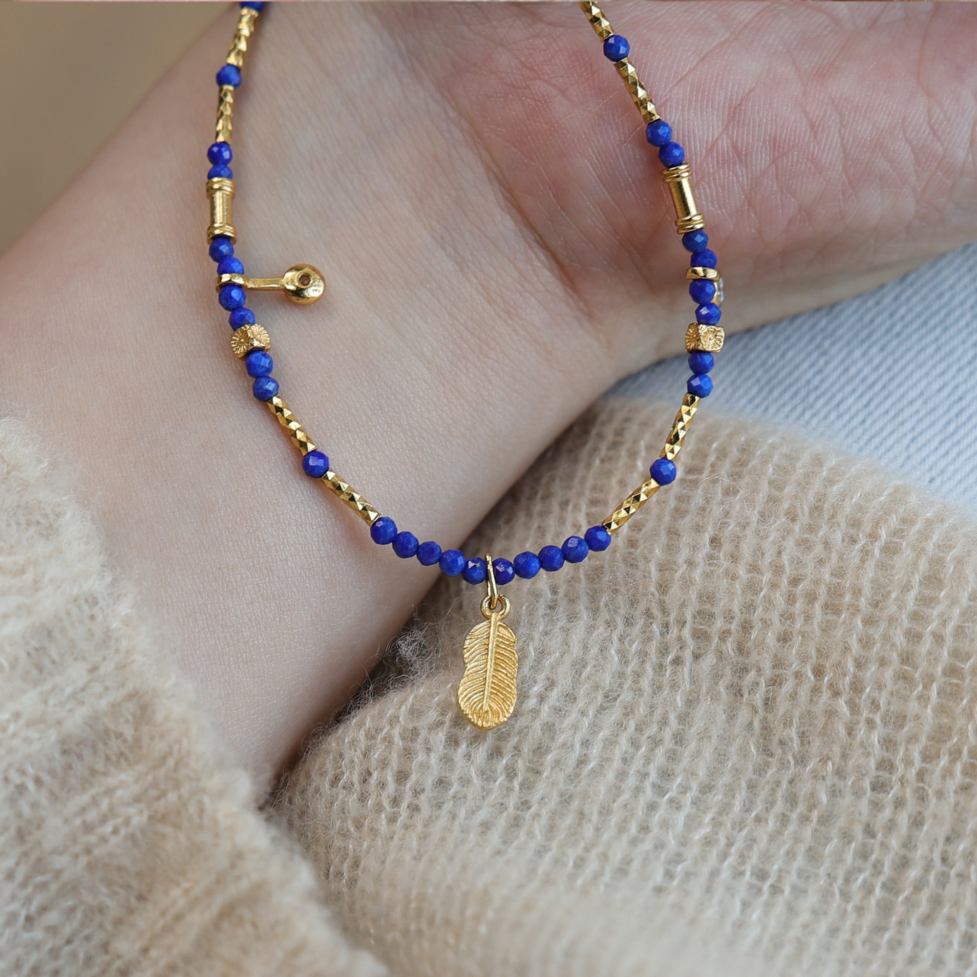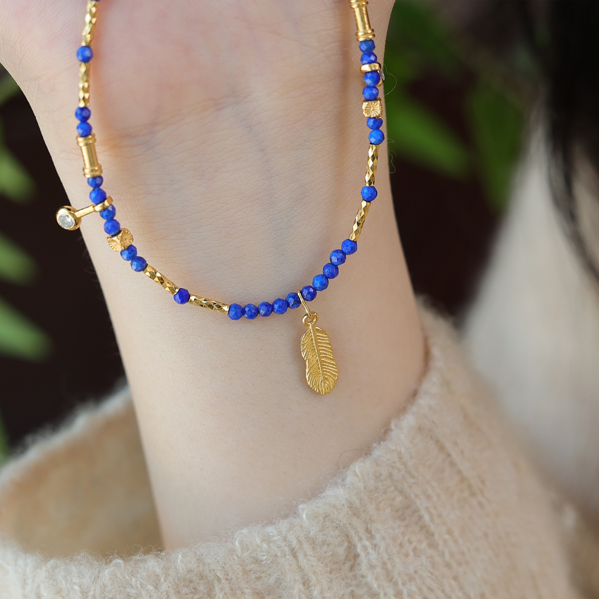 天然青金石鎖骨鍊羽毛鑲鑽2mm小米珠項鍊顯白氣質新中式小衆國風