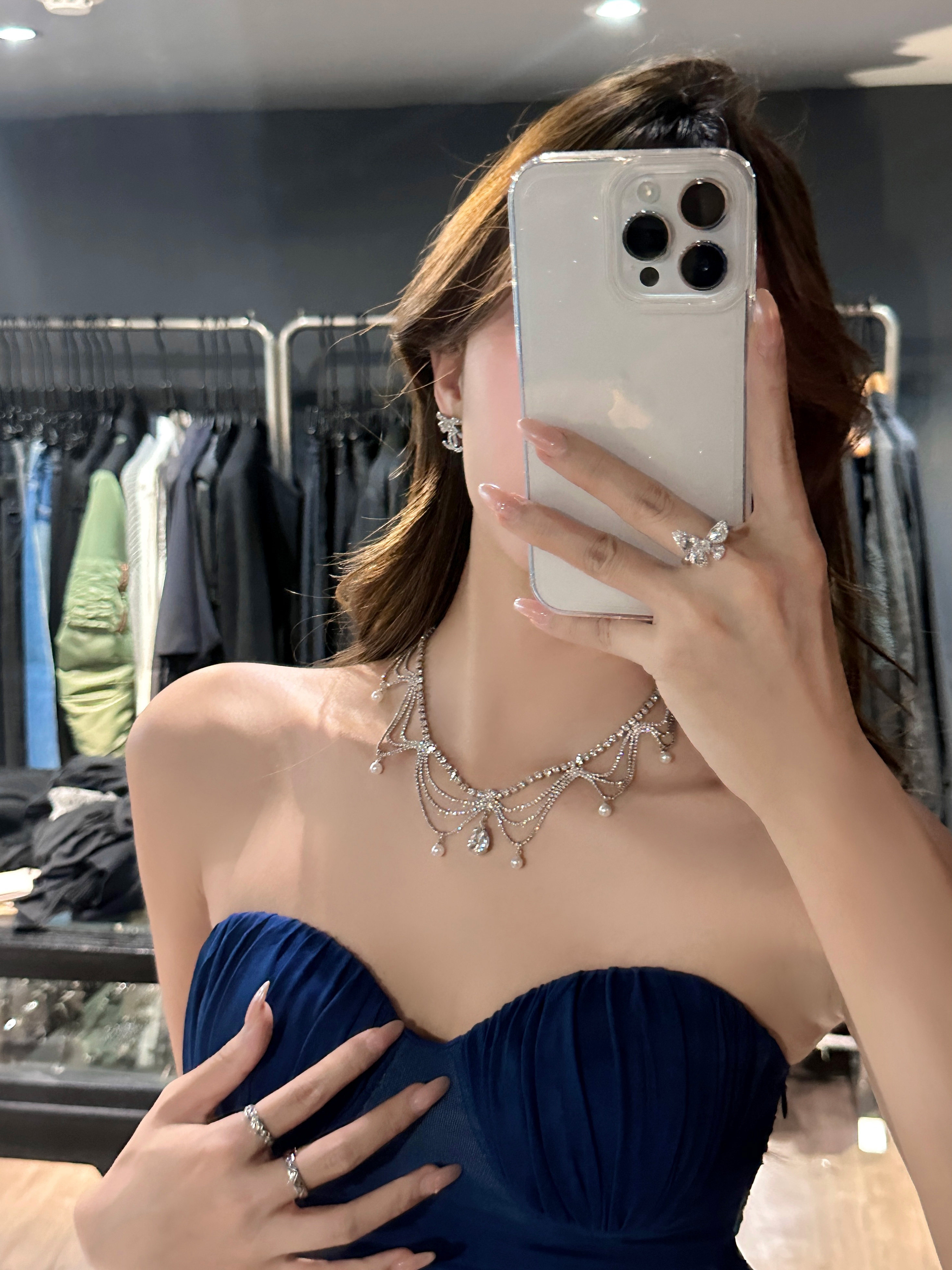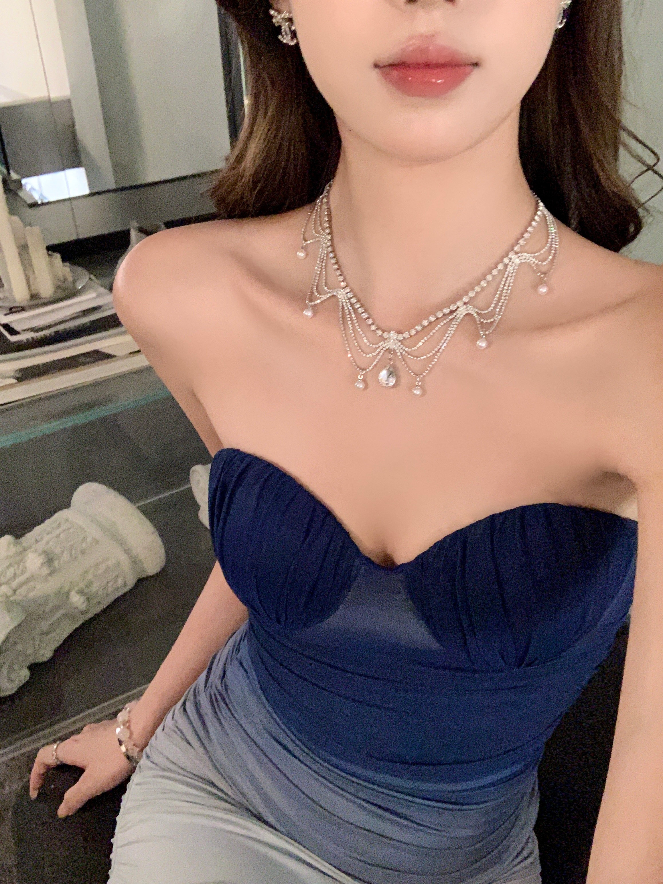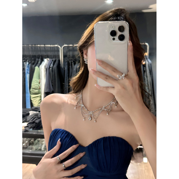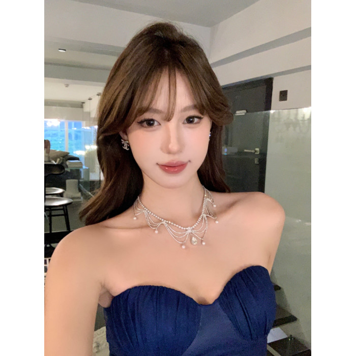 【蜜桃茶】晚宴公主 銀色水滴珍珠項鍊高級感宴會晚禮服頸鏈配飾