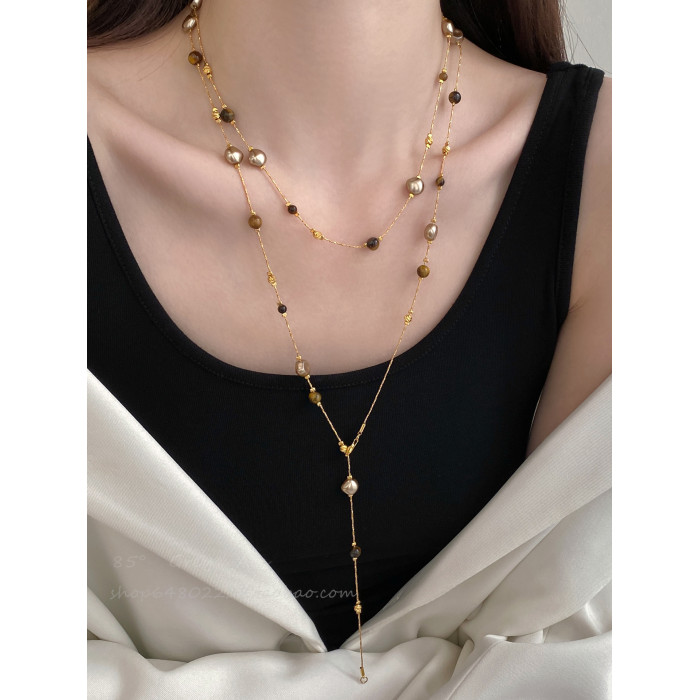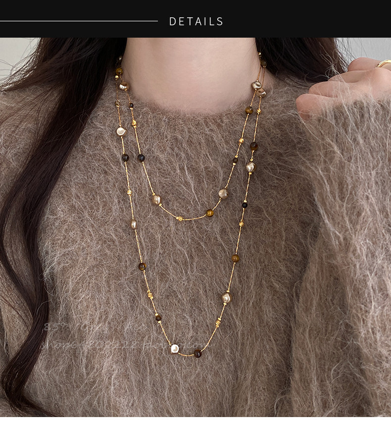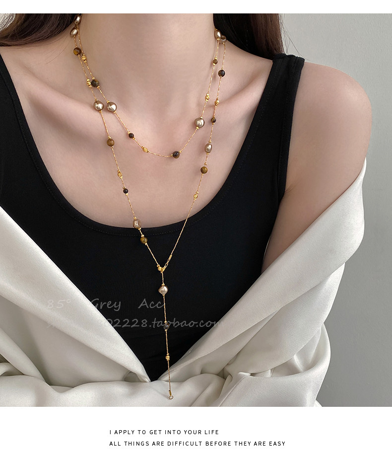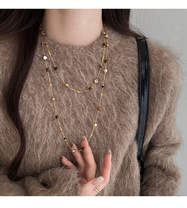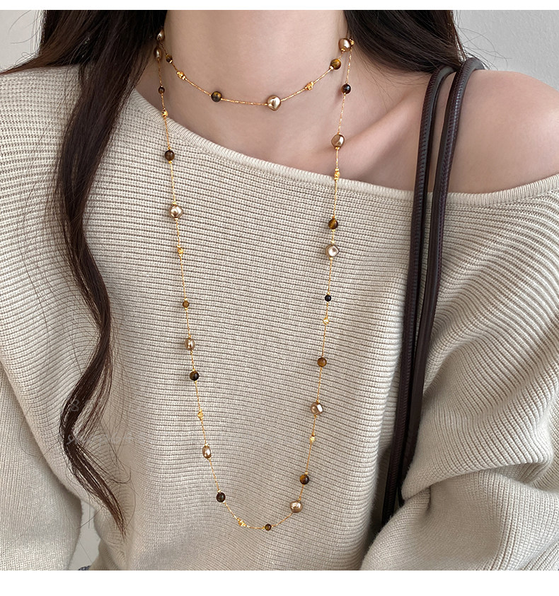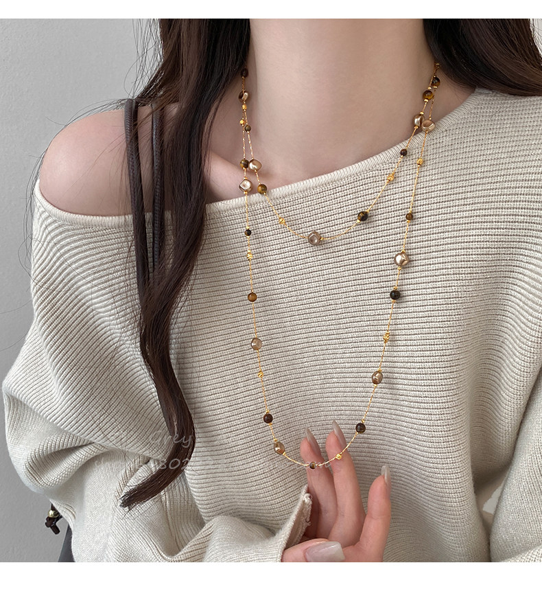 美拉德虎眼石珍珠項鍊女秋冬季2025爆款百搭輕奢高級感長款毛衣鏈