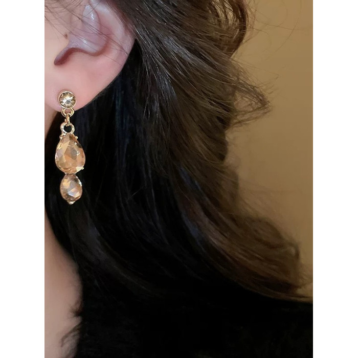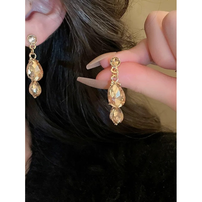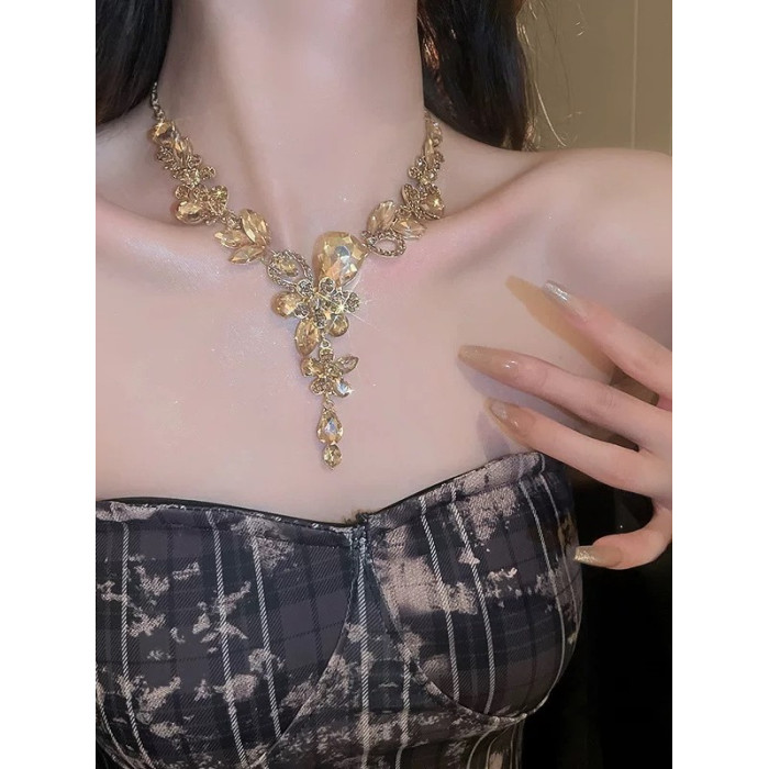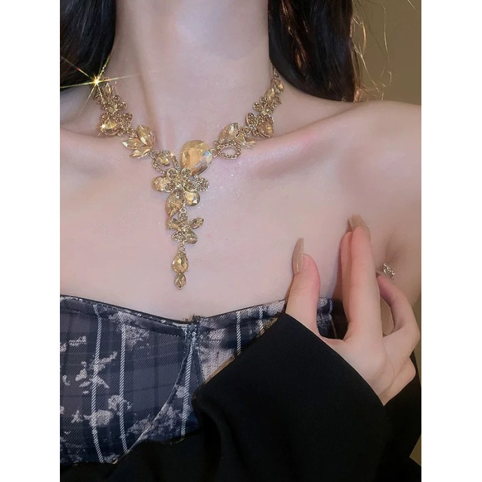 香檳色水滴花朵項鍊耳環套裝晚禮服鎖骨鍊高級感輕奢小衆新娘配飾