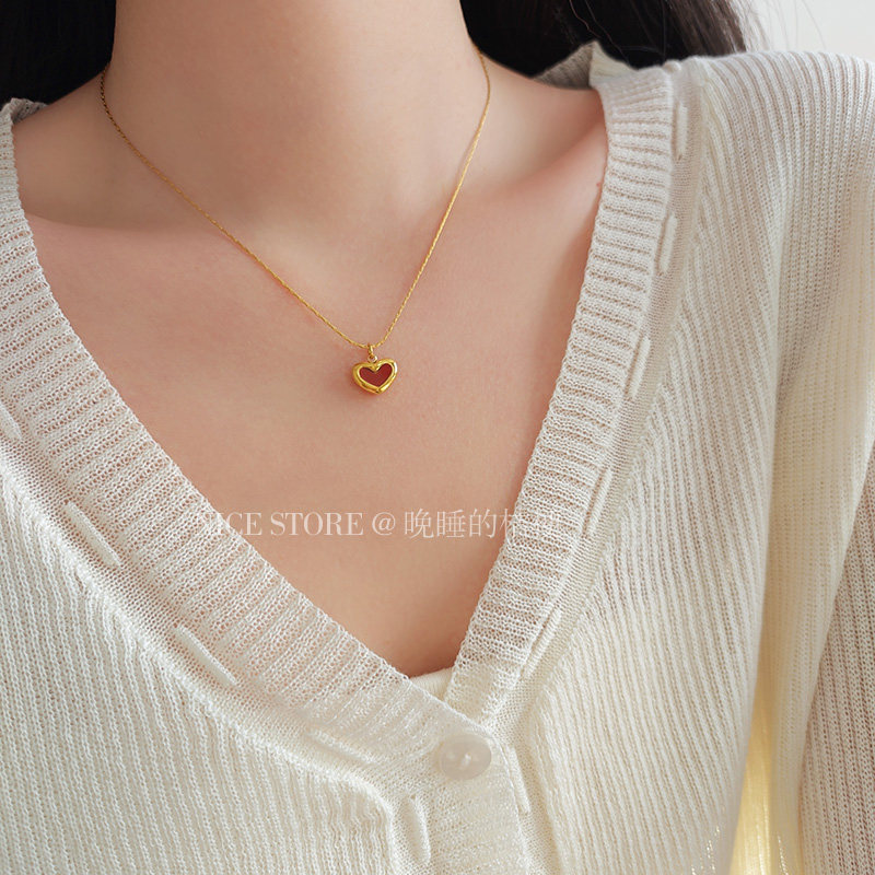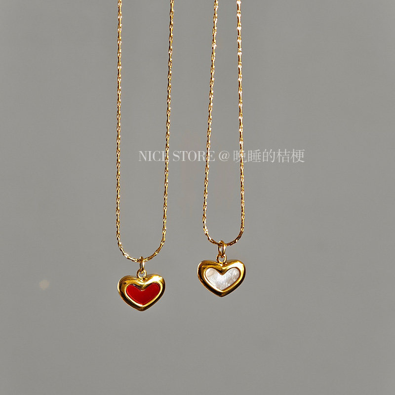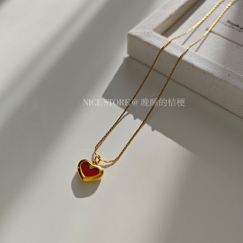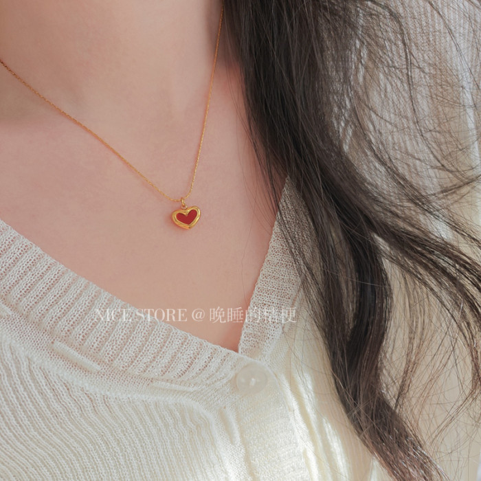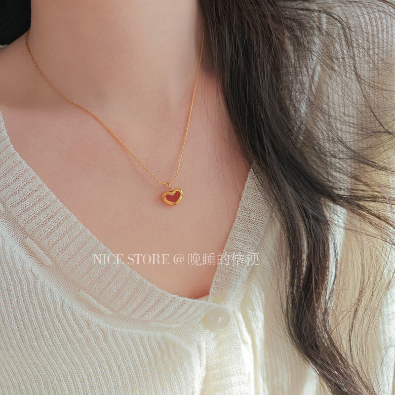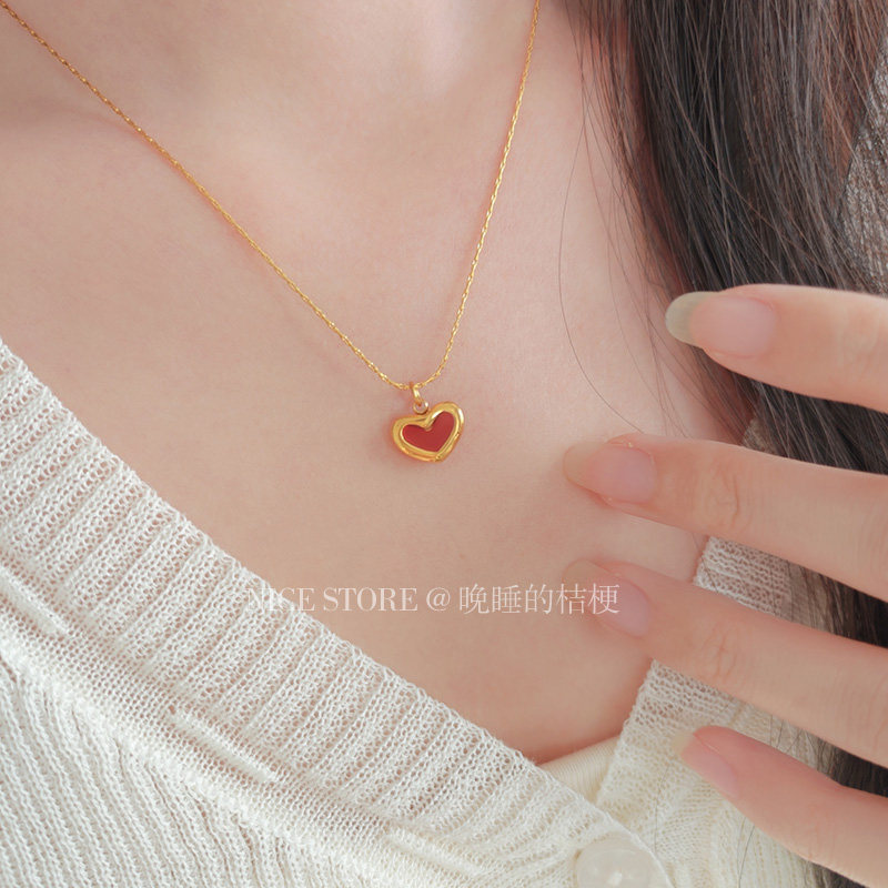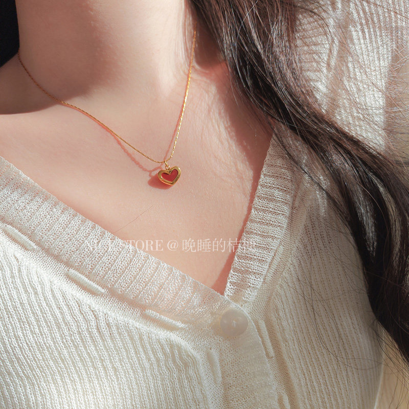 晚睡的桔梗「復興戀詩」日韓紅色愛心吊墜鈦鋼項鍊雙面桃心鎖骨鍊