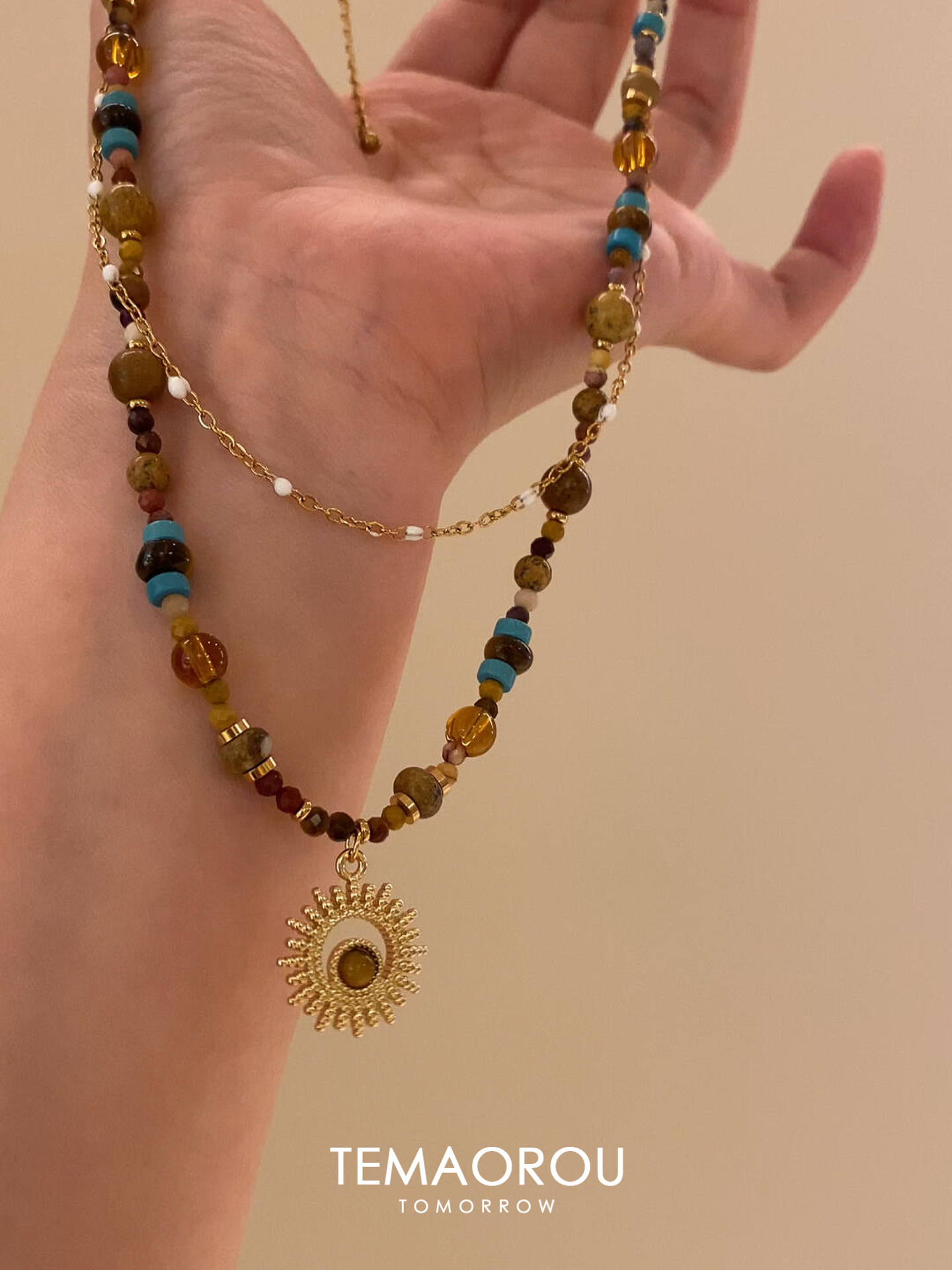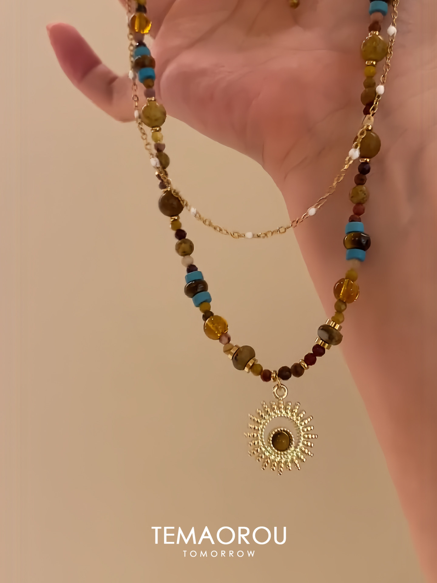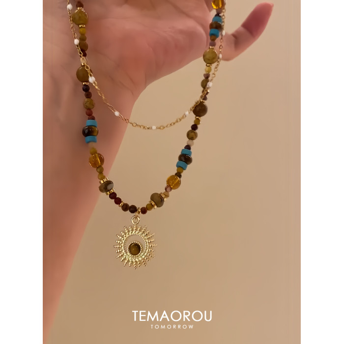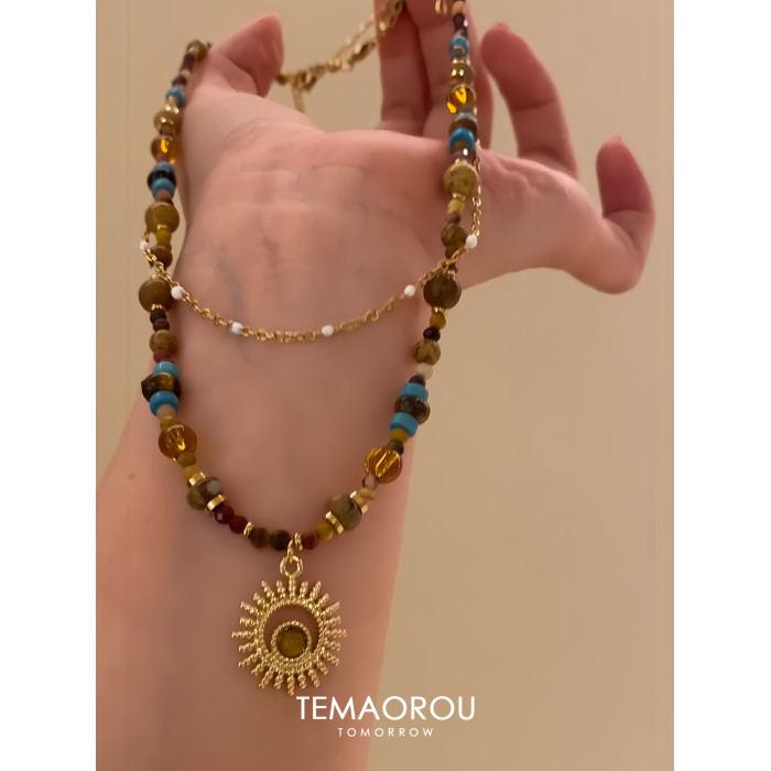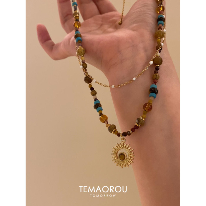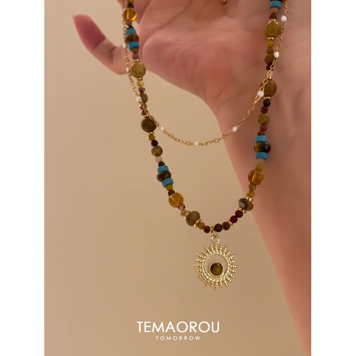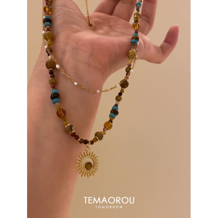 雙層曡戴vintgaer中古天然石虎眼石太陽花吊墜鎖骨鍊毛衣鏈項鍊女