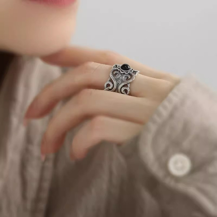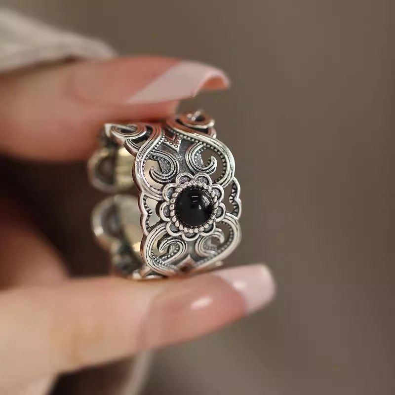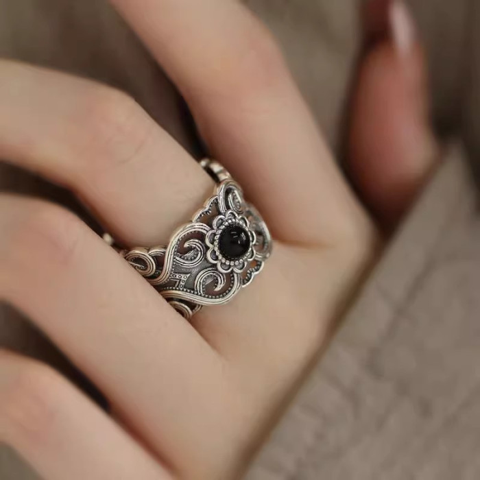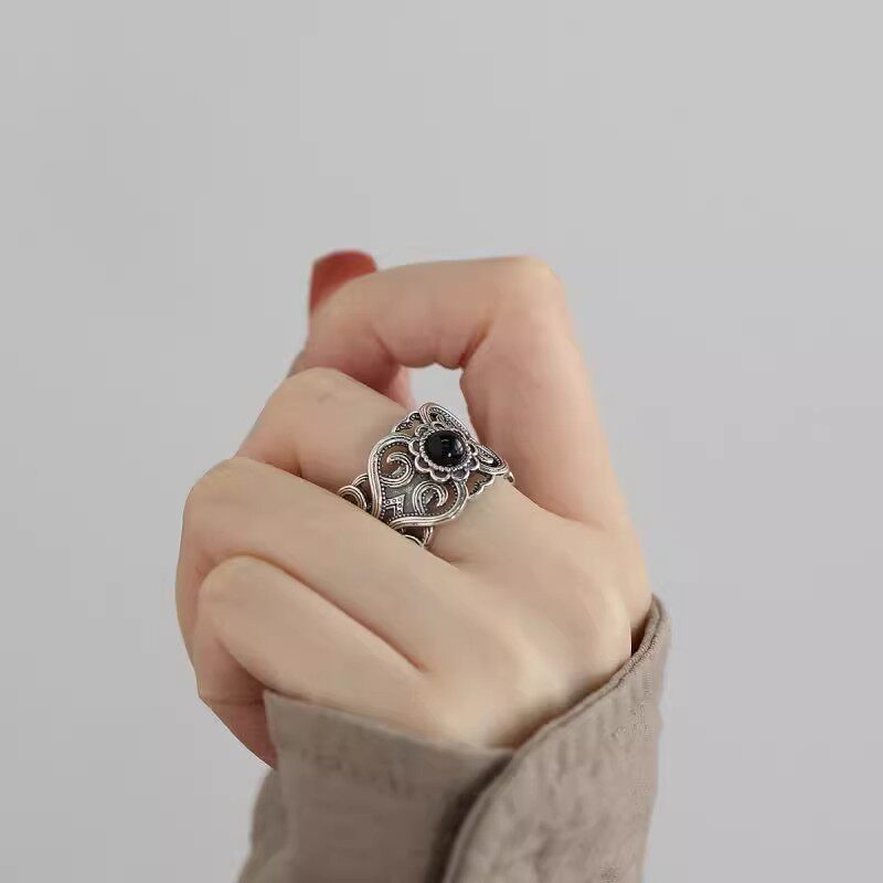 925銀復古新中式花雕紋理黑瑪瑙戒指環鏤空開口調節小衆設計高級