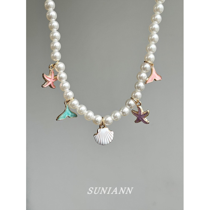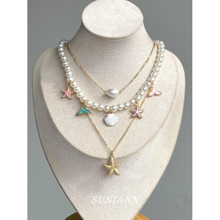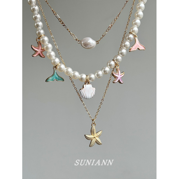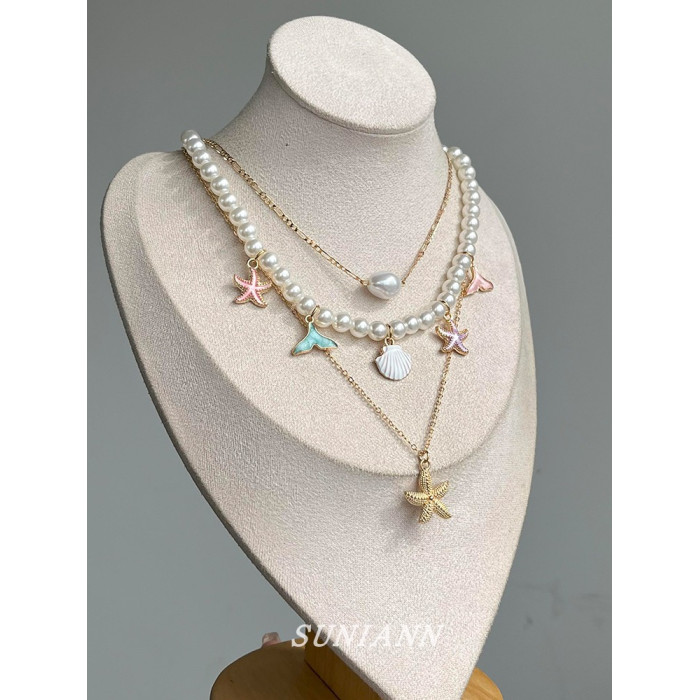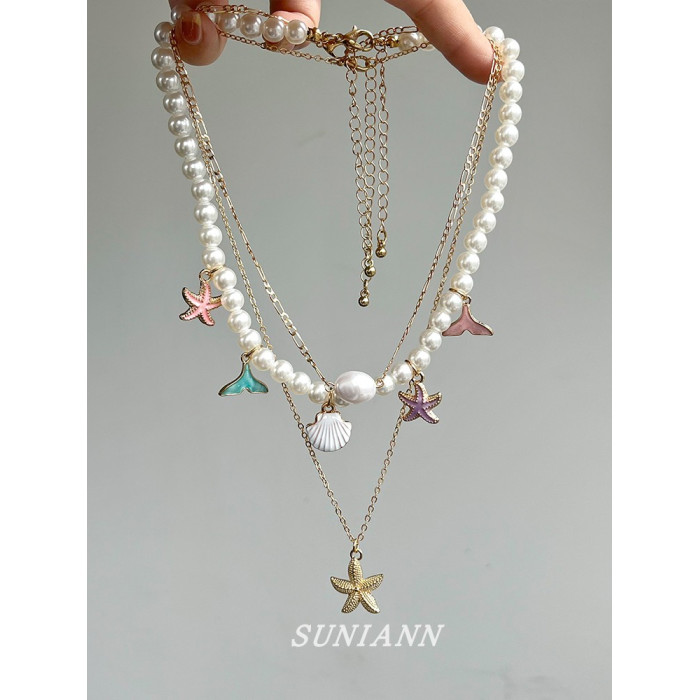 波西米亞風貝殼海星珍珠項鍊女輕奢高級感多層鎖骨鍊海邊度假配飾