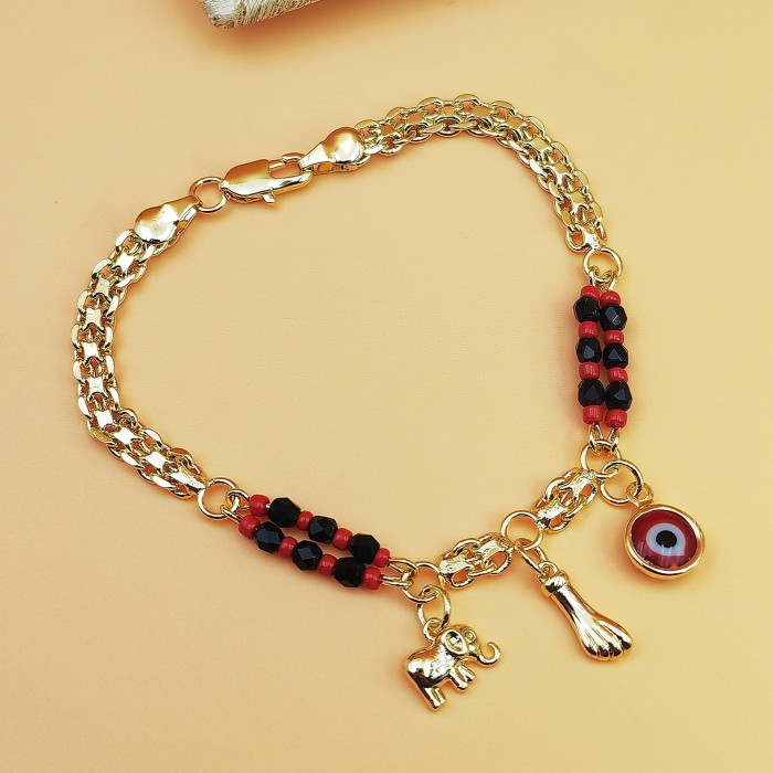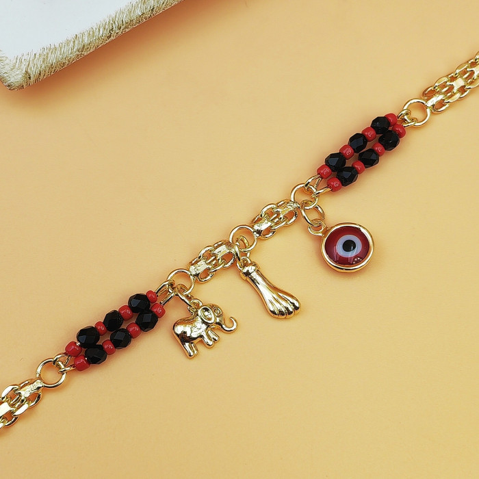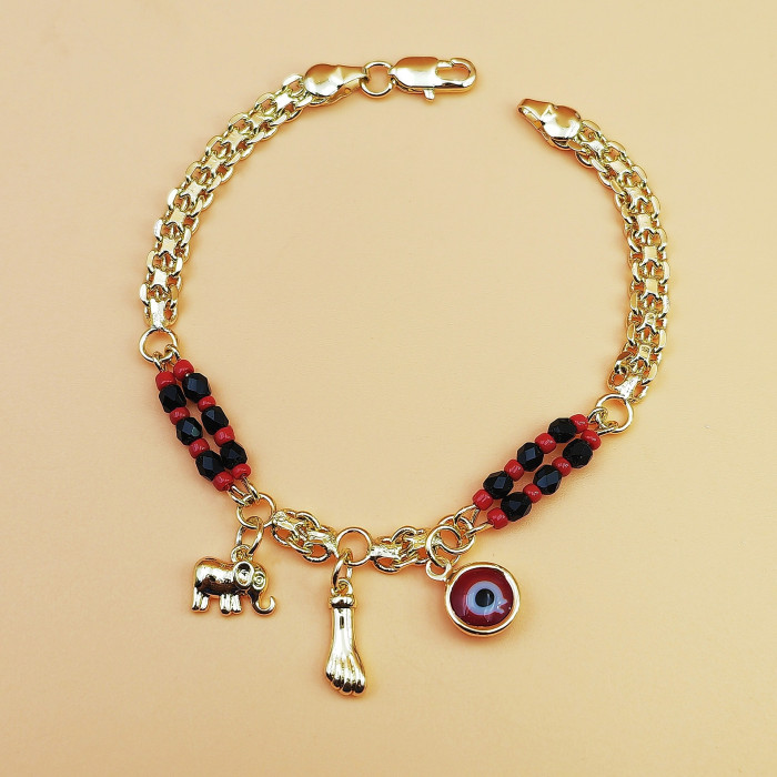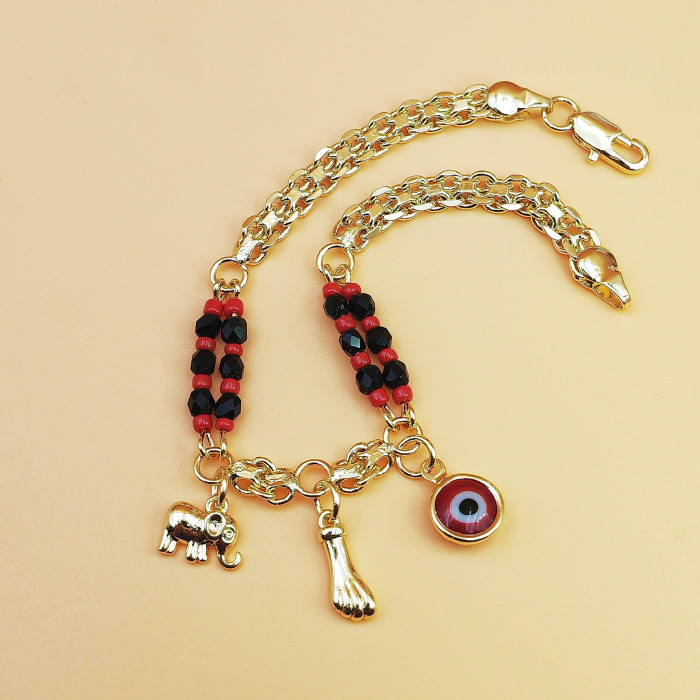 款波西米亞風格 紅黑串珠 惡魔之眼小象手鏈 銅鍍14K金