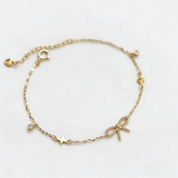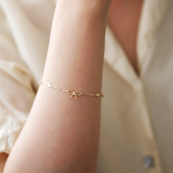 S925純銀鍍14K金麻花蝴蝶結手鏈女 四葉草簡約文藝氣質ins風手飾