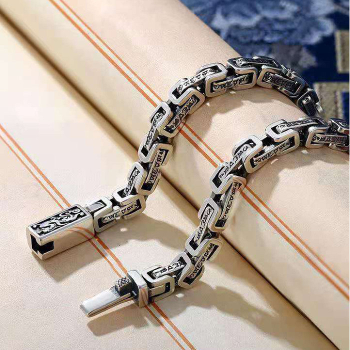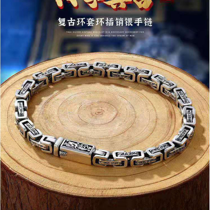 漢風龍紋六字真言環套環銀手鏈男潮流復古潮人嘻哈個性爆款