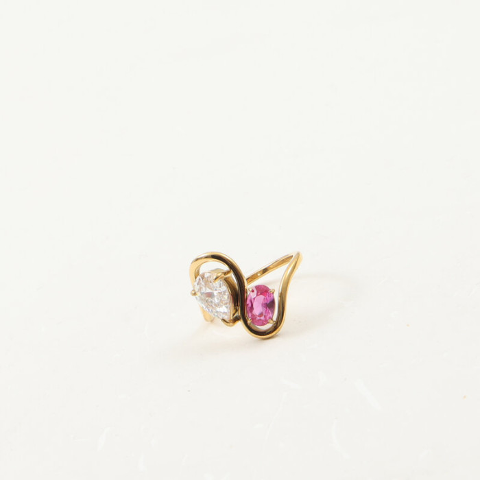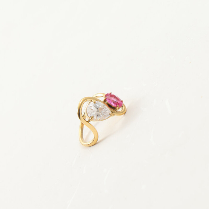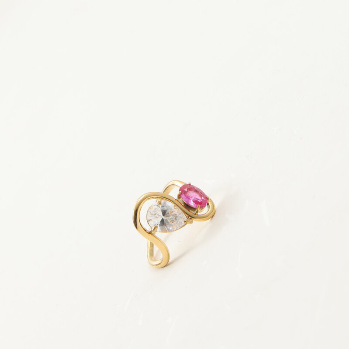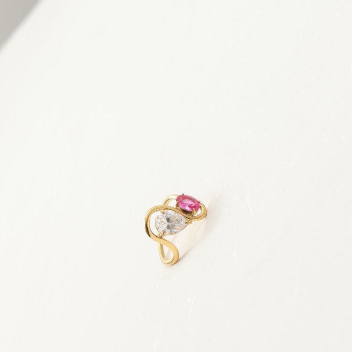 白色水滴鋯石 紅色橢圓鋯石 拼接 戒指 鈦鋼電鍍18k金
