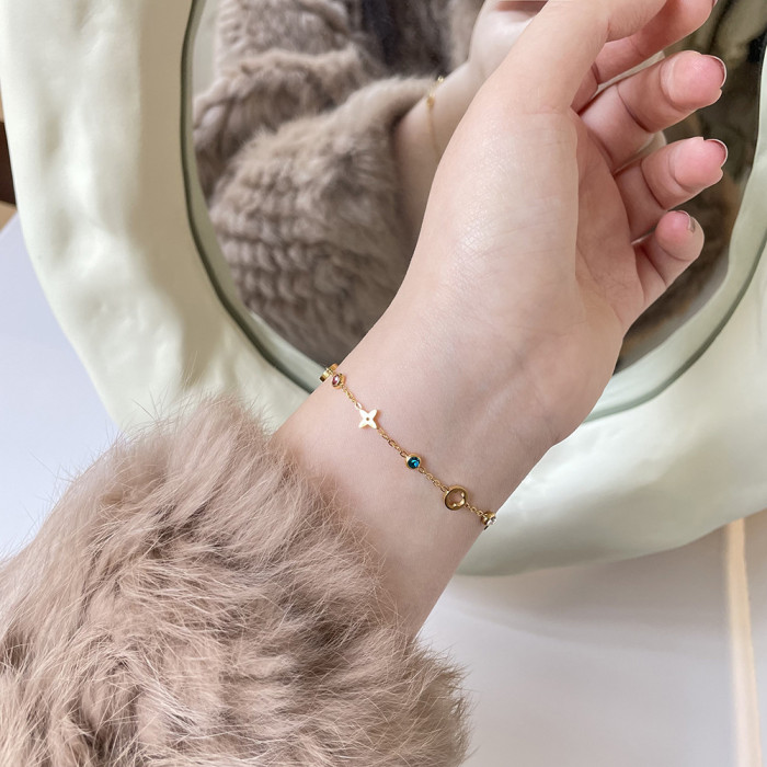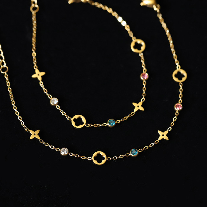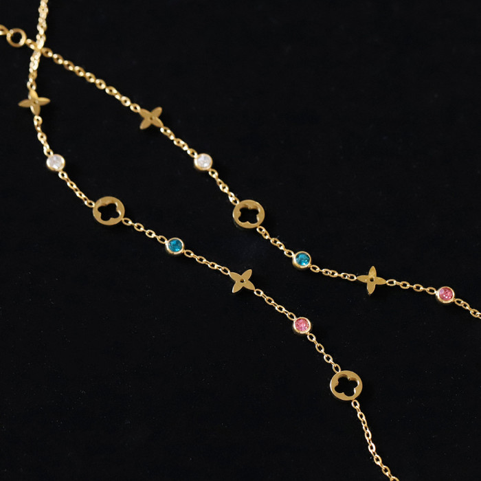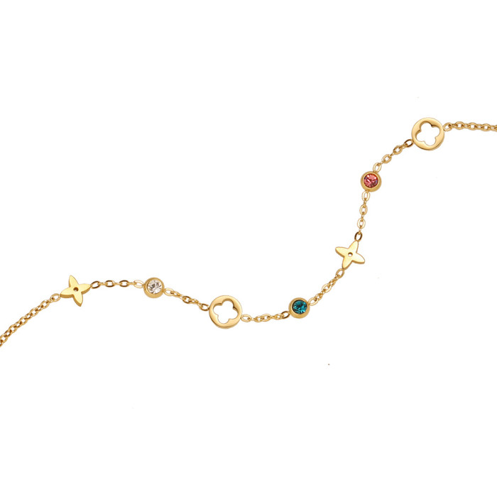 SL106 老錢風彩鑽四葉花 輕奢鏤空花朵唯美手鏈 鈦鋼鍍18K金